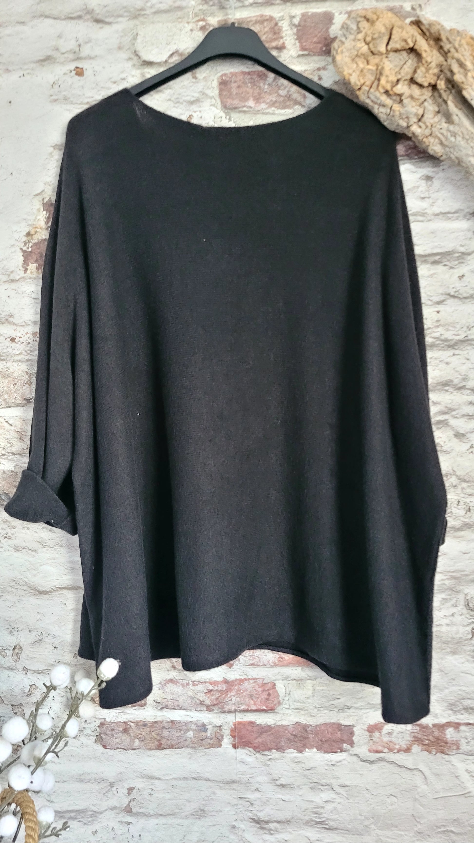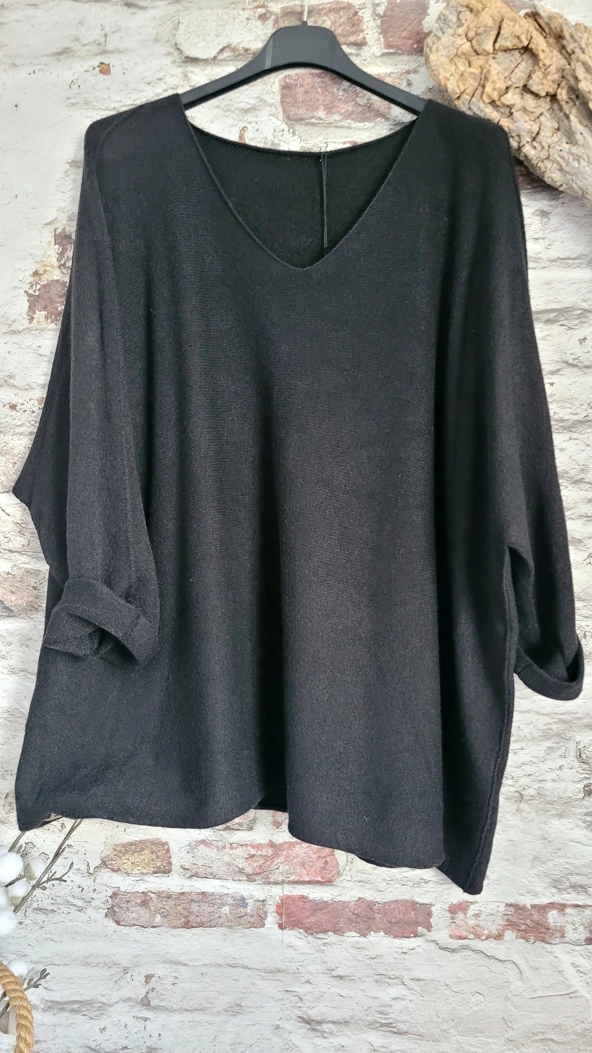 Adoptez le confort absolu avec ce pull oversize d'un élégant noir . Sa coupe ample et décontractée et son col en V flatteur en font un essentiel facile à porter. Les revers de manches ajoutent une touche chic. Parfait avec un jean pour un look tendance.