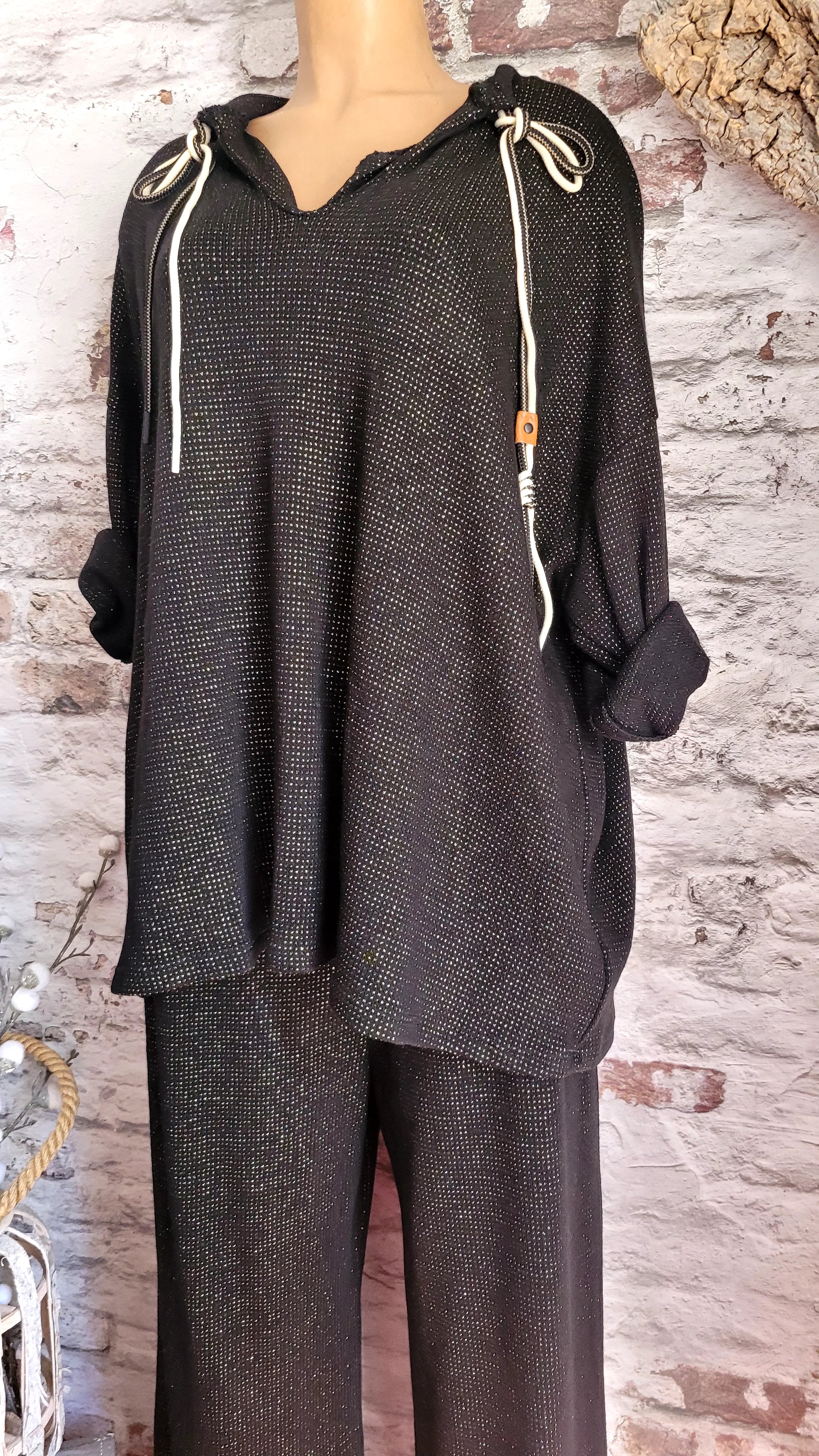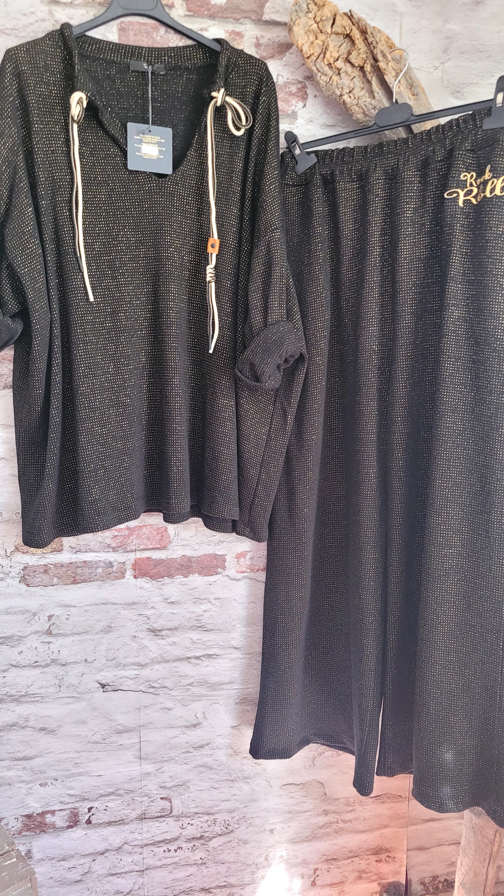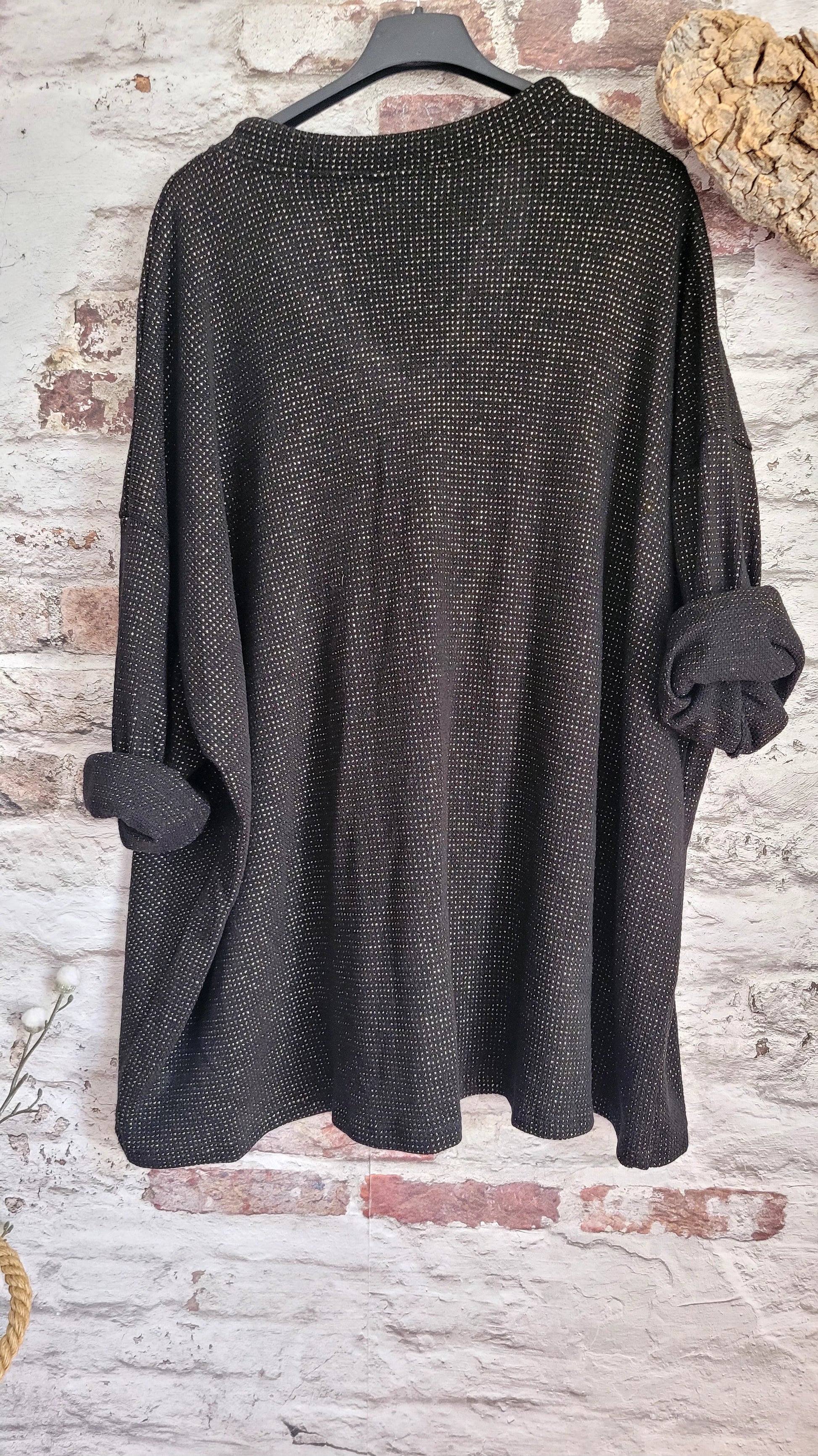 💋 Pull ample et scintillant en maille noire et dorée, avec un col en V . La coupe est décontractée avec des manches larges qui peuvent être remontées. Parfait pour un look chic et confortable.
