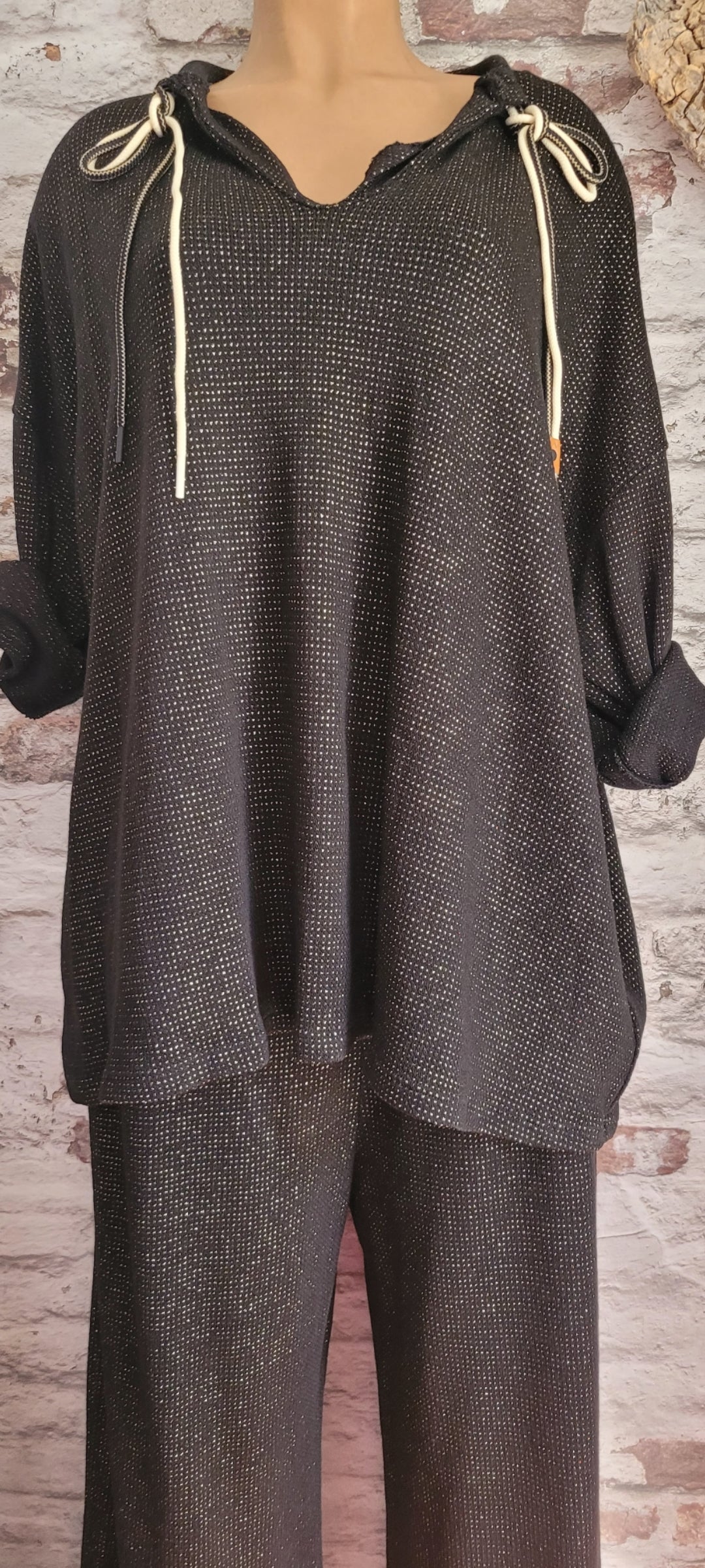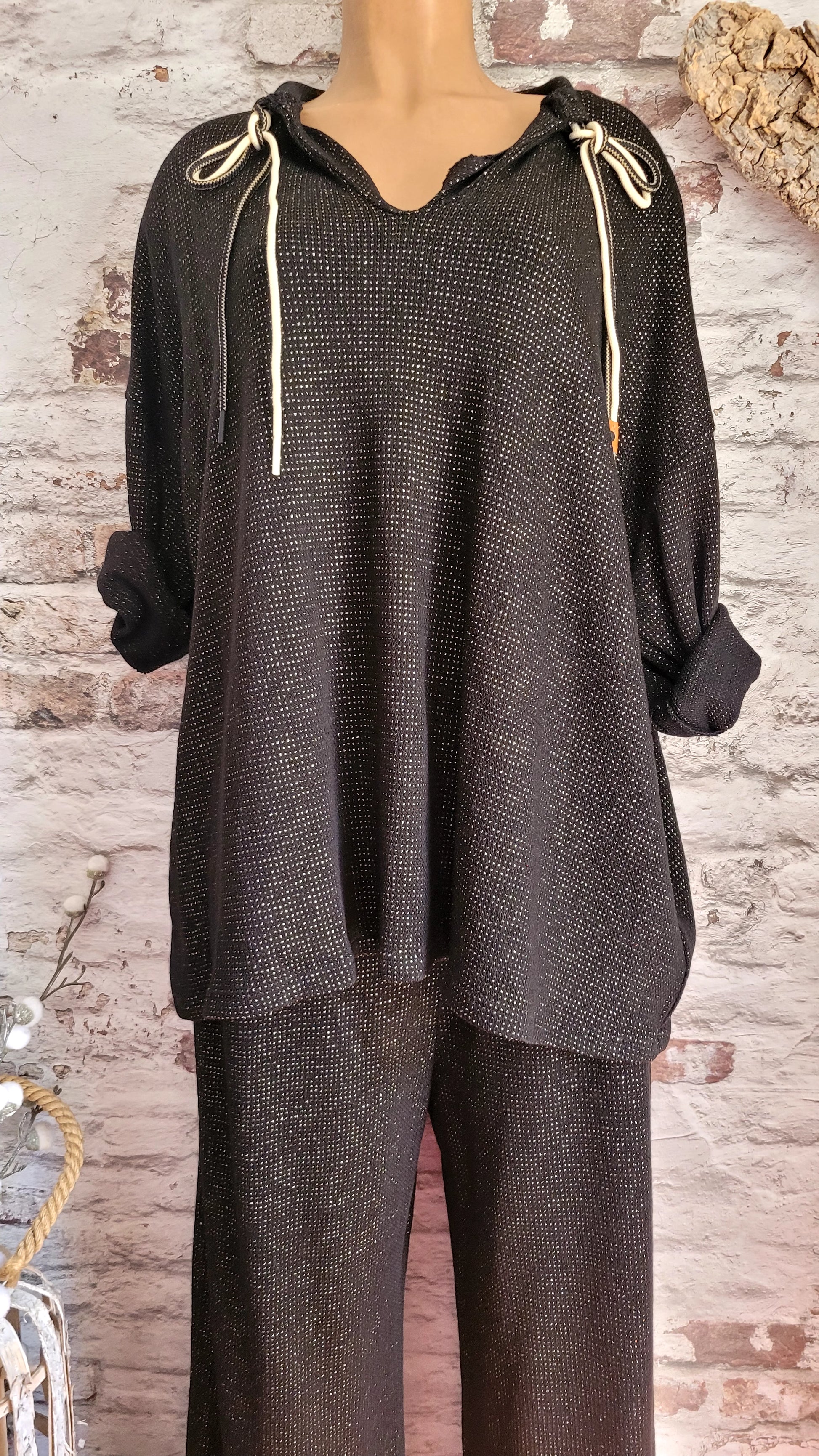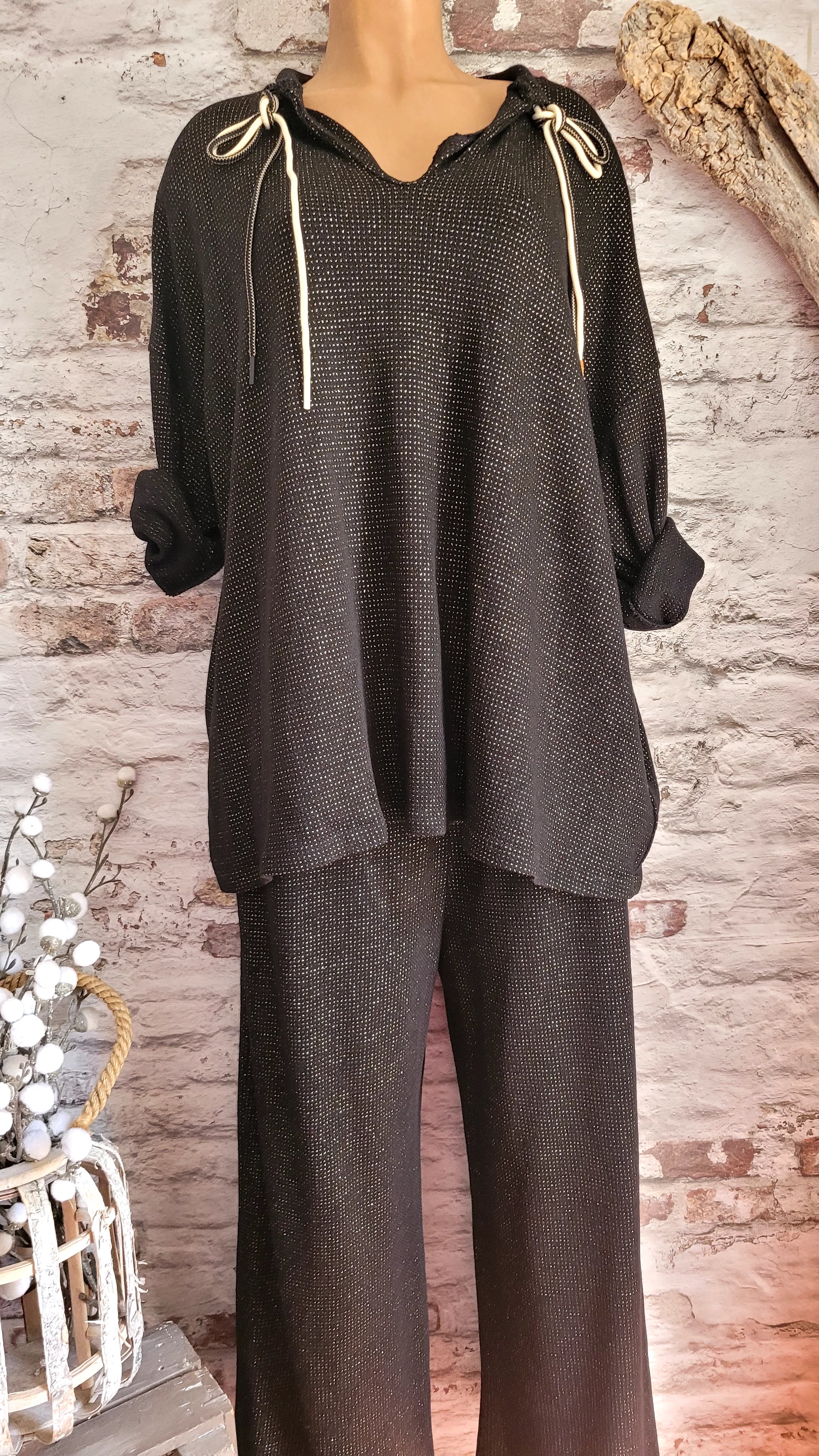 💋 Pull ample et scintillant en maille noire et dorée, avec un col en V . La coupe est décontractée avec des manches larges qui peuvent être remontées. Parfait pour un look chic et confortable.
