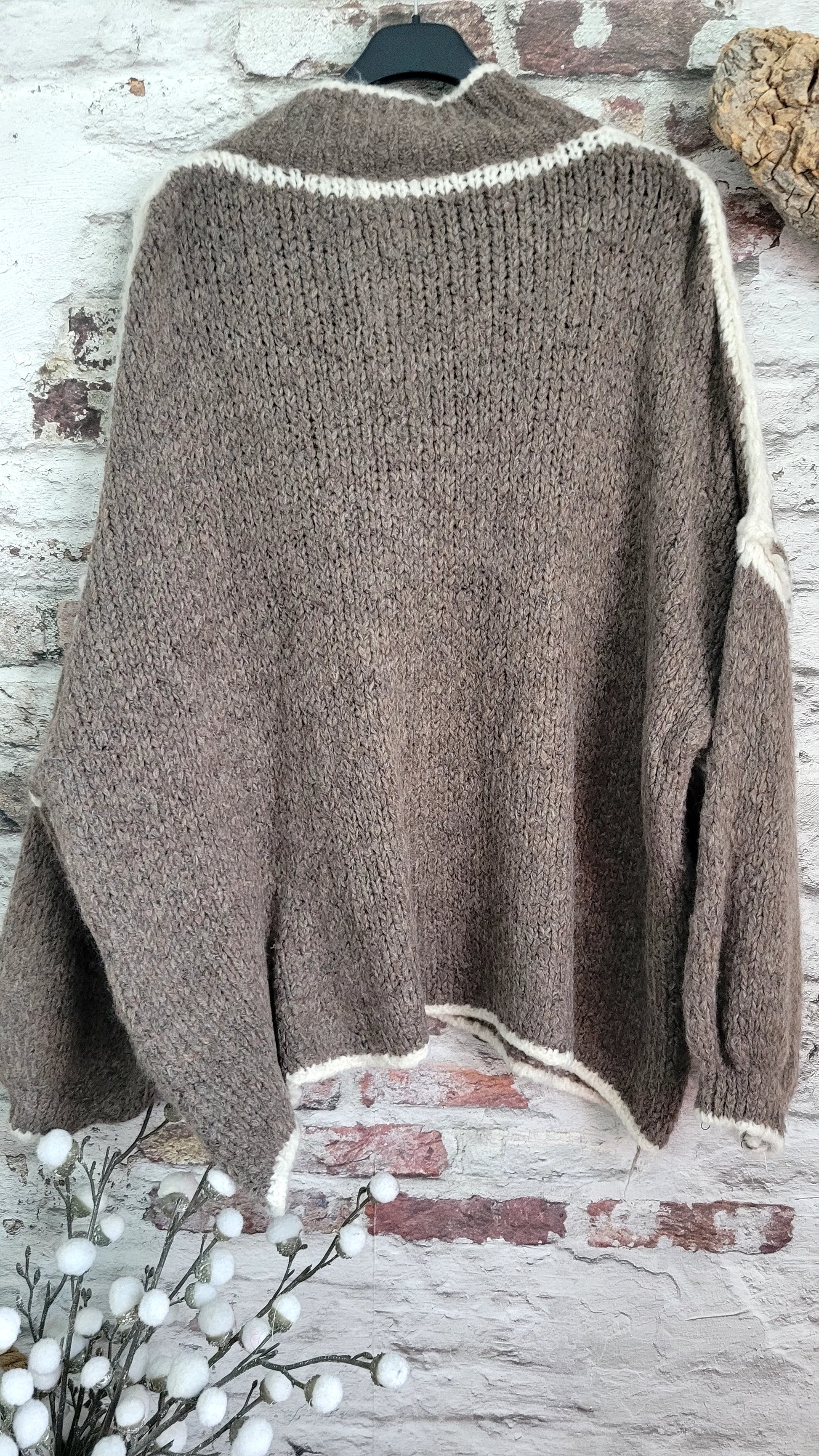 ​Cardigan ample, de couleur brun /taupe, caractérisé par des bordures contrastantes blanc cassé (col, ourlet, et manches). Il est orné de boutons ronds dorés sur le devant. La coupe est bouffante et confortable, avec une maille épaisse et texturée, idéale pour un style décontracté chic.