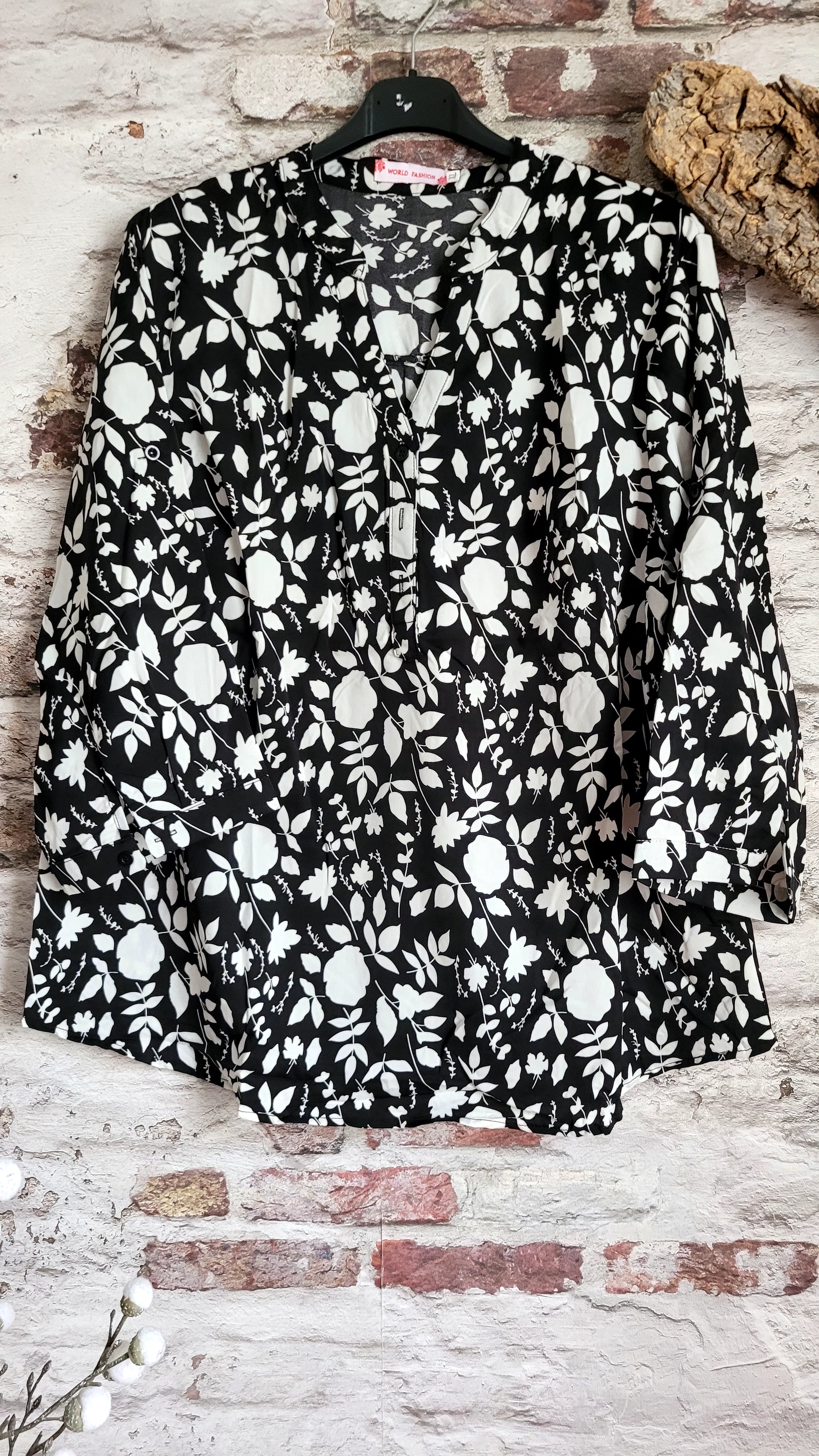 🖤 Blouse fluide à motif floral noir et blanc. Cette pièce élégante présente un contraste saisissant avec ses fleurs et feuilles blanches sur fond noir. Dotée d'un col mao et d'une patte de boutonnage sur le devant, sa coupe ample et confortable en fait un essentiel chic pour toutes les occasions.
