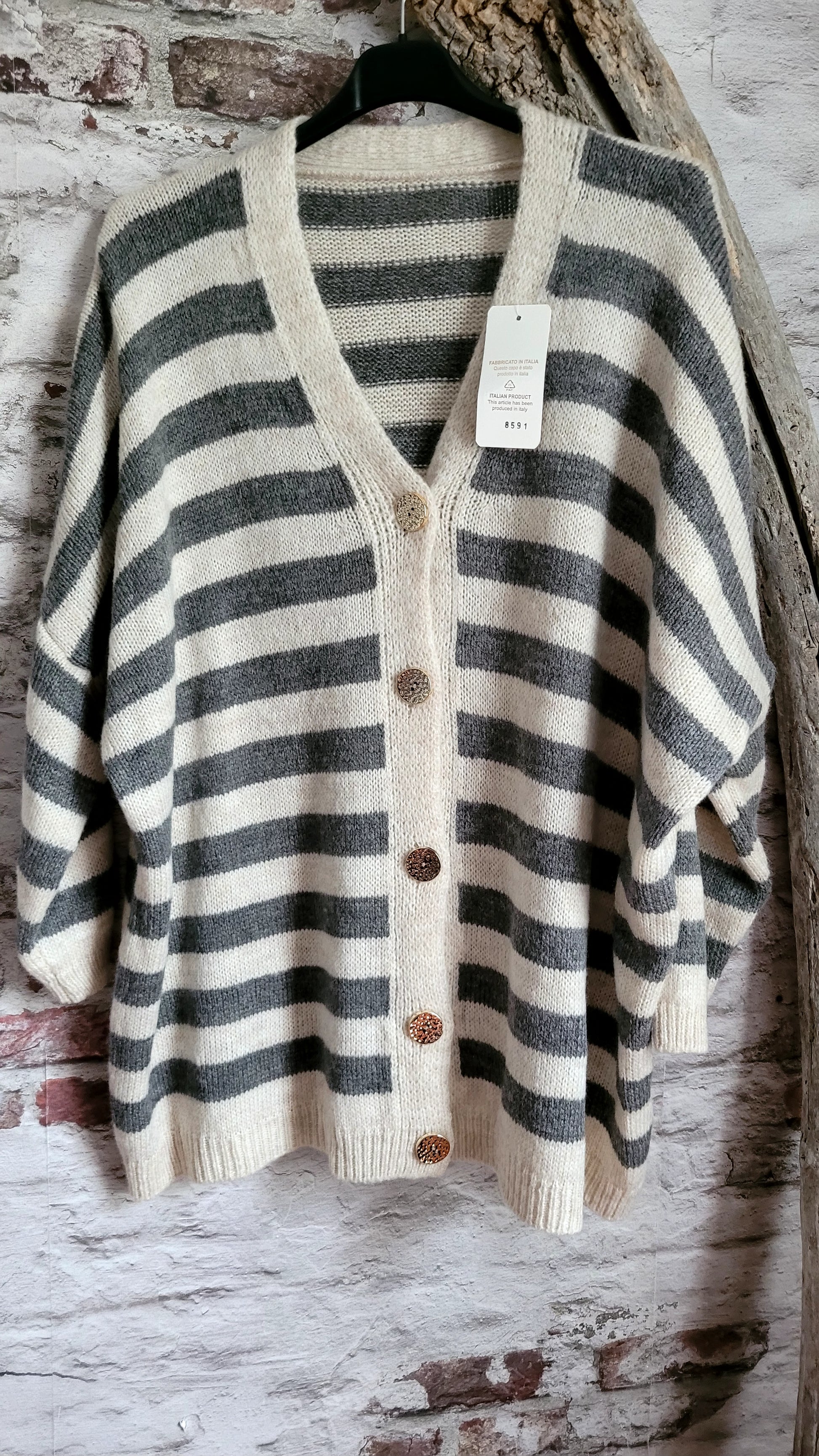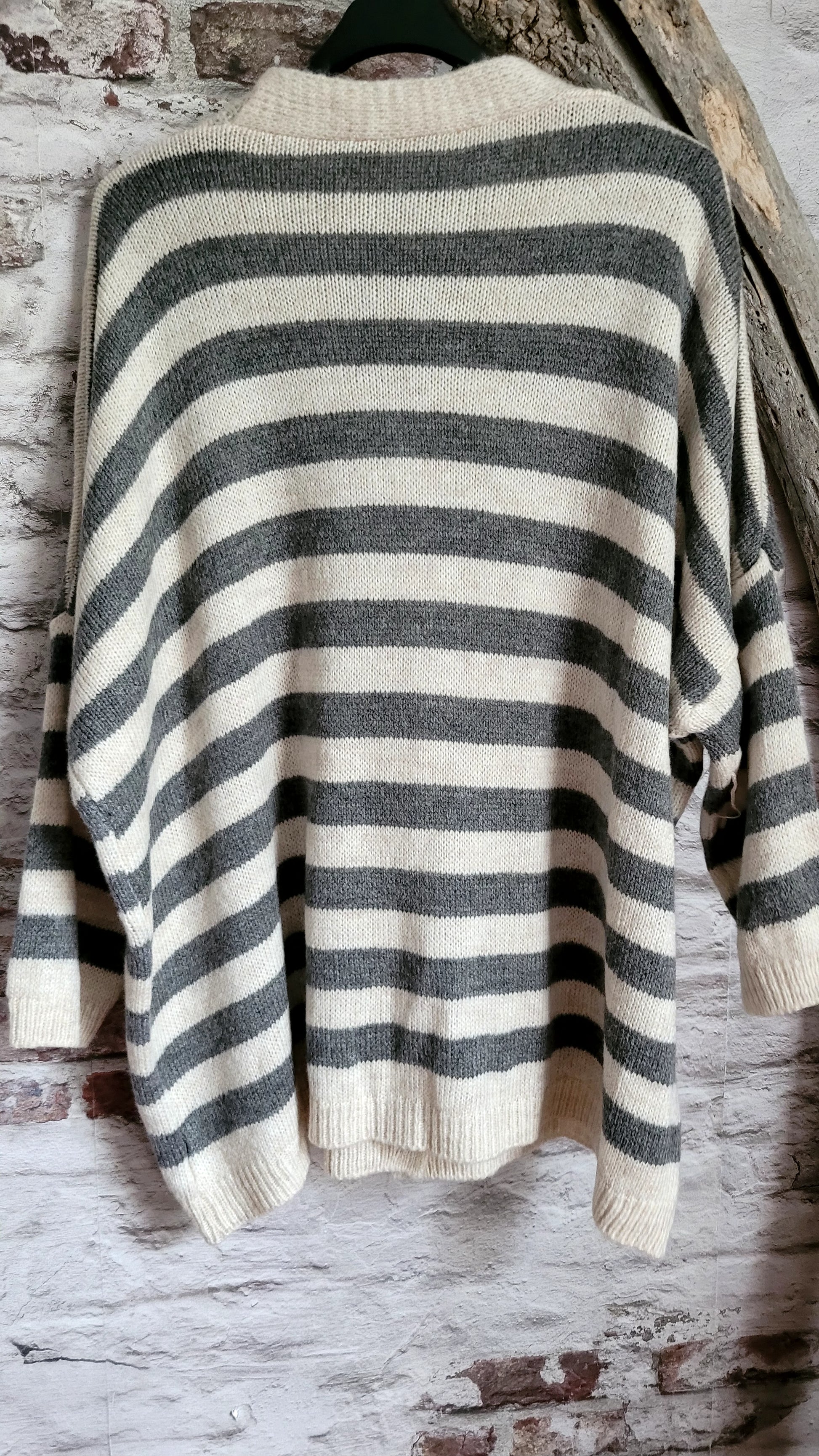 gilet en maille à rayures. Avec sa coupe légèrement oversize et ses rayures grises et blanc cassé , il est parfait pour un style à la fois confortable et élégant