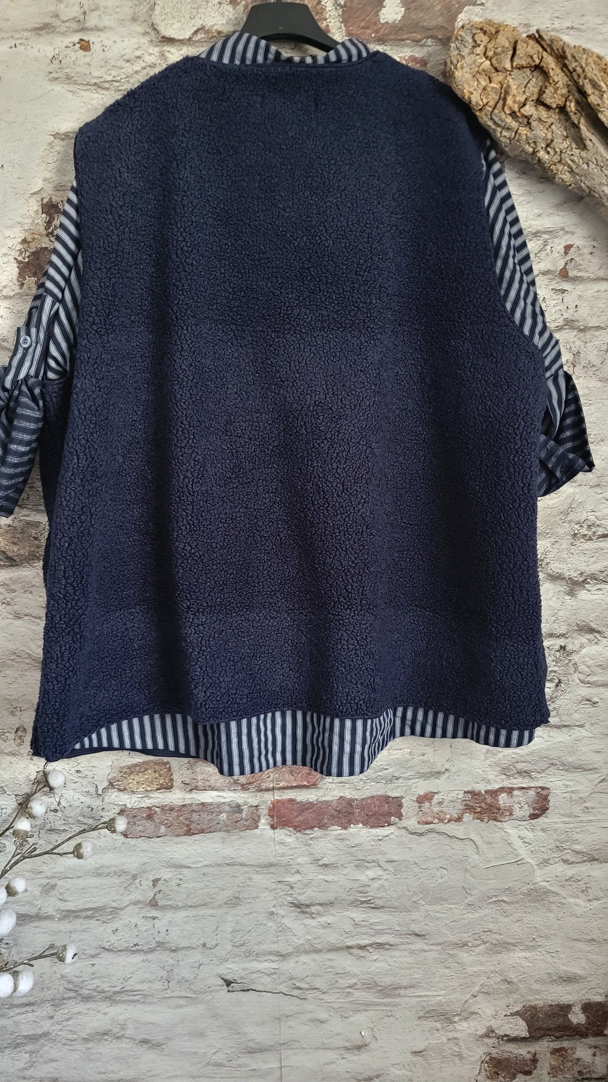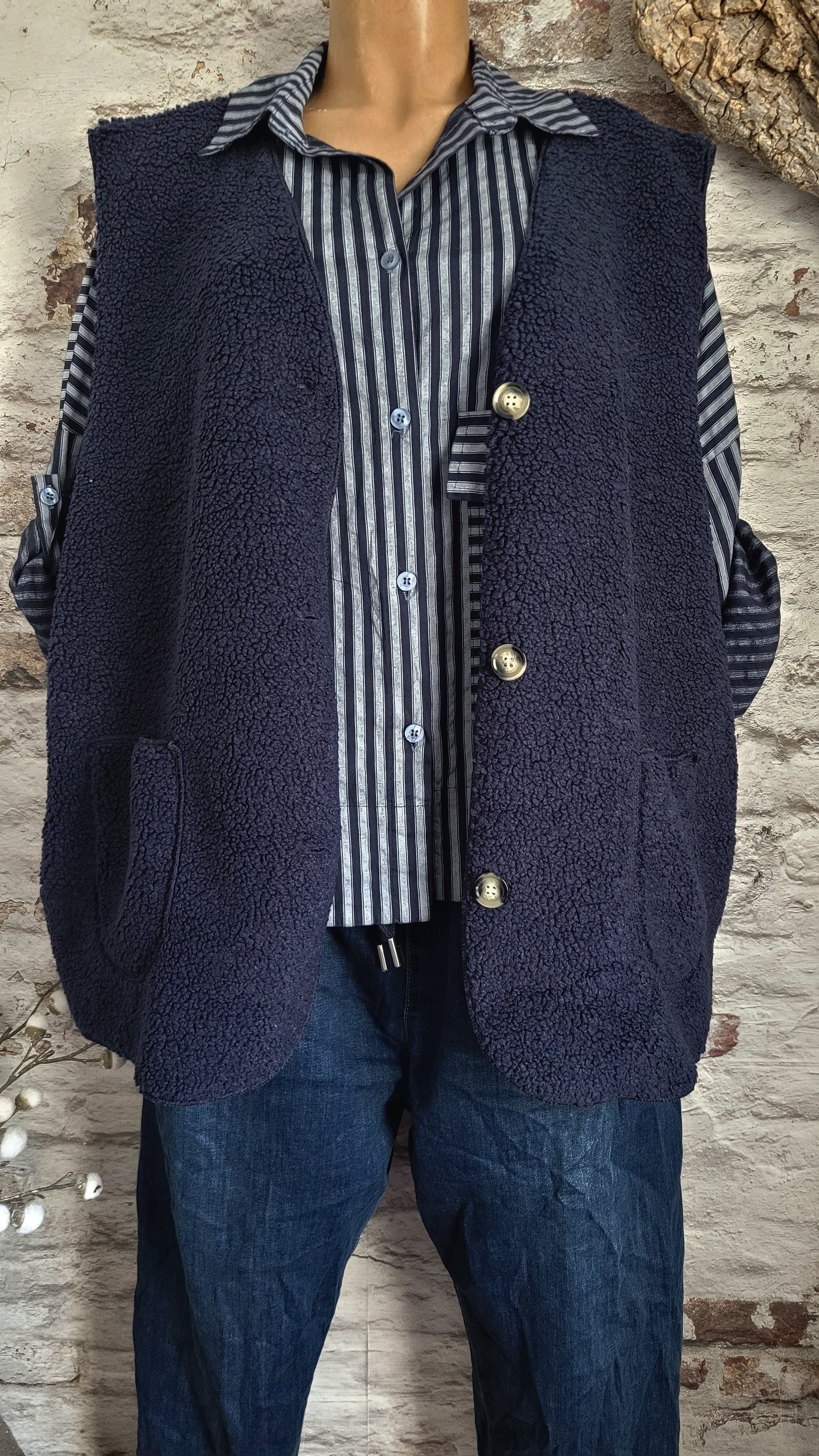 ❤️ Gilet sans manches texturé (façon moumoute) bleu marine. Pièce tendance avec col en V, fermeture à boutons et deux grandes poches plaquées. Idéal pour superposer et apporter une touche de douceur et de style décontracté chic. Made in Italy.