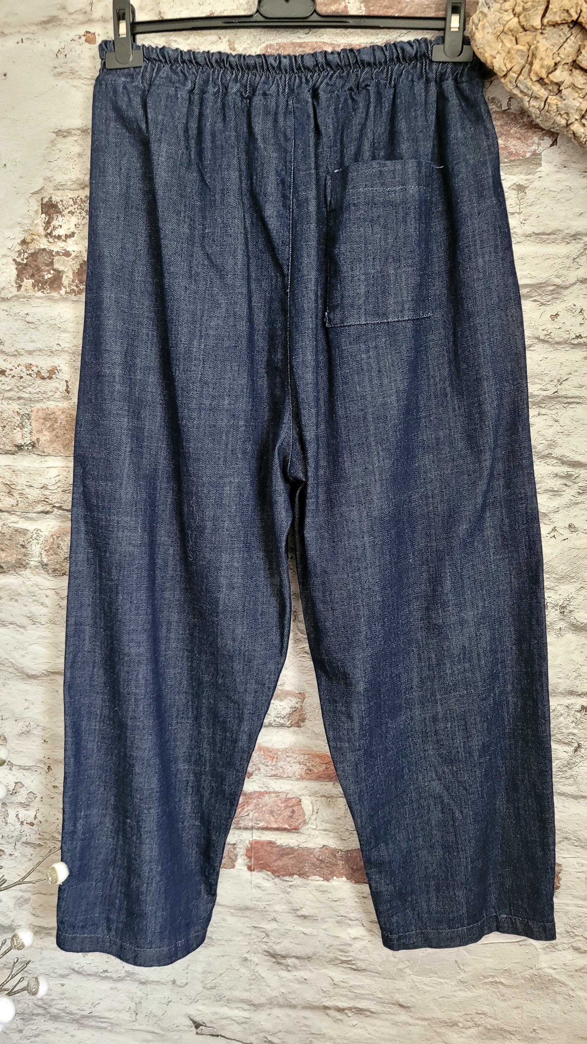 Découvrez notre pantalon style jean en coupe large et 7/8. Il combine l'allure intemporelle du denim foncé avec une taille élastiquée et un cordon de serrage pour un ajustement parfait. Les grandes poches avant lui confèrent une touche de caractère. Idéal pour un look casual chic sans compromis sur le bien-être."