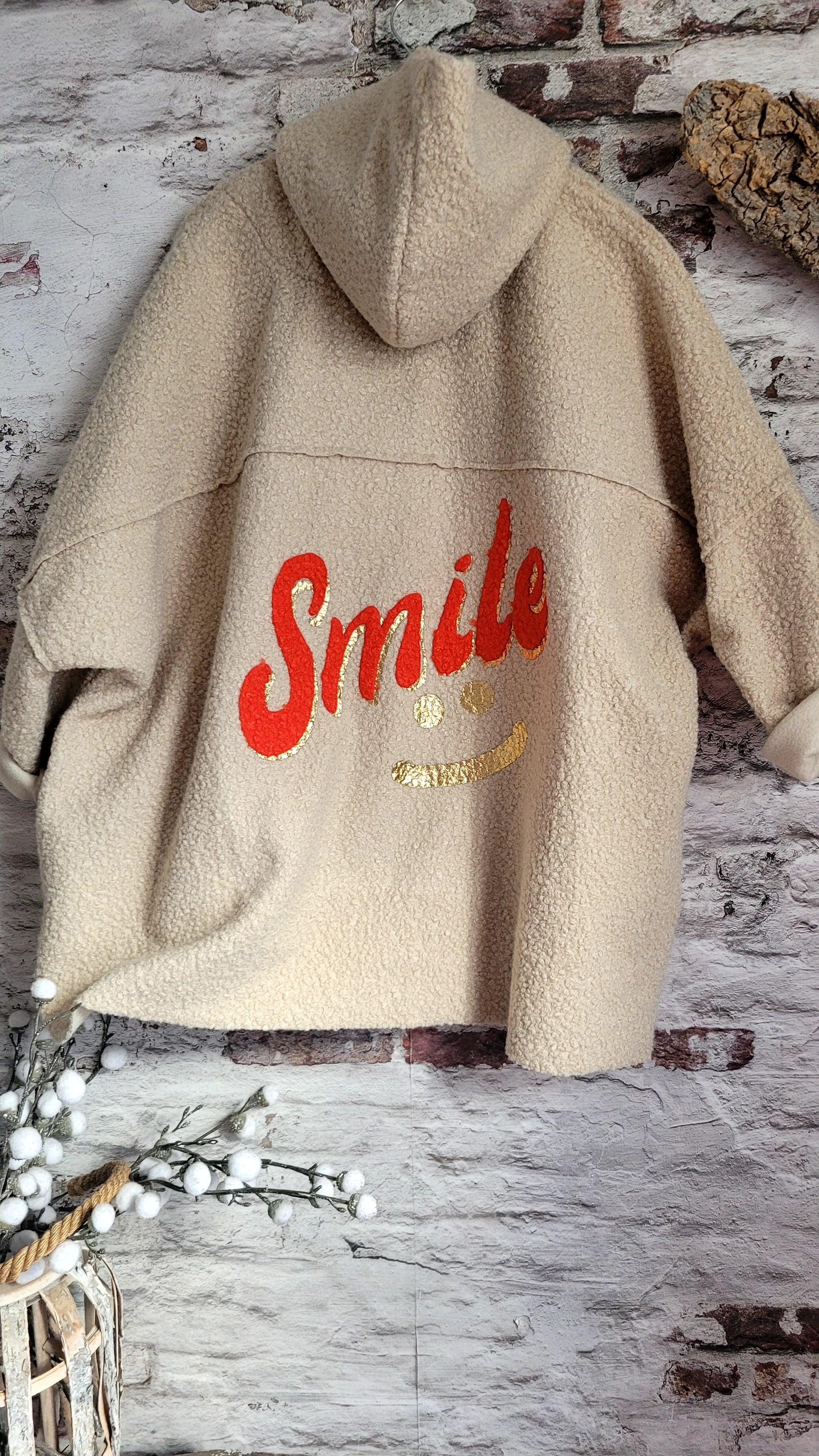 ​Craquez pour ce manteau ultra-douillet en maille bouclette beige sable. Sa coupe oversize et son message "Smile" coloré au dos en font la pièce parfaite pour rester au chaud avec style.