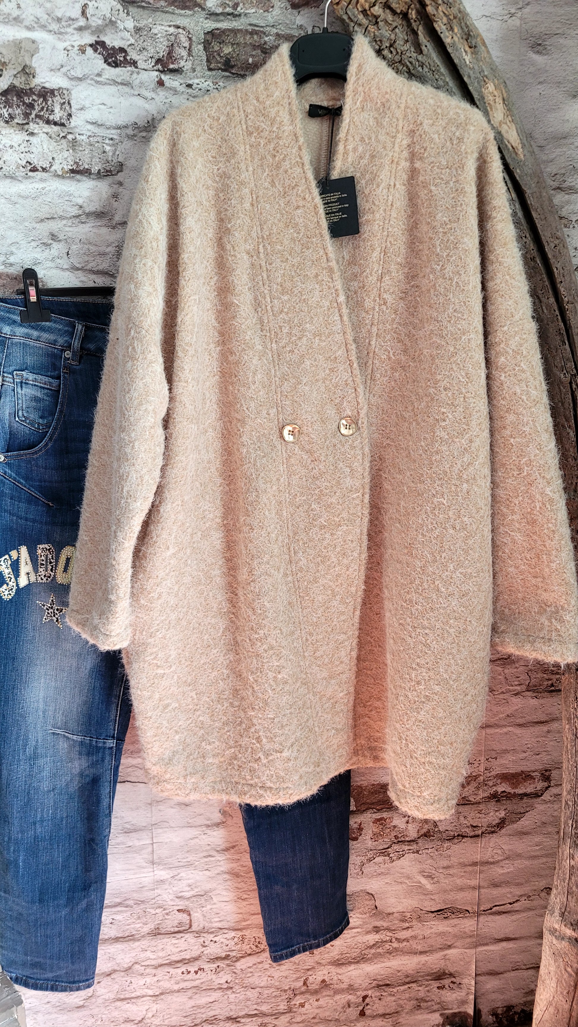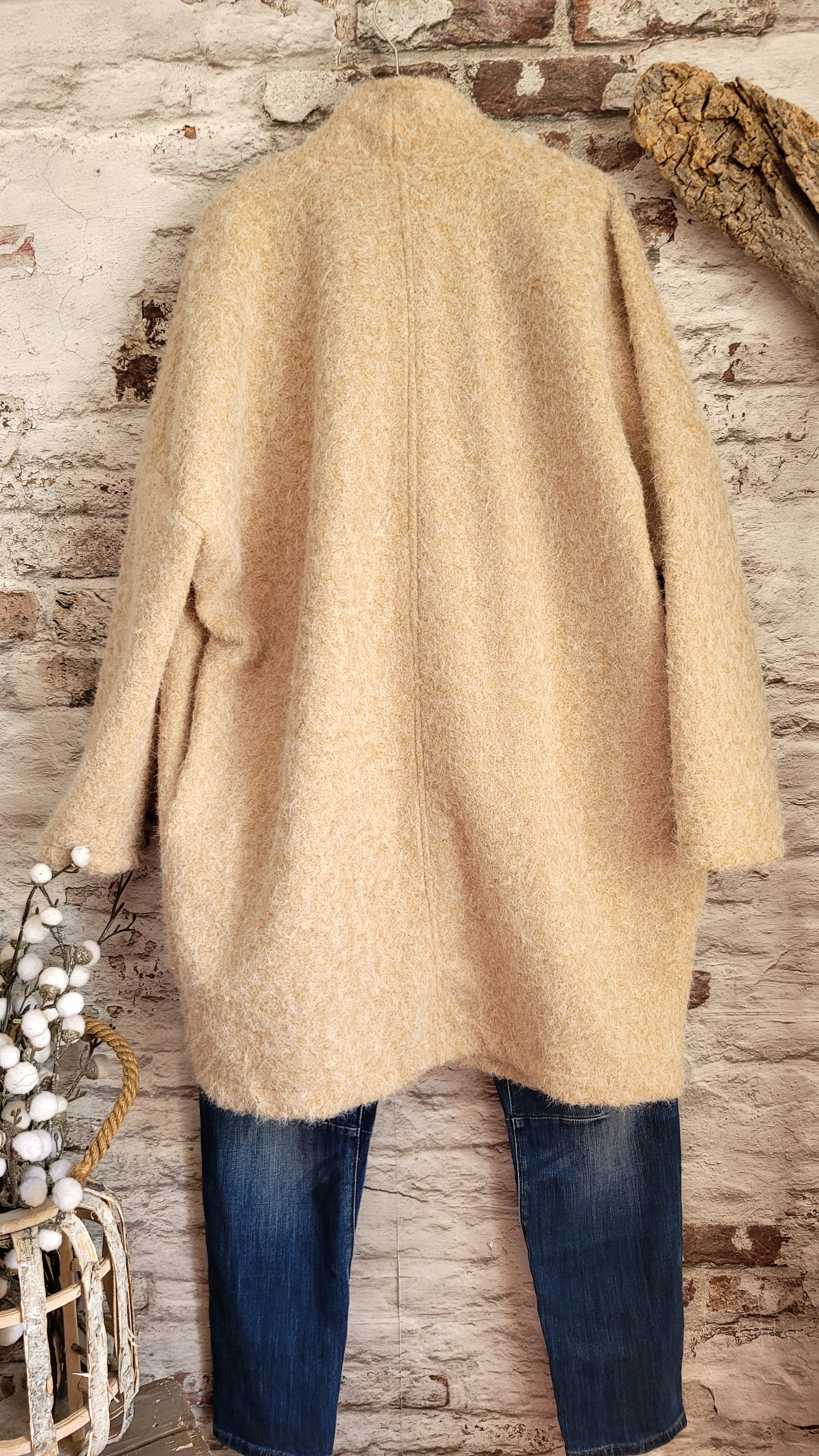 Ce manteau mi-long est une pièce douce et confortable, parfaite pour la mi-saison. Sa maille bouclée offre une texture agréable et un style chic. Il se ferme à l'aide de deux boutons dorés et possède un col à revers classique. Pratique et élégant, il est doté de deux poches latérales pour plus de fonctionnalité.