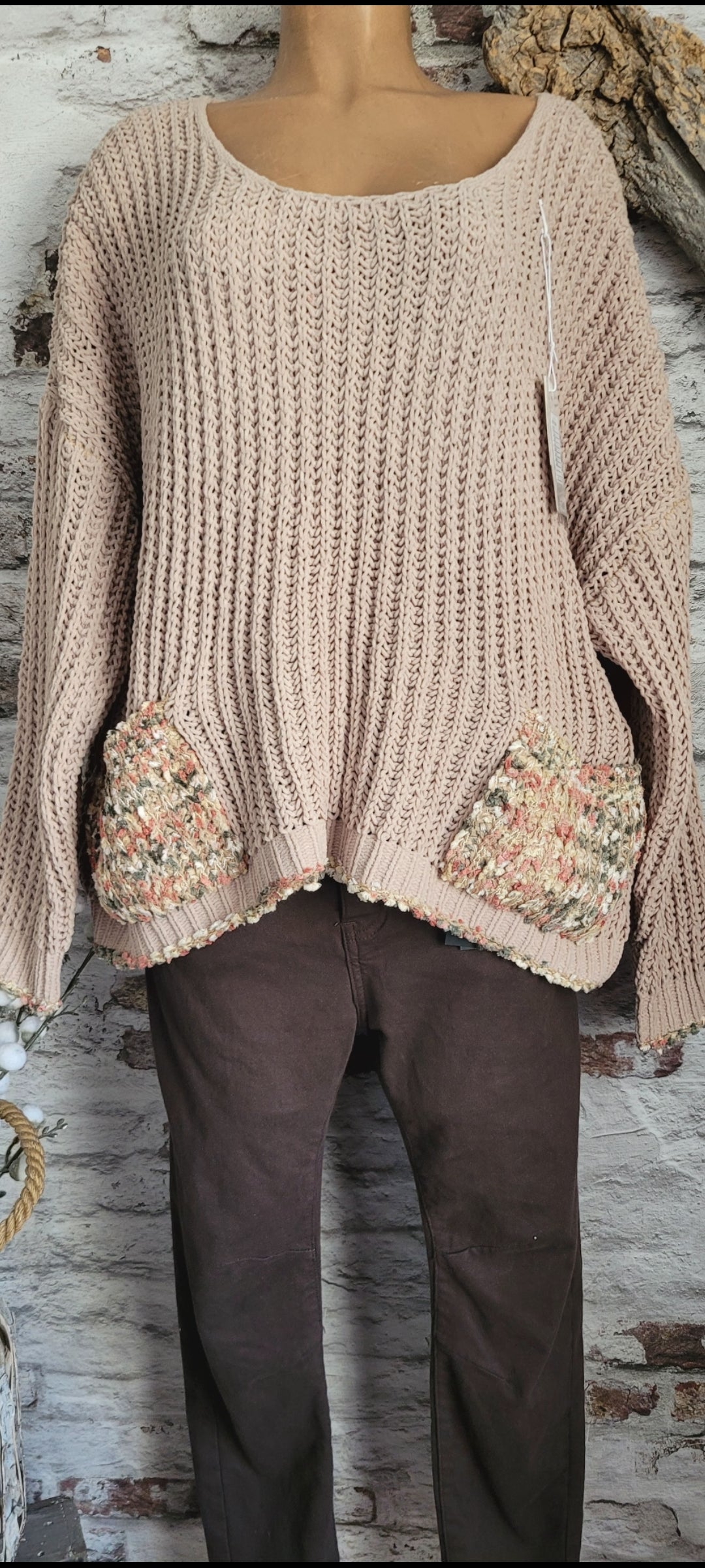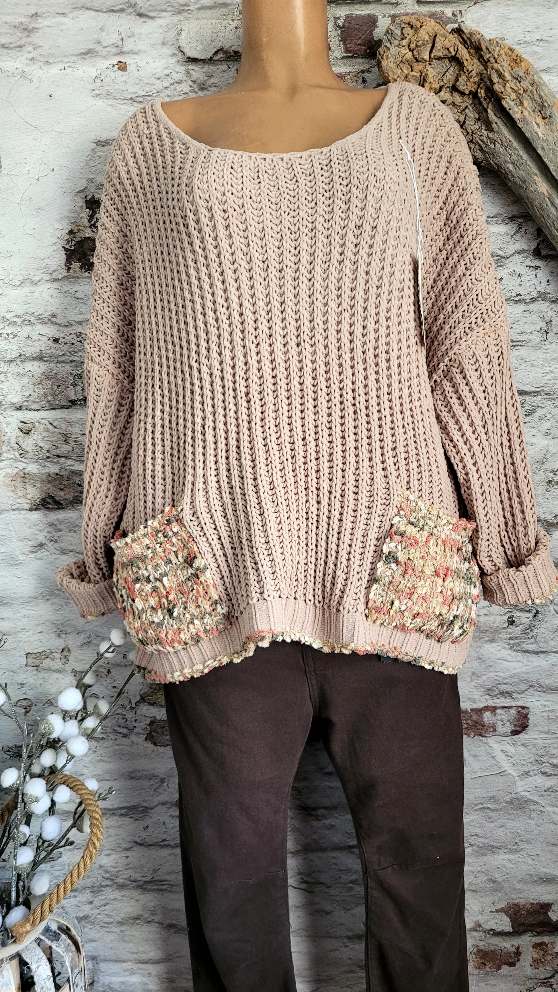 ​Ce pull est sublimé par ses poches carrées fantaisie aux motifs contrastants crème, vert pâle et ocre/corail discret. La coupe oversize à encolure bateau assure un style décontracté parfait.