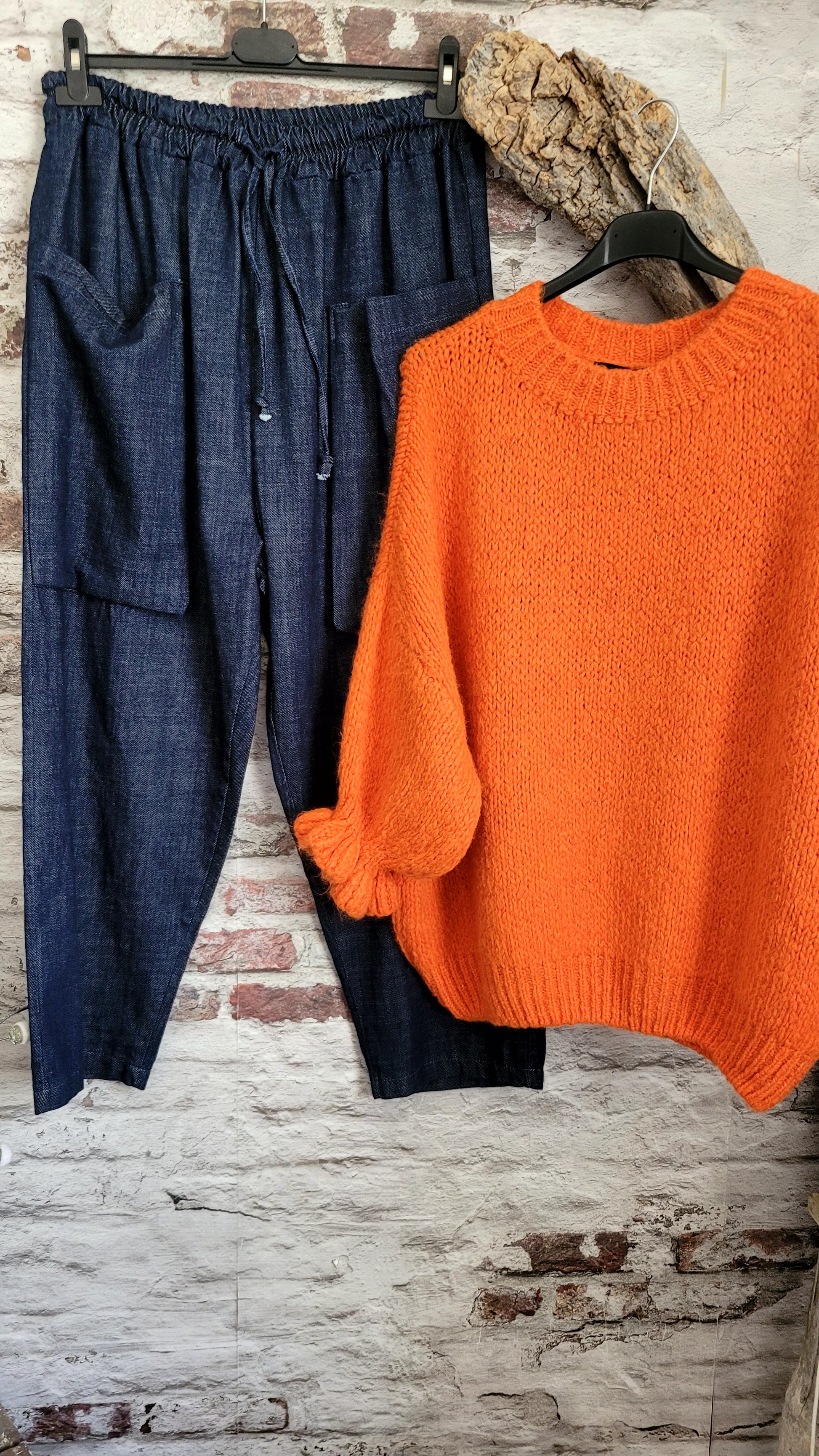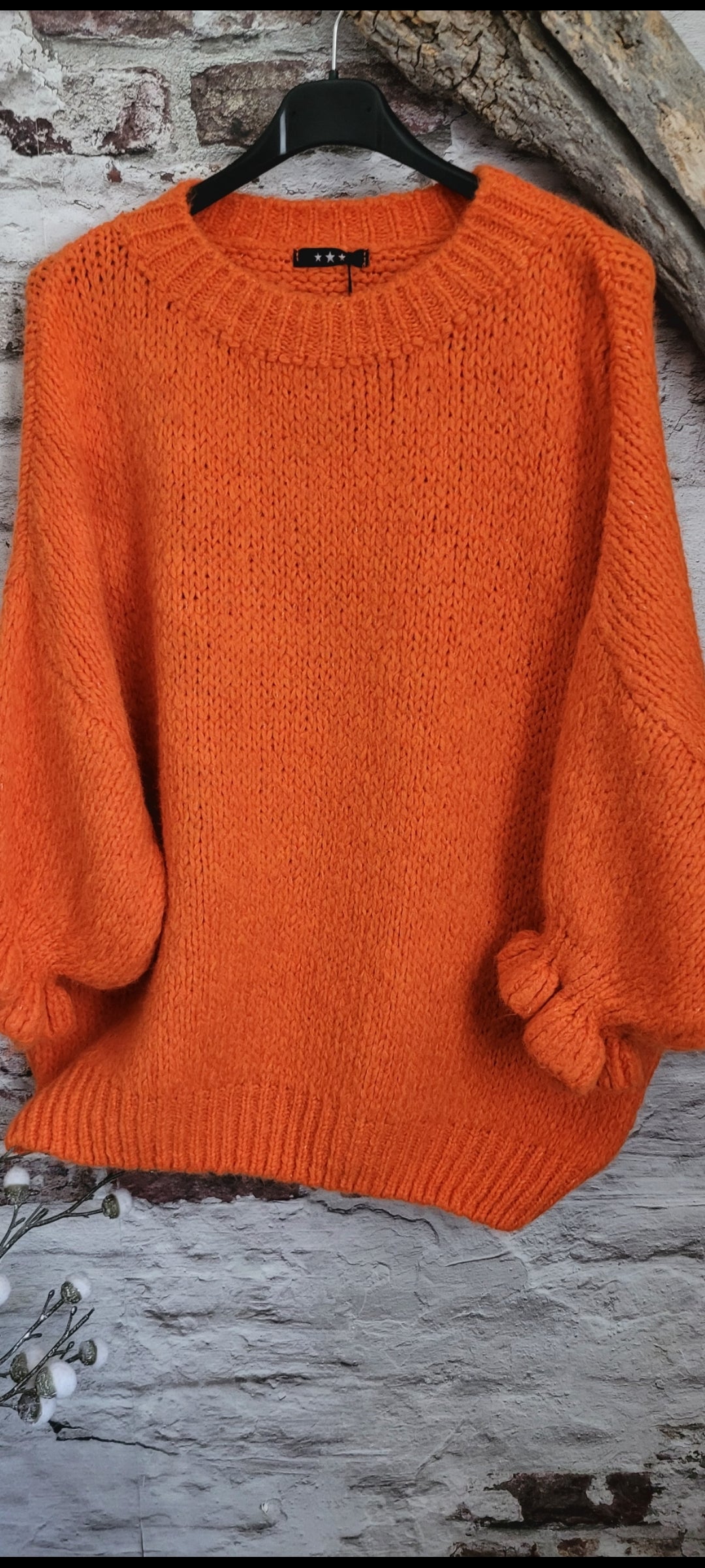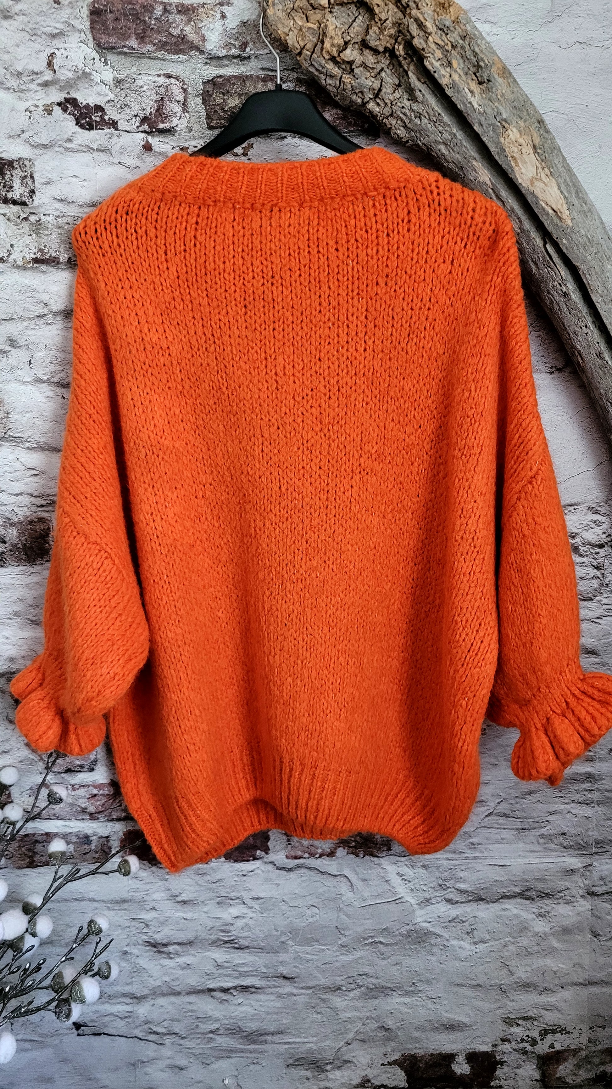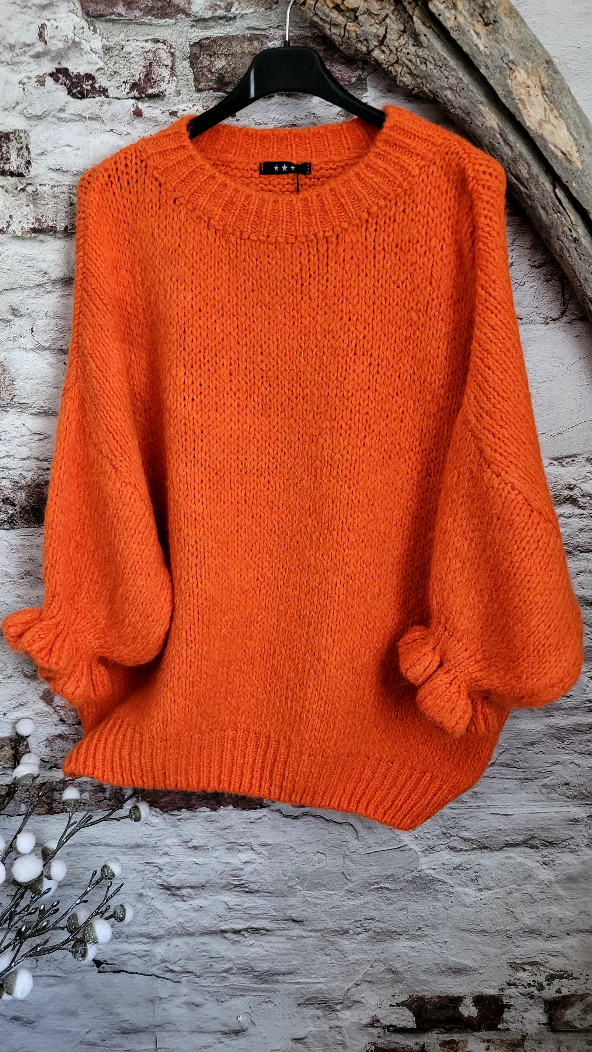 pull douillet de couleur orange au tricot moelleux. Sa coupe ample et son encolure ronde vous enveloppent de douceur. Il se distingue par ses charmantes manches 3/4 "Marguerite" volantées aux poignets, ajoutant une touche romantique et délicate à votre style. L'allié parfait pour l'automne-hiver."
