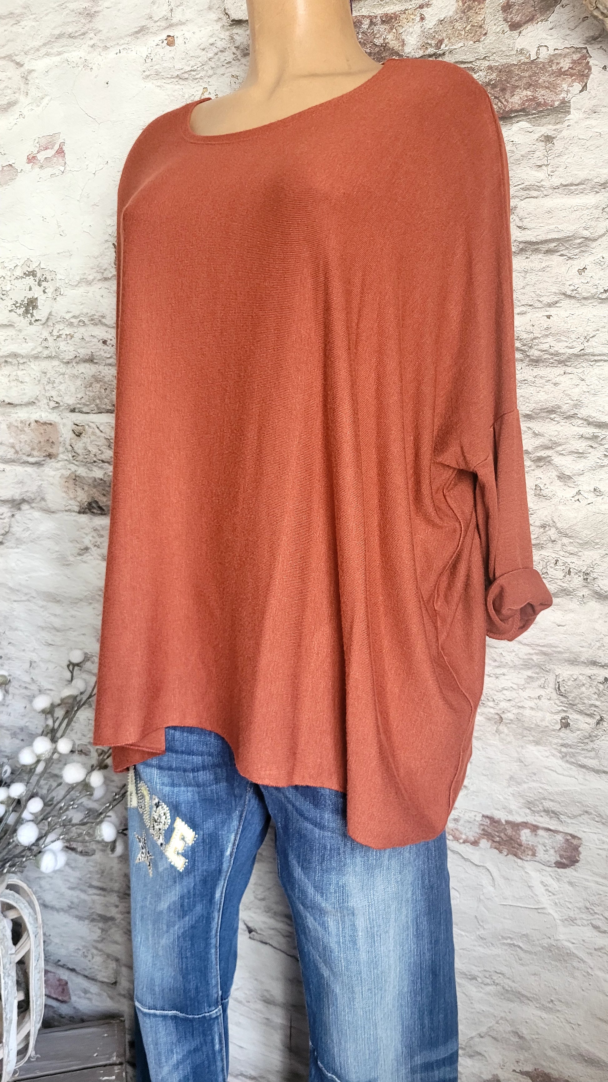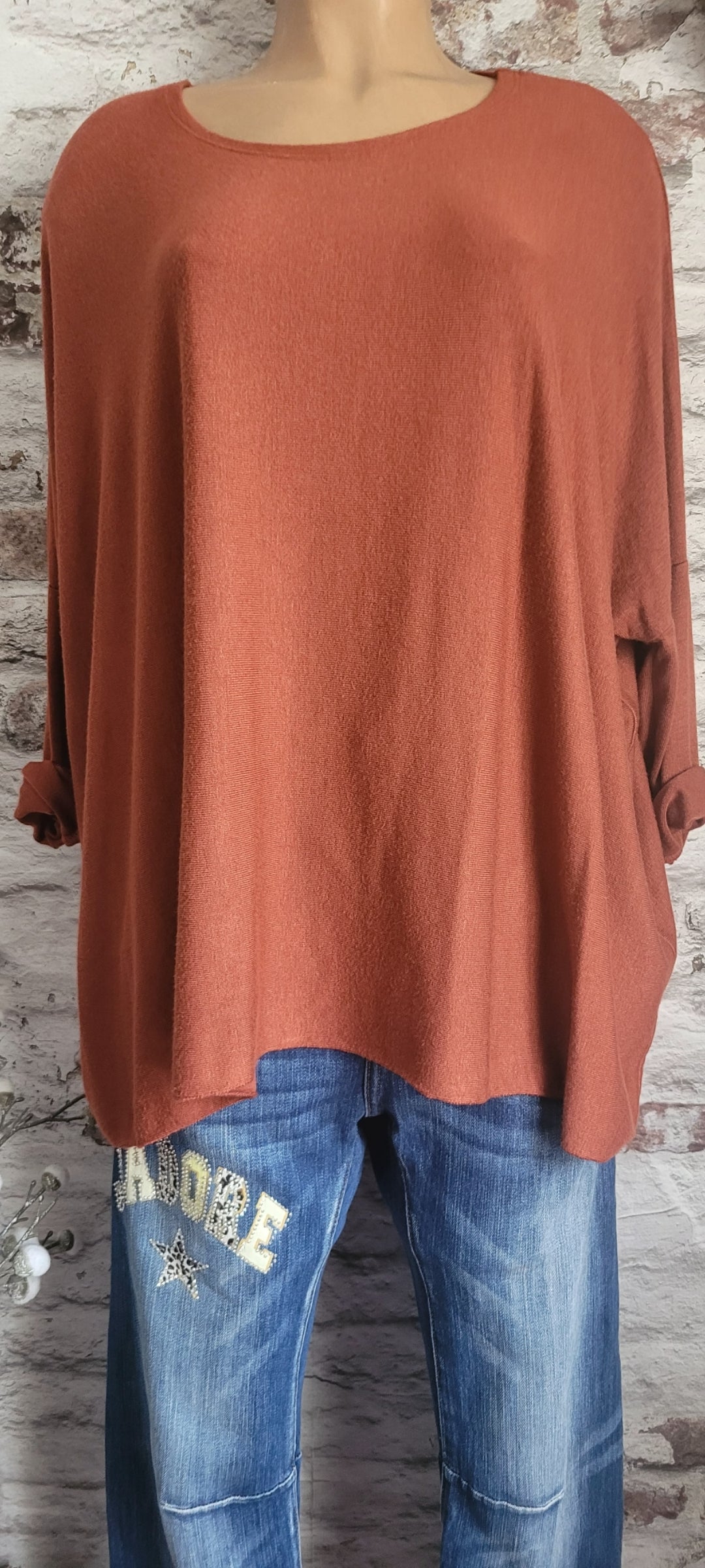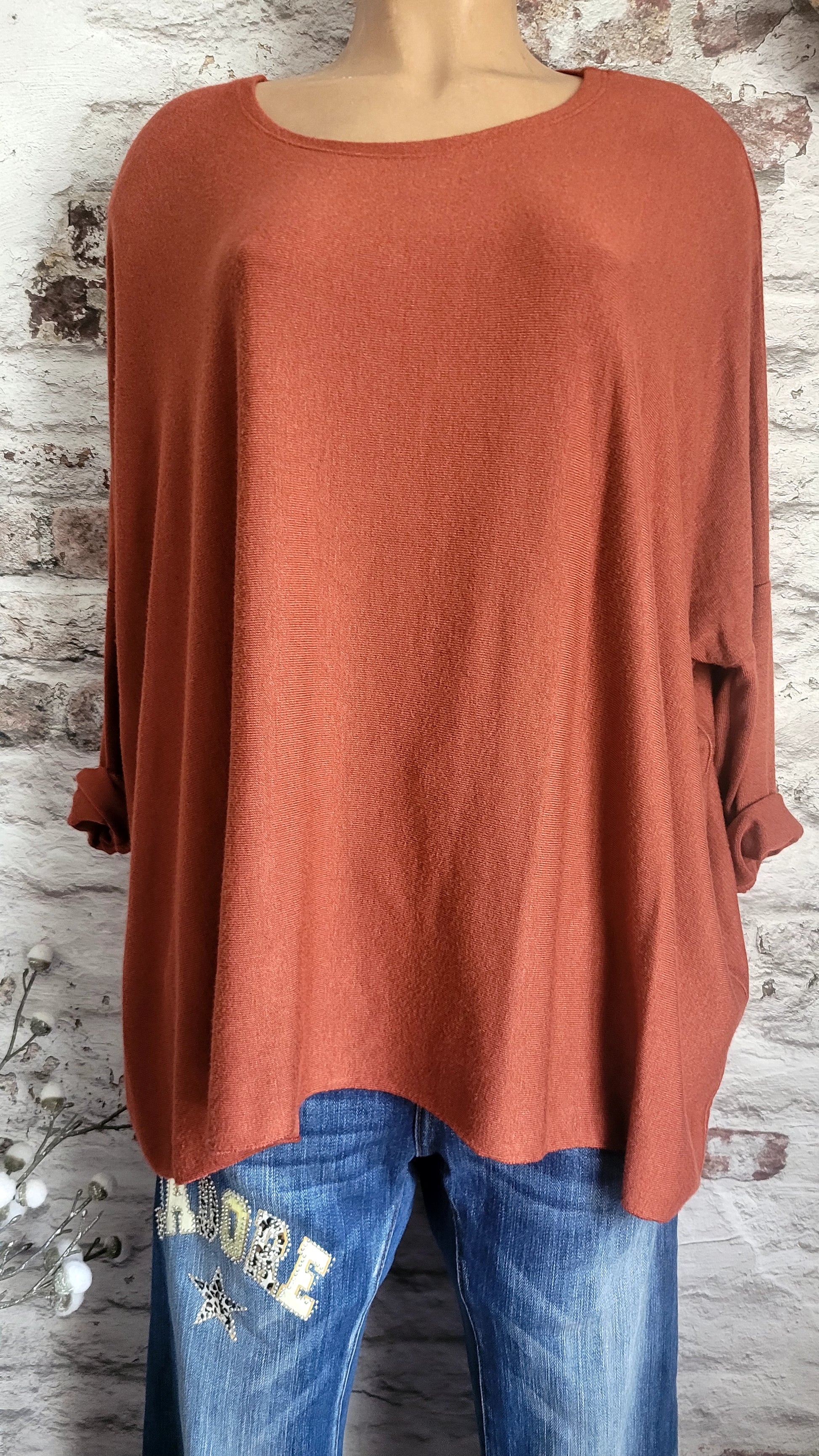 Craquez pour ce pull en maille légère couleur rouille. Sa coupe loose et son tombé fluide offrent un confort maximal et une silhouette décontractée. Col rond classique et manches longues amples. Idéal pour un look tendance et confortable. Taille unique.