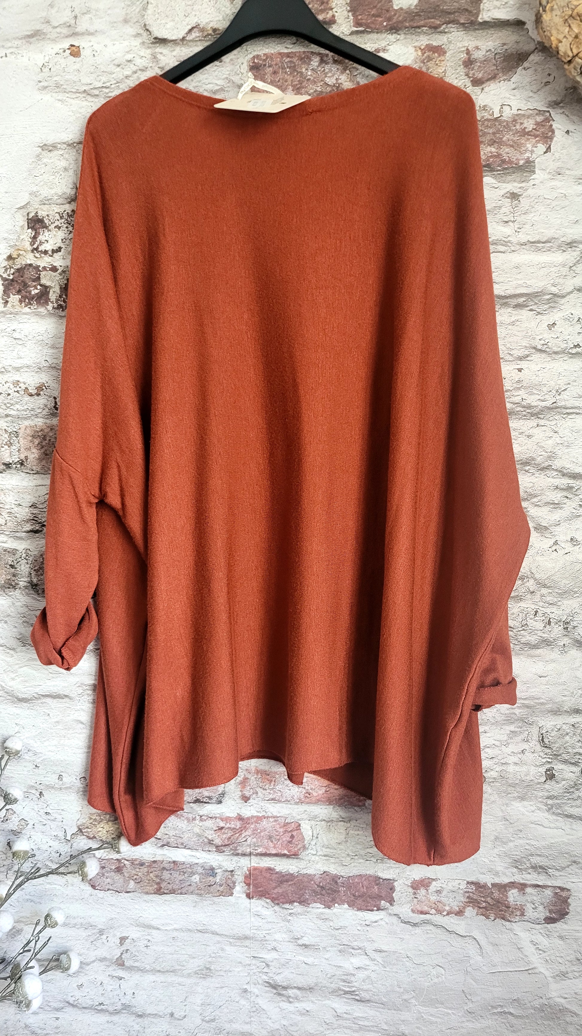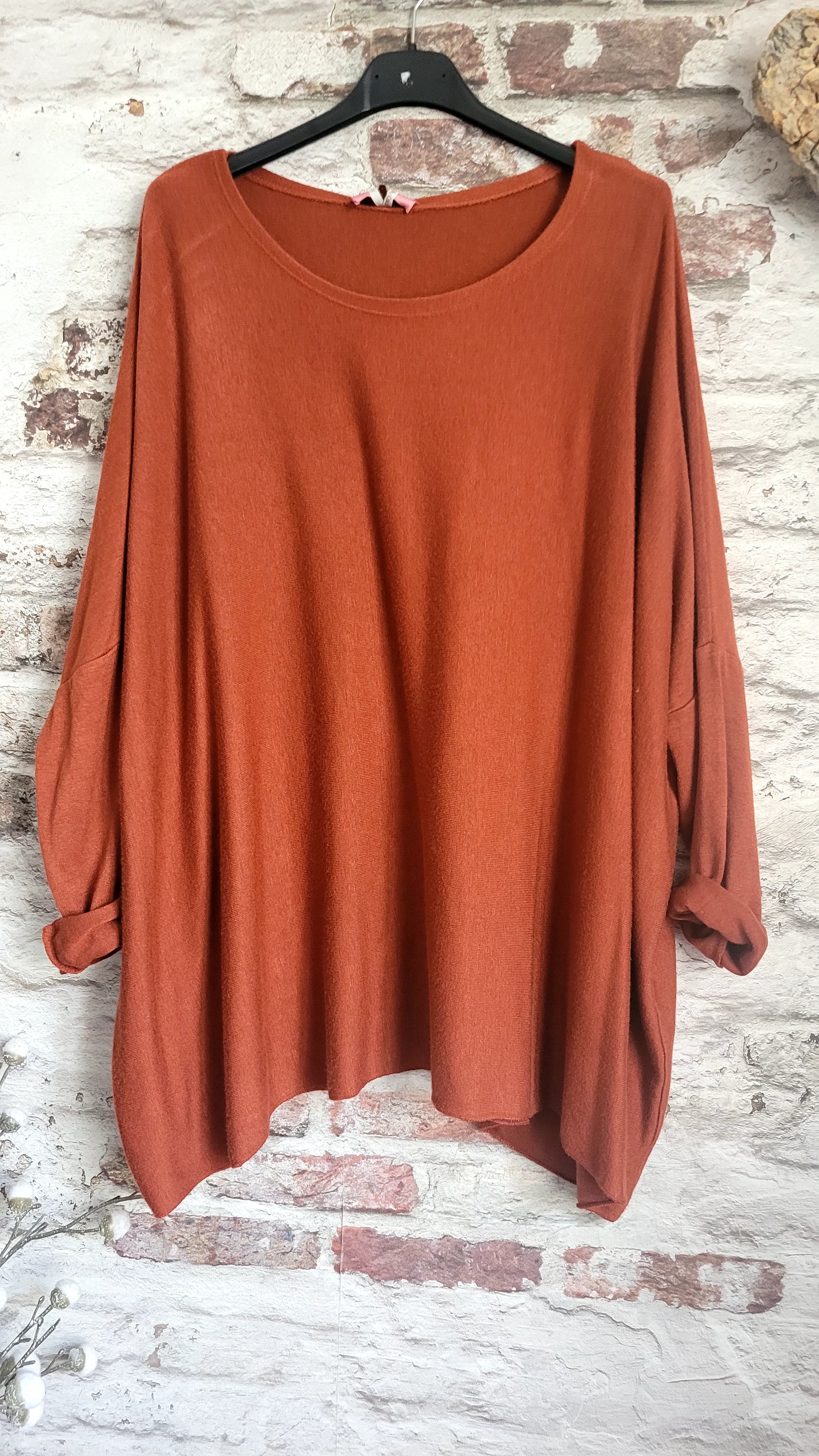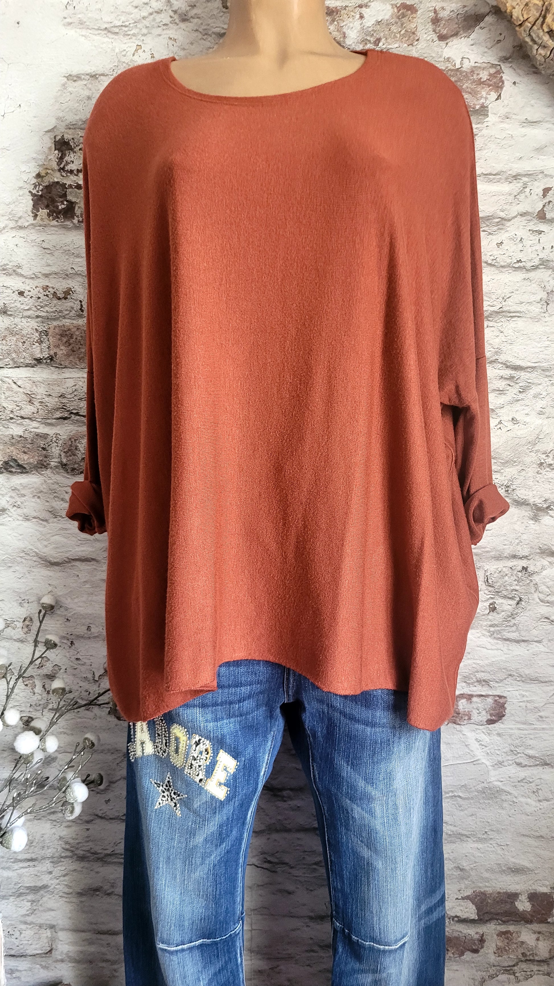 Craquez pour ce pull en maille légère couleur rouille. Sa coupe loose et son tombé fluide offrent un confort maximal et une silhouette décontractée. Col rond classique et manches longues amples. Idéal pour un look tendance et confortable. Taille unique.