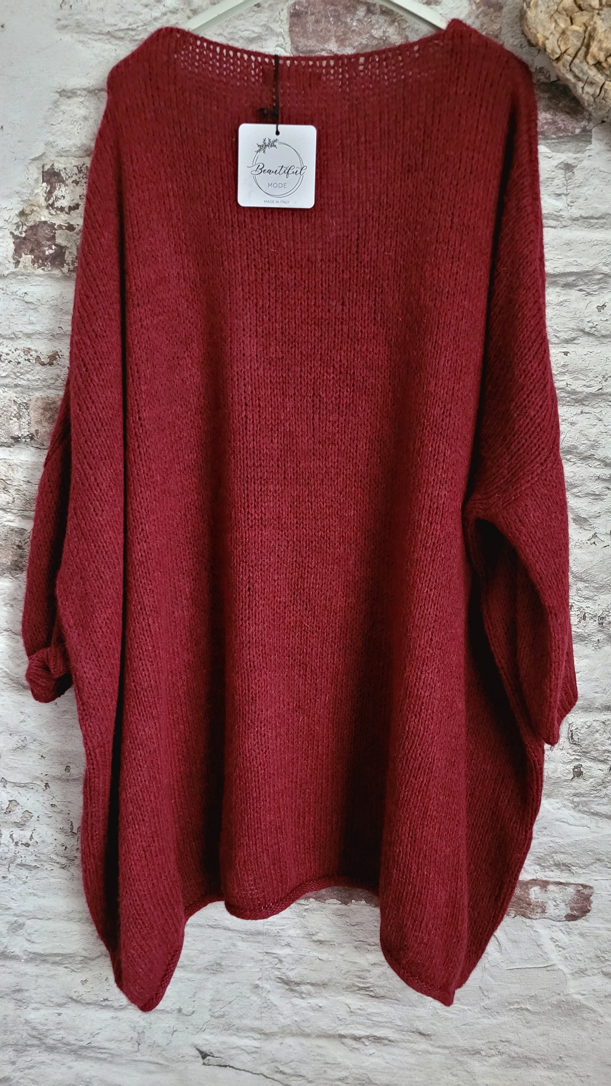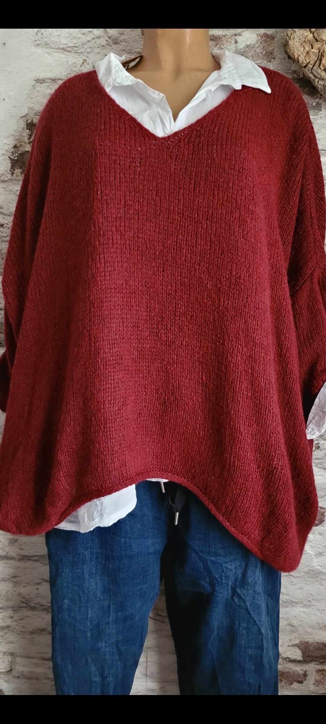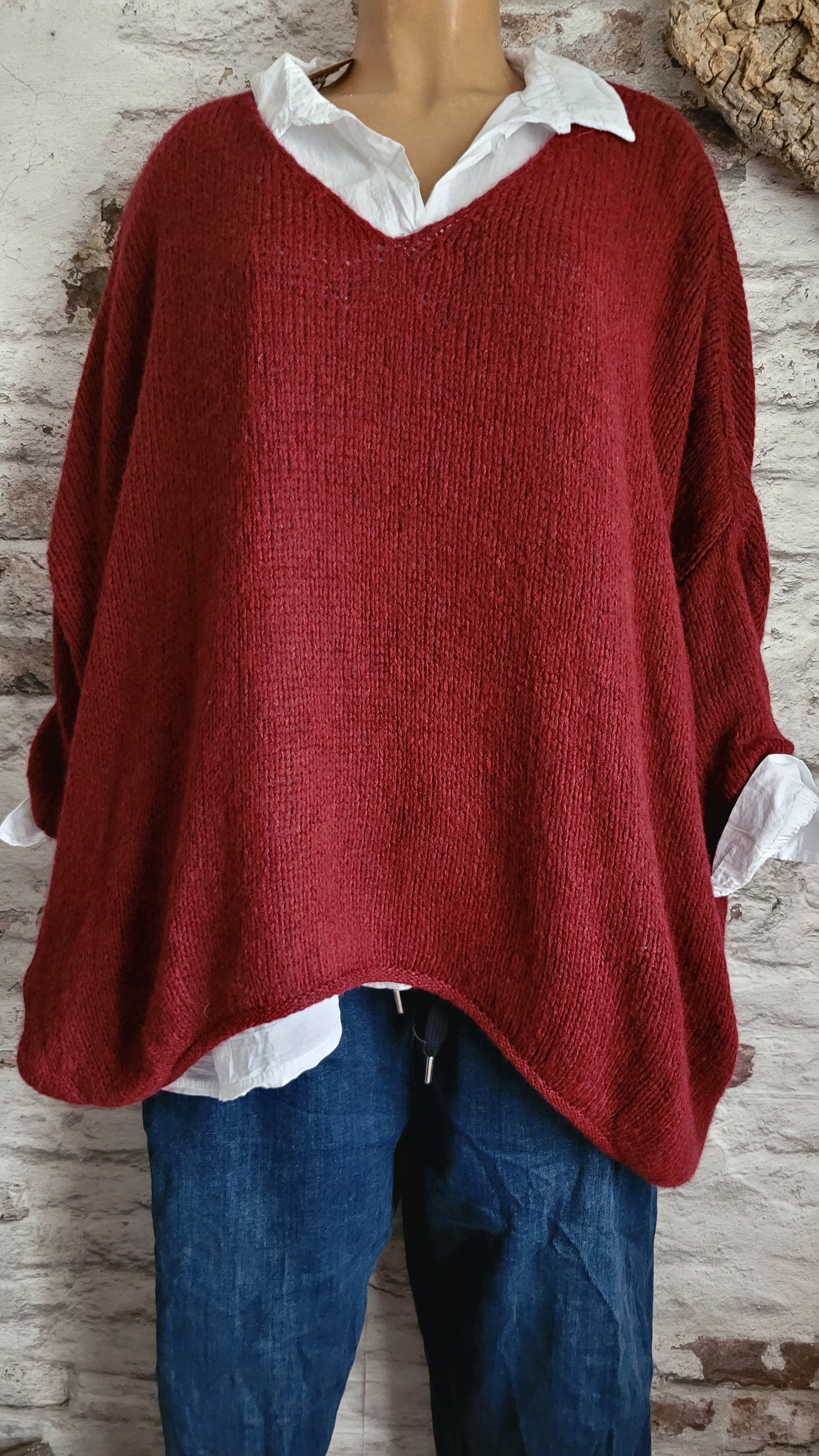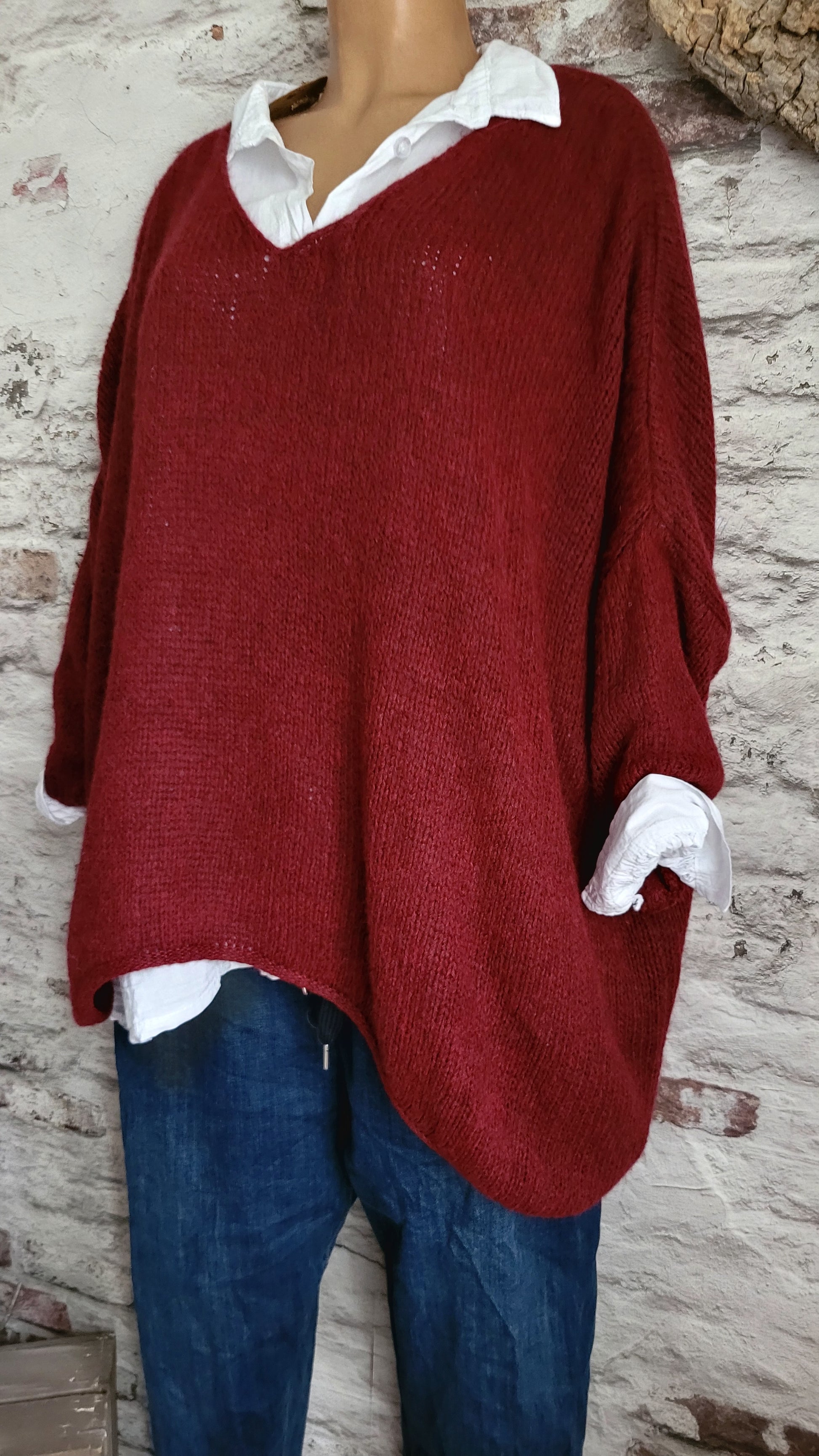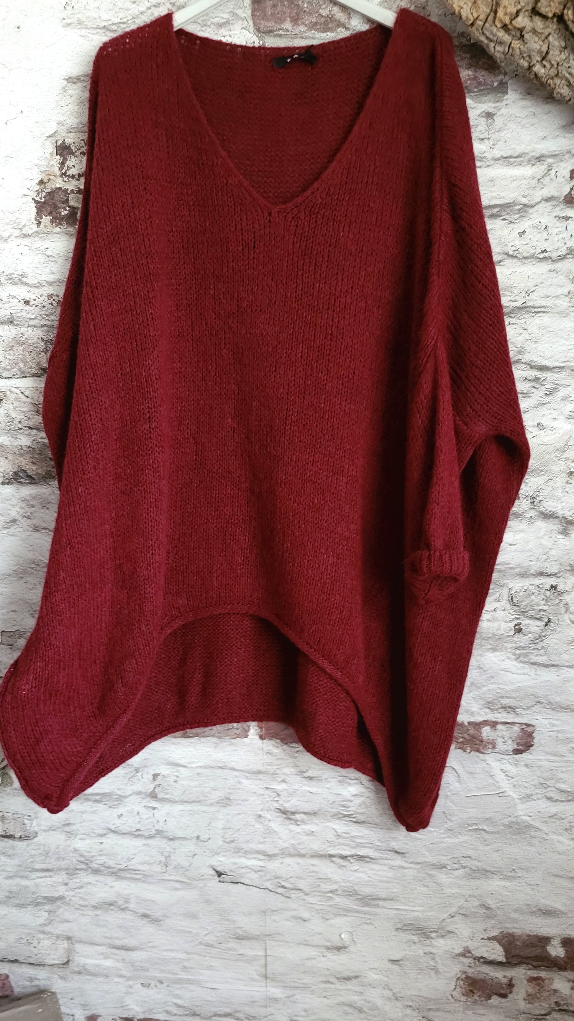 🥀 Pull oversize bordeaux en maille douce, col V féminin et coupe ample pour un confort absolu. Manches longues retroussables, base légèrement asymétrique pour une touche décontractée et moderne. Parfait pour un look cosy et tendance.
