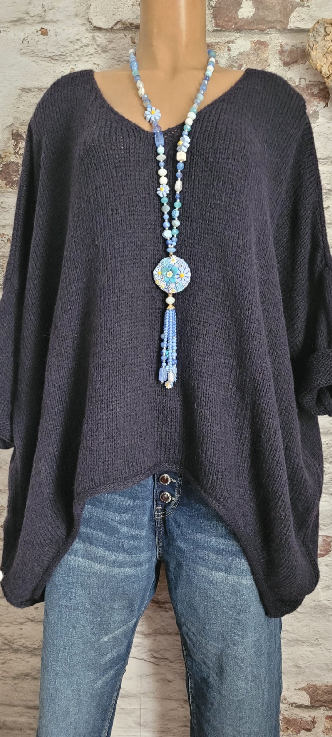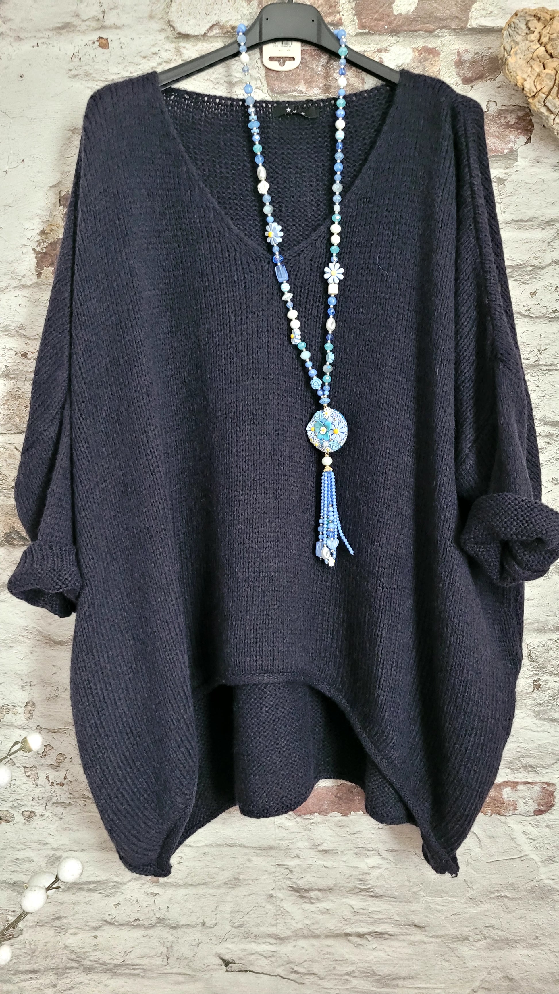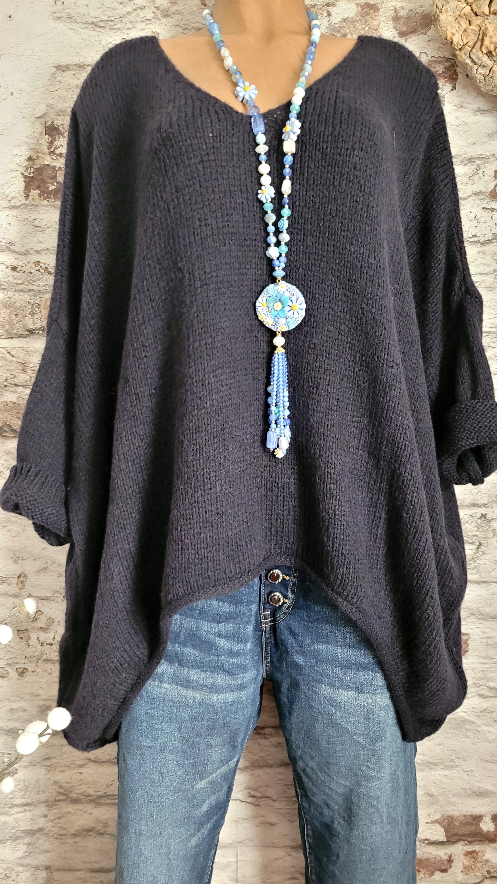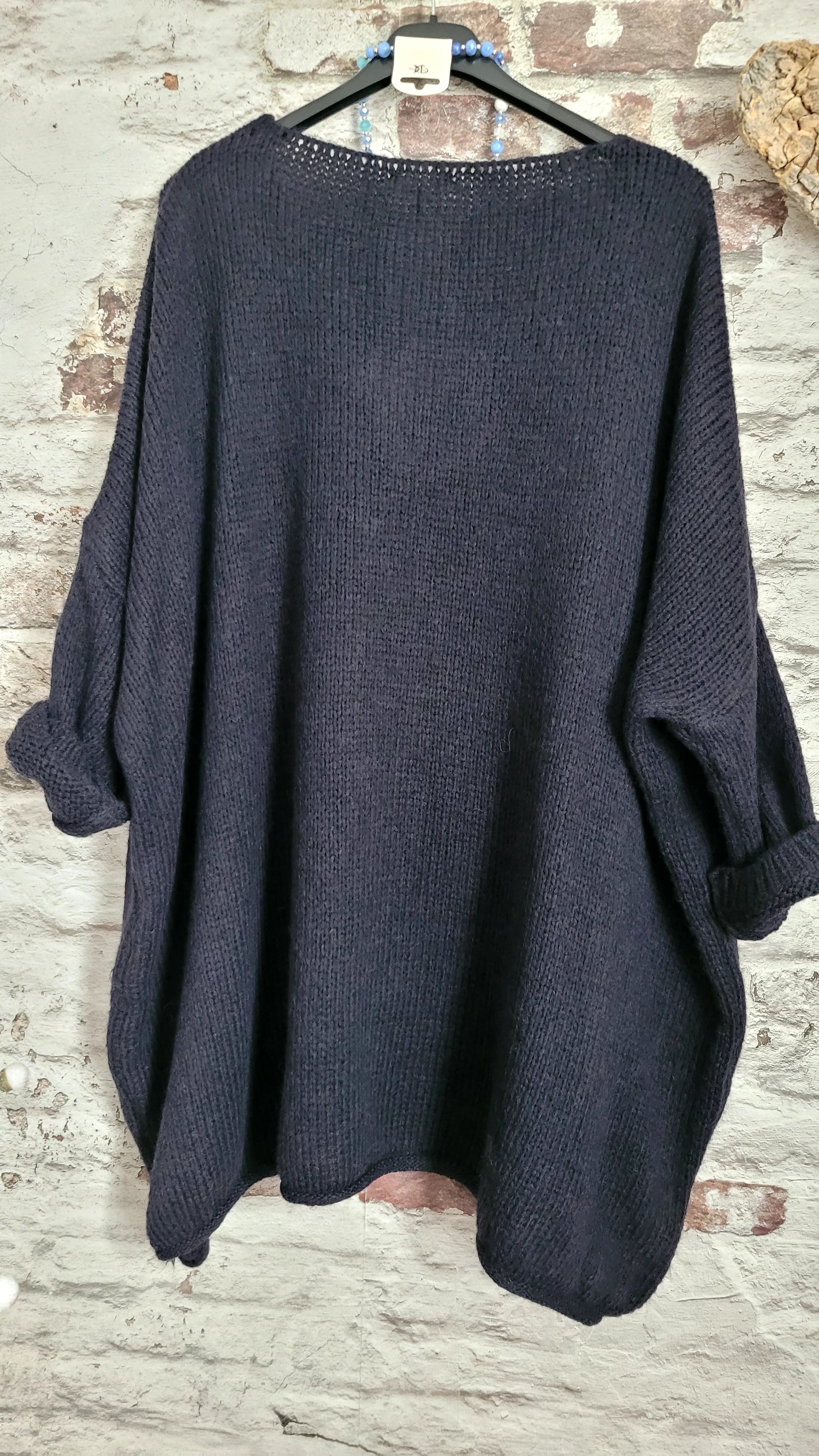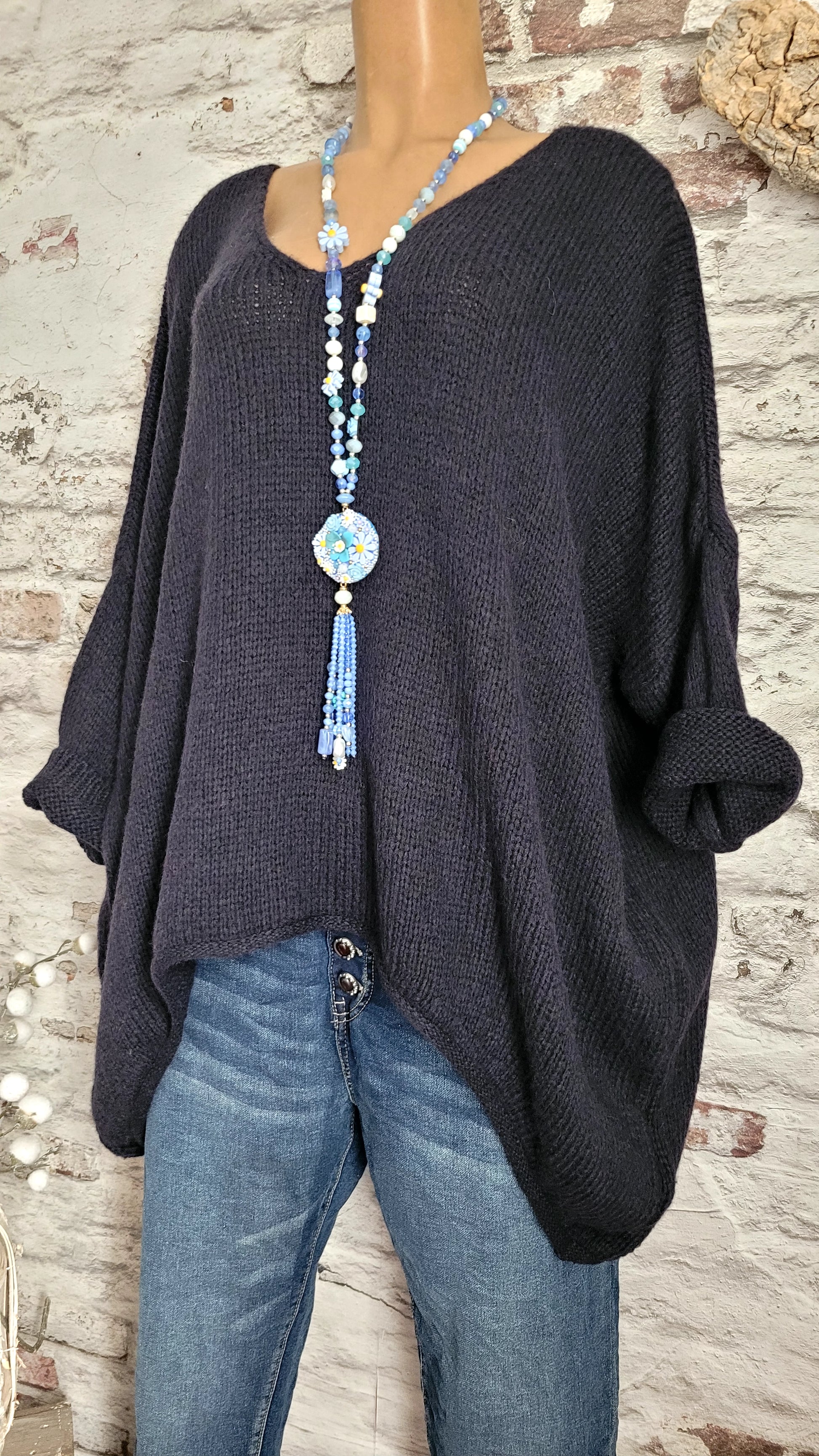 🥀 Pull oversize bleu marine en maille douce, col V féminin et coupe ample pour un confort absolu. Manches longues retroussables, base légèrement asymétrique pour une touche décontractée et moderne. Parfait pour un look cosy et tendance.