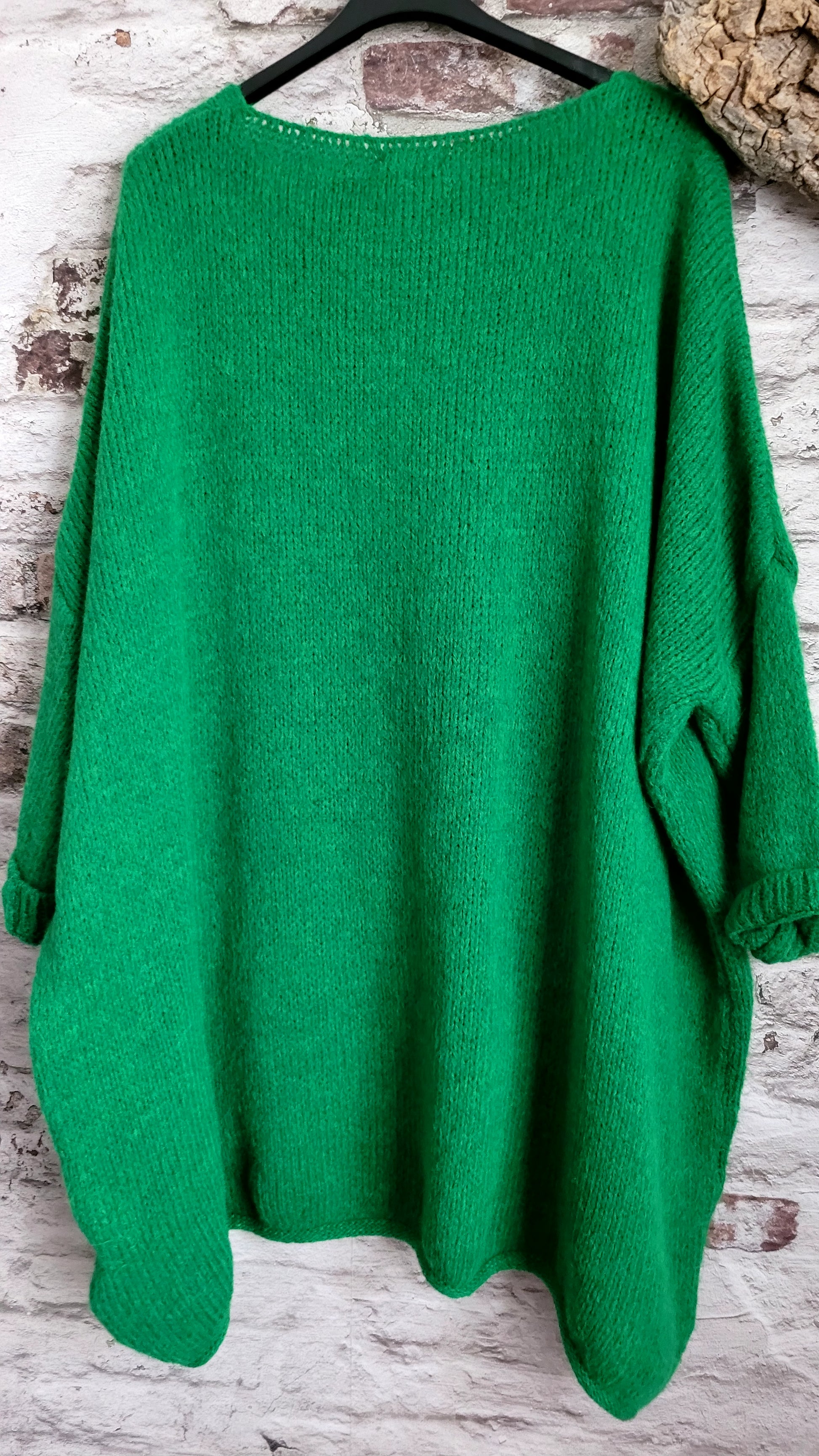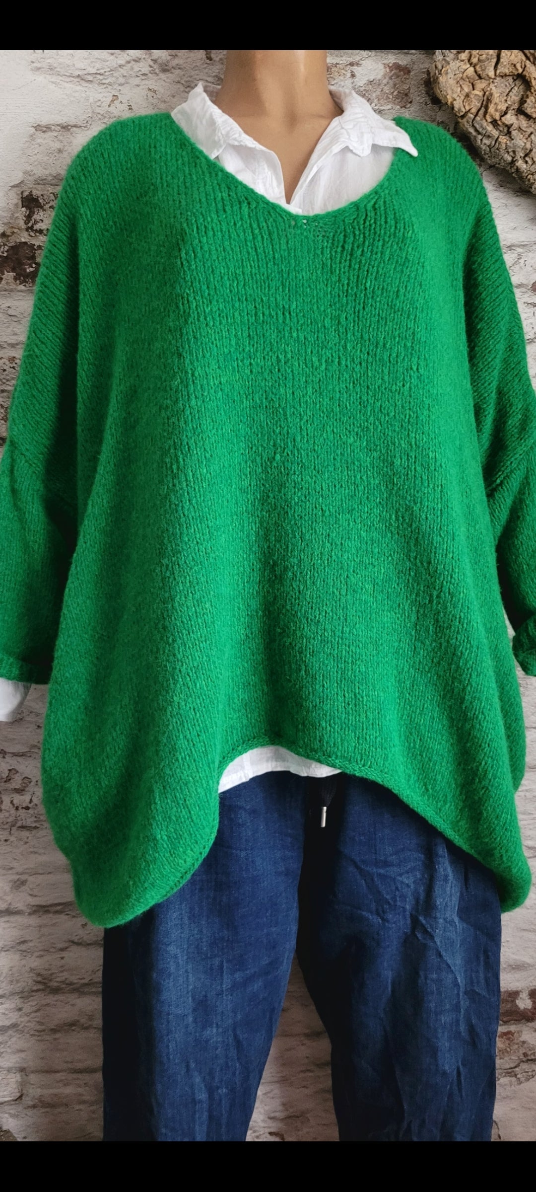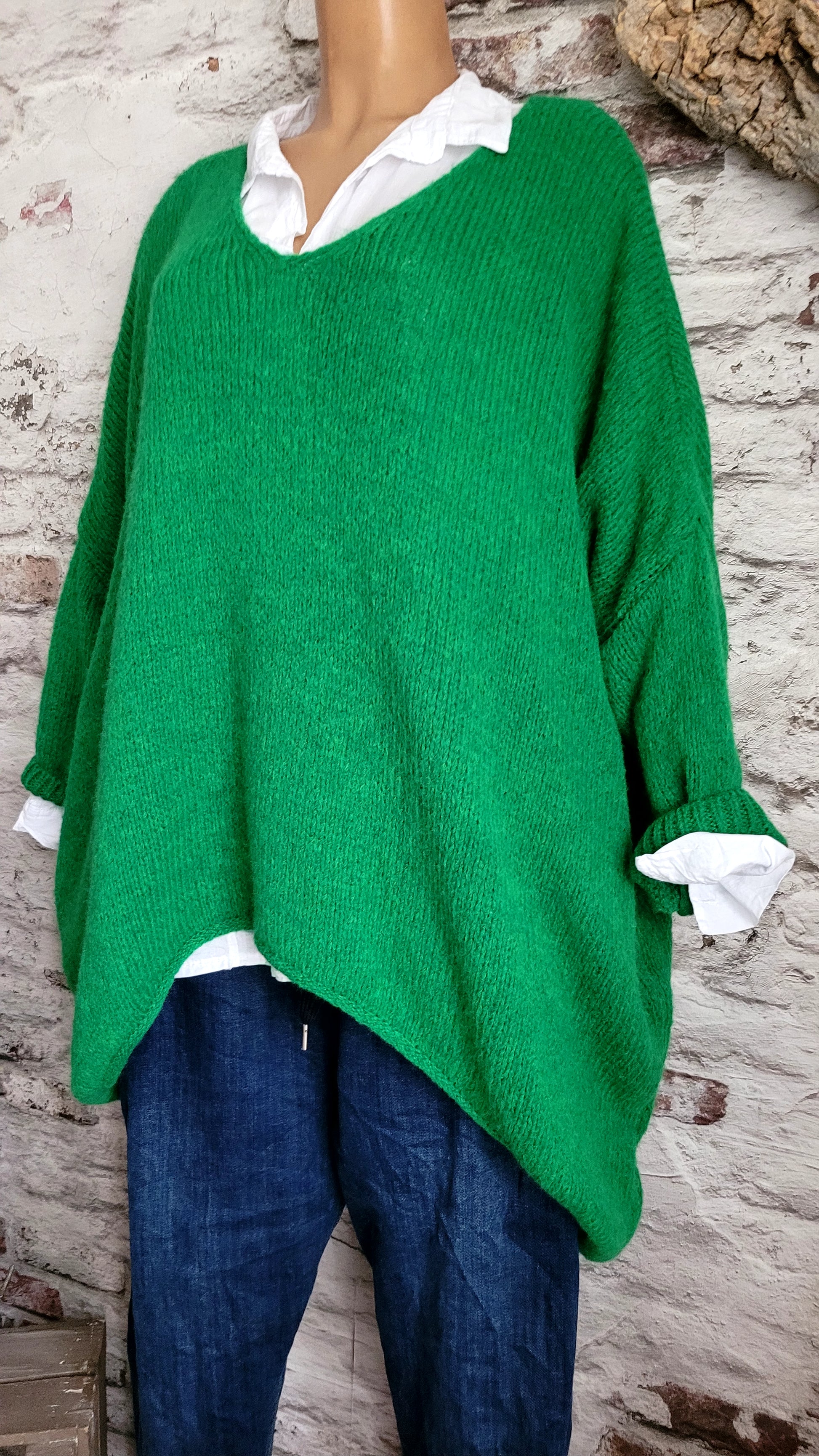 🥀 Pull oversize vert prairie en maille douce, col V féminin et coupe ample pour un confort absolu. Manches longues retroussables, base légèrement asymétrique pour une touche décontractée et moderne. Parfait pour un look cosy et tendance.