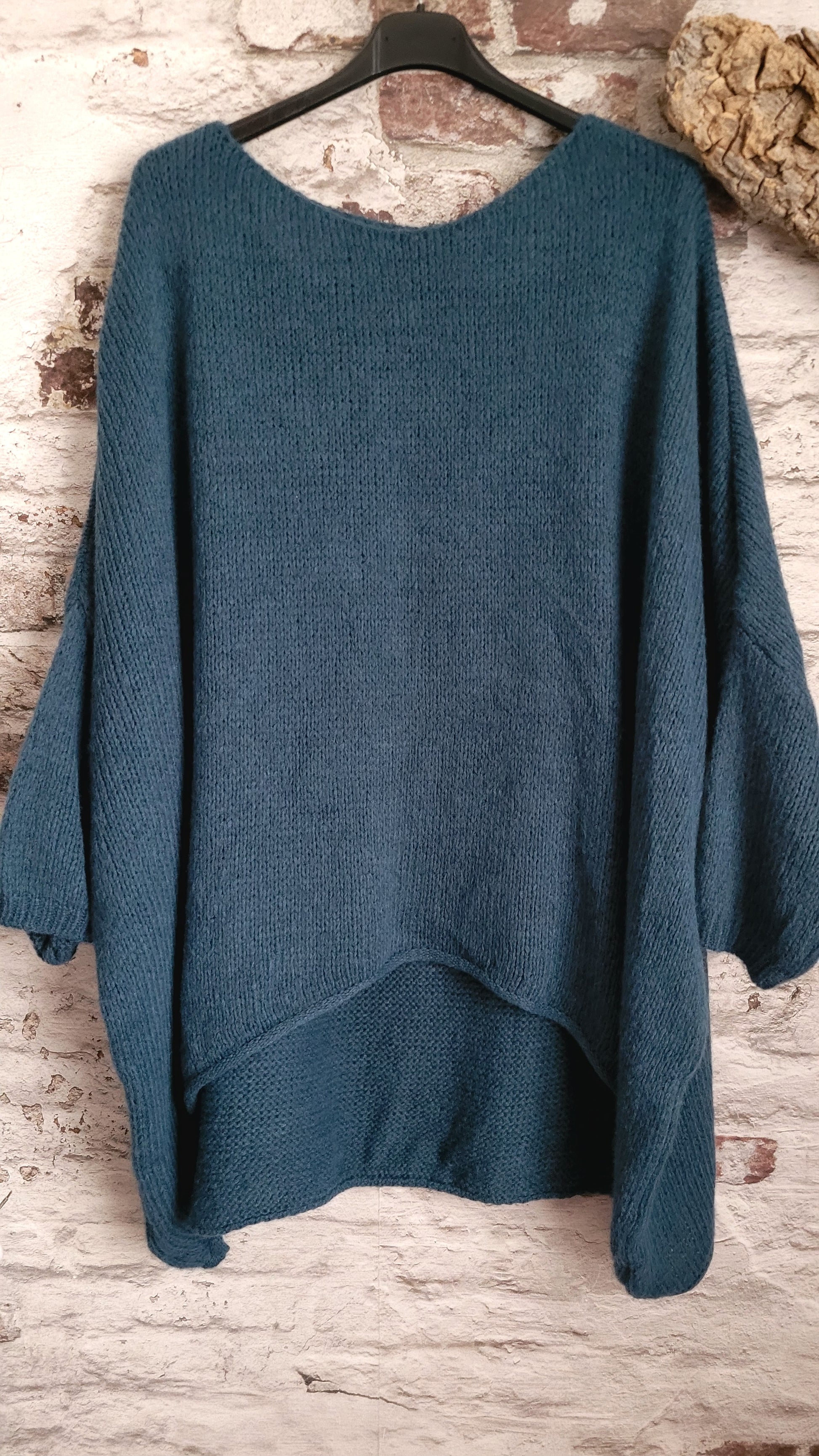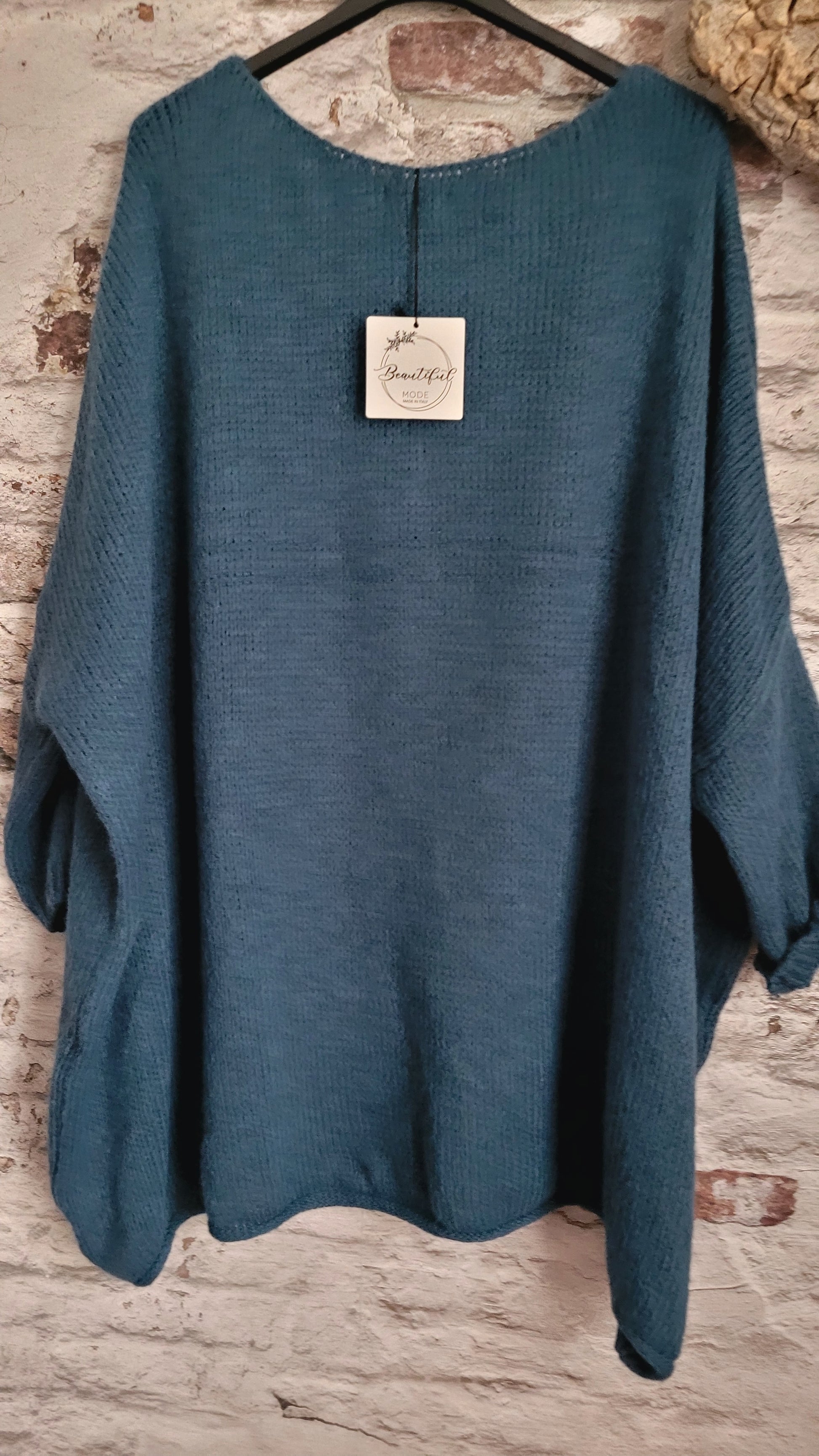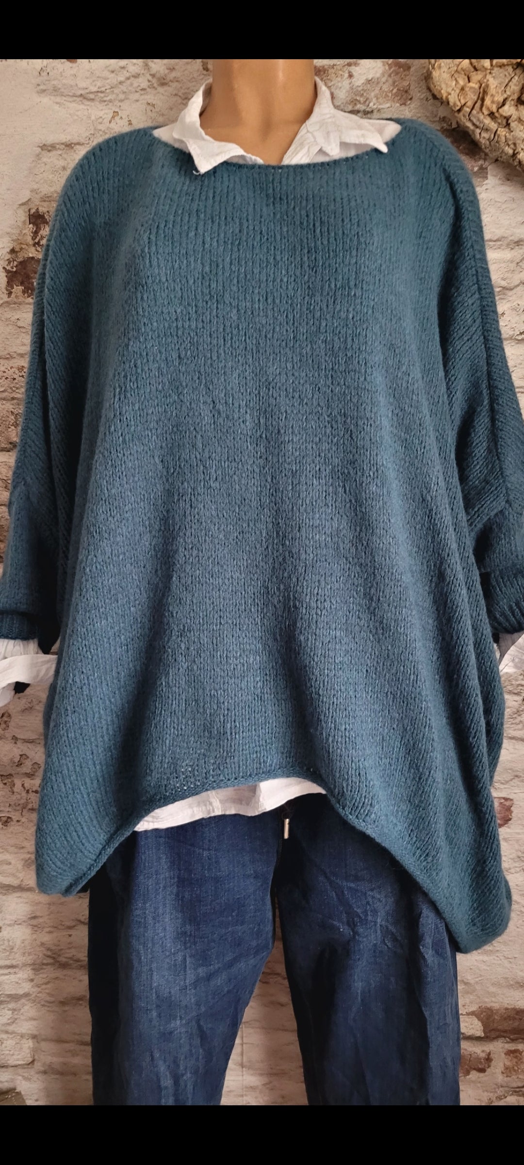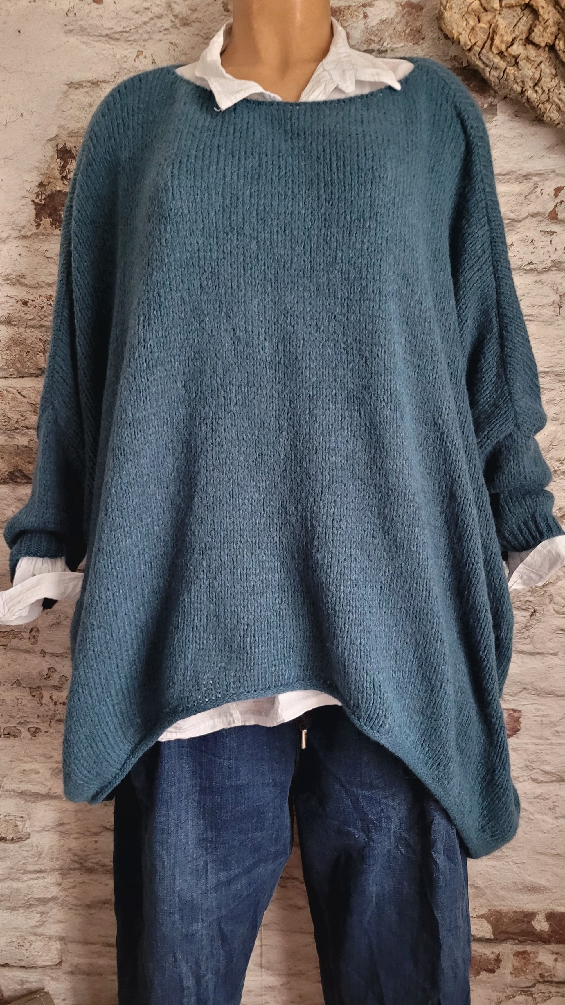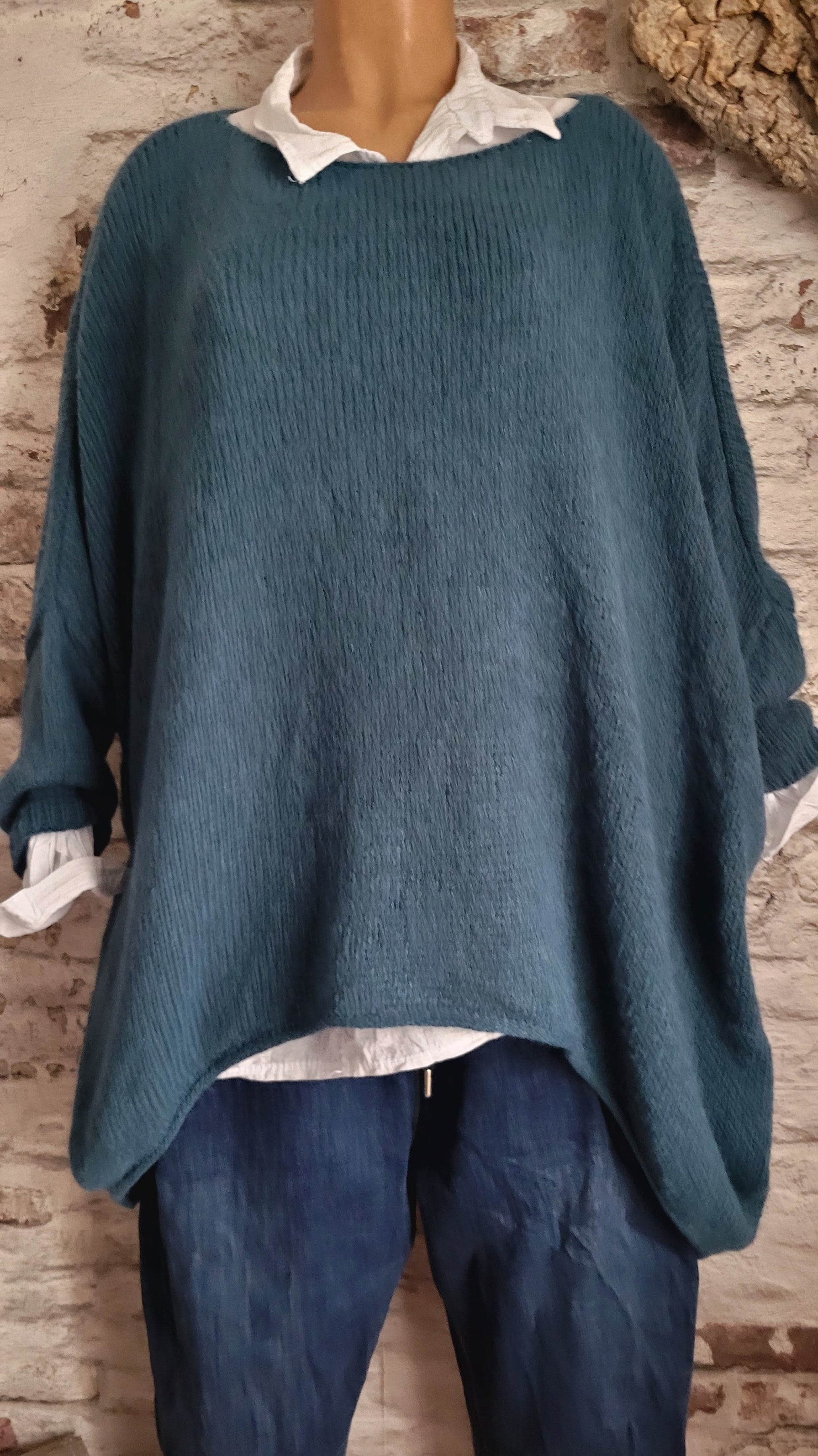 🥀 Pull oversize bleu canard en maille douce, col V féminin et coupe ample pour un confort absolu. Manches longues retroussables, base légèrement asymétrique pour une touche décontractée et moderne. Parfait pour un look cosy et tendance.