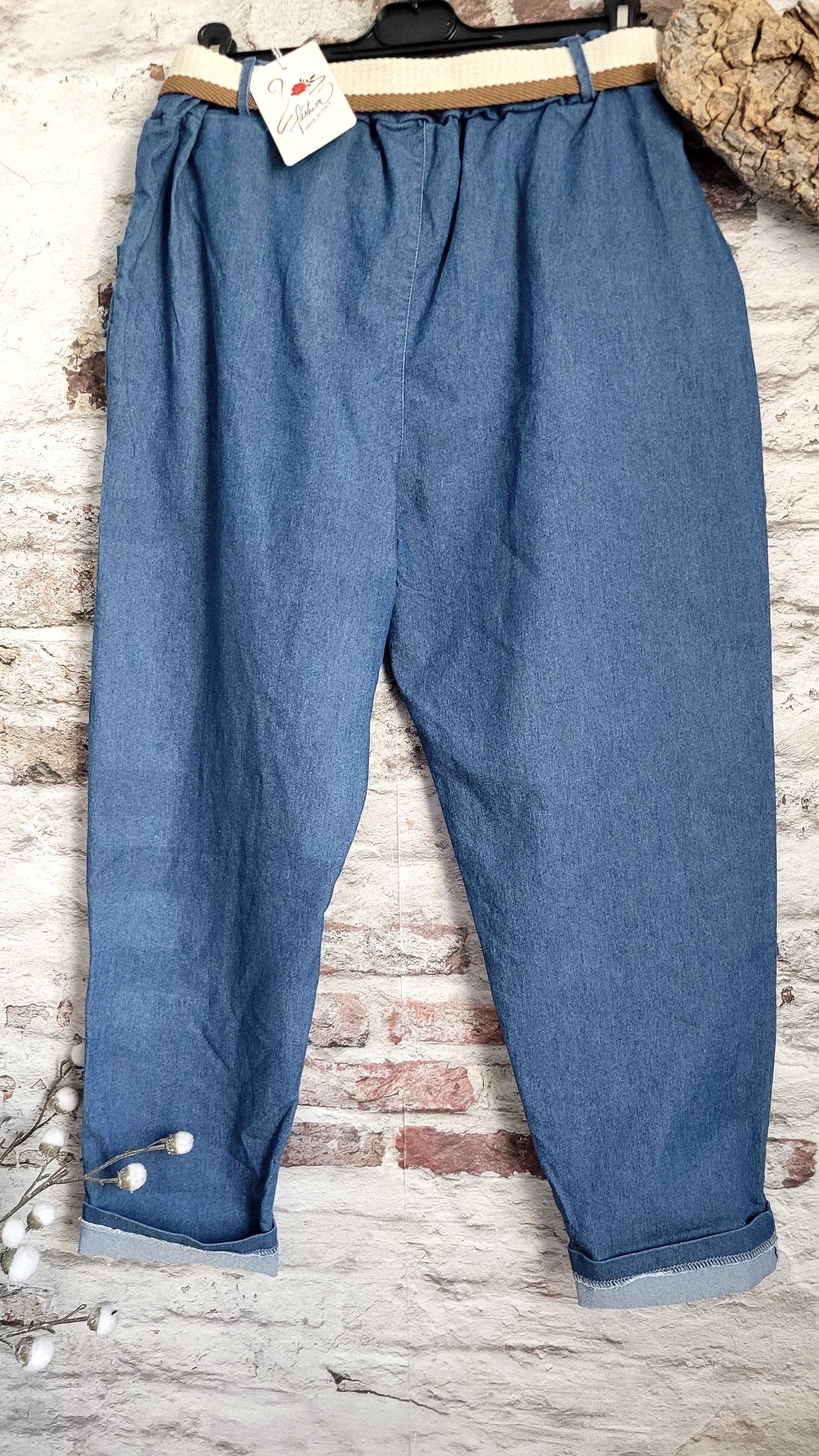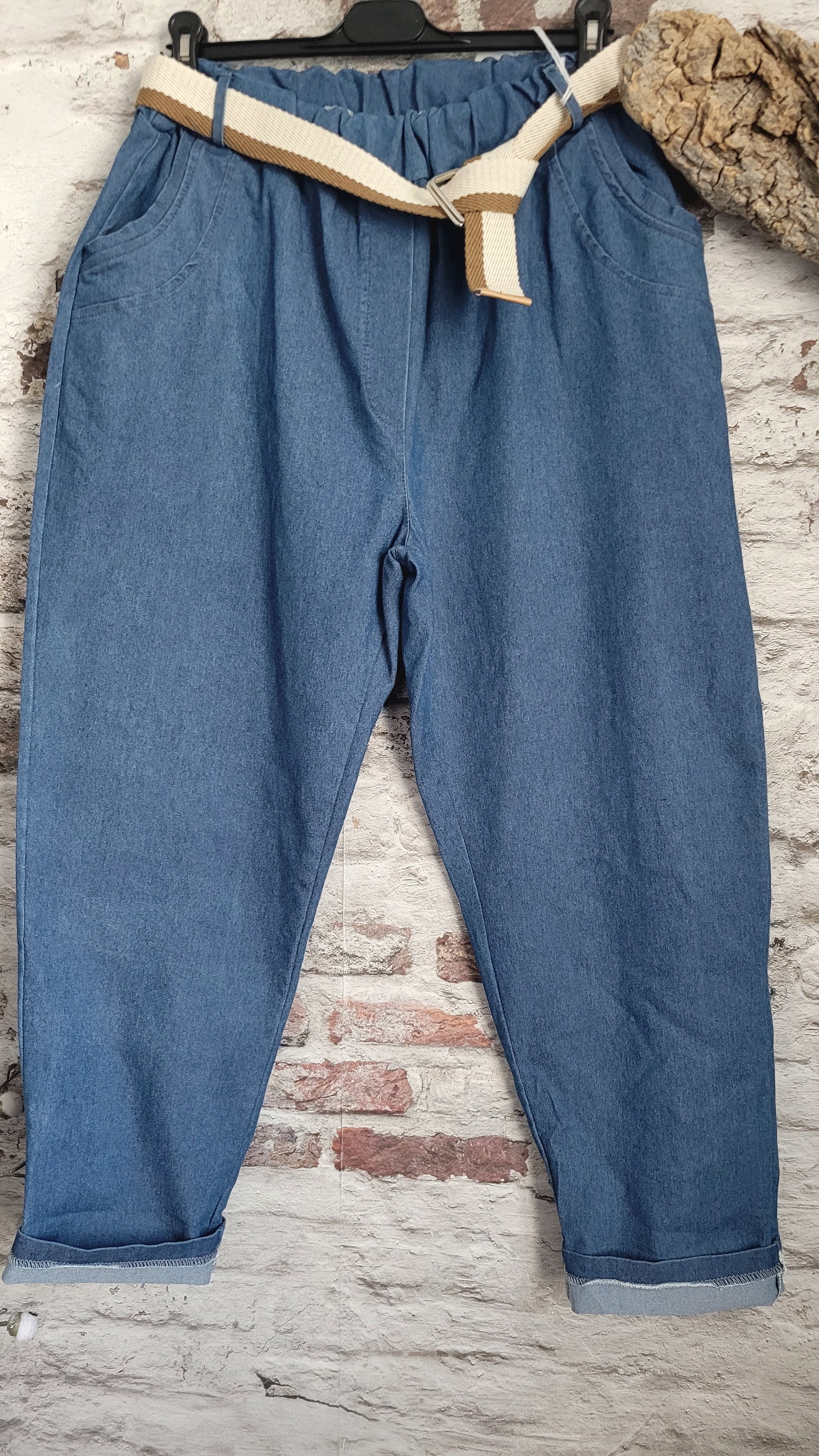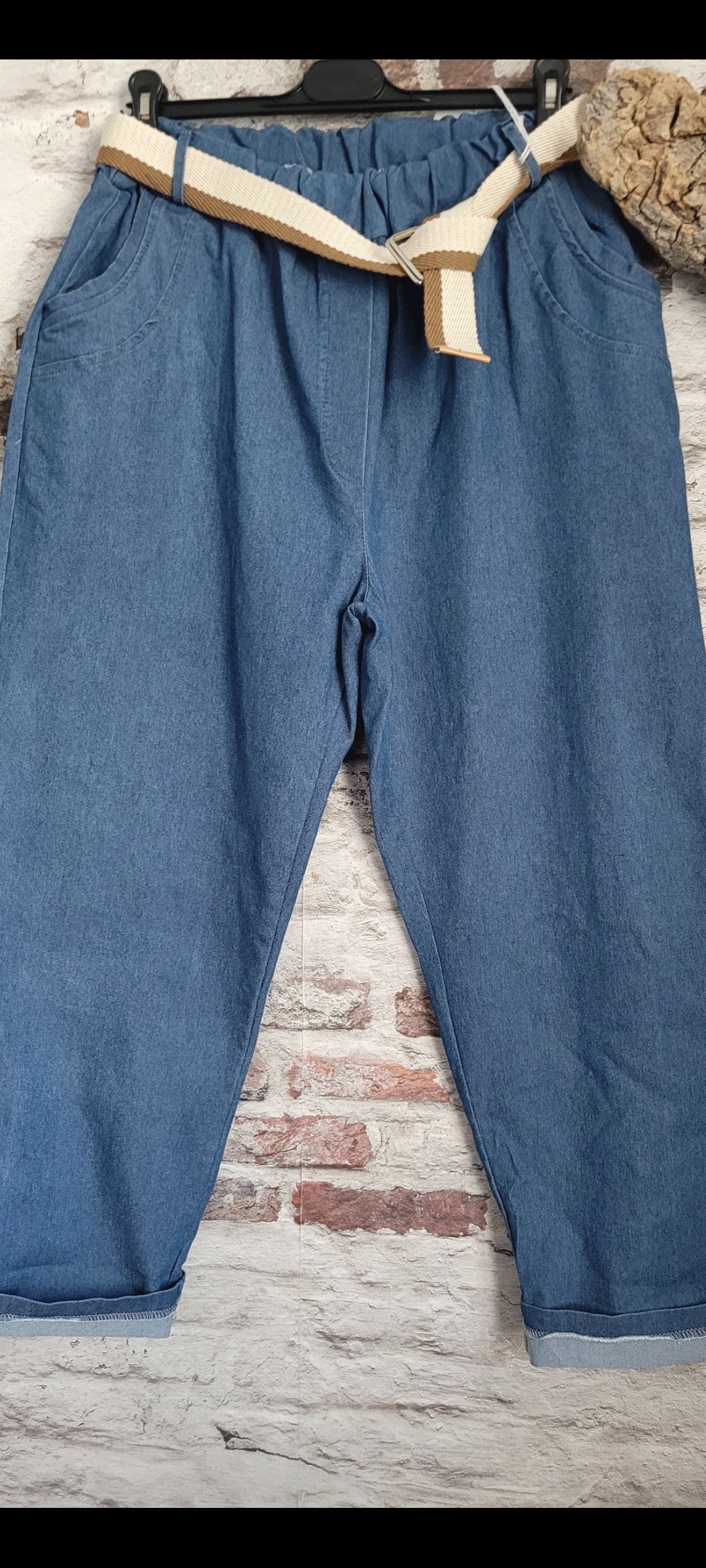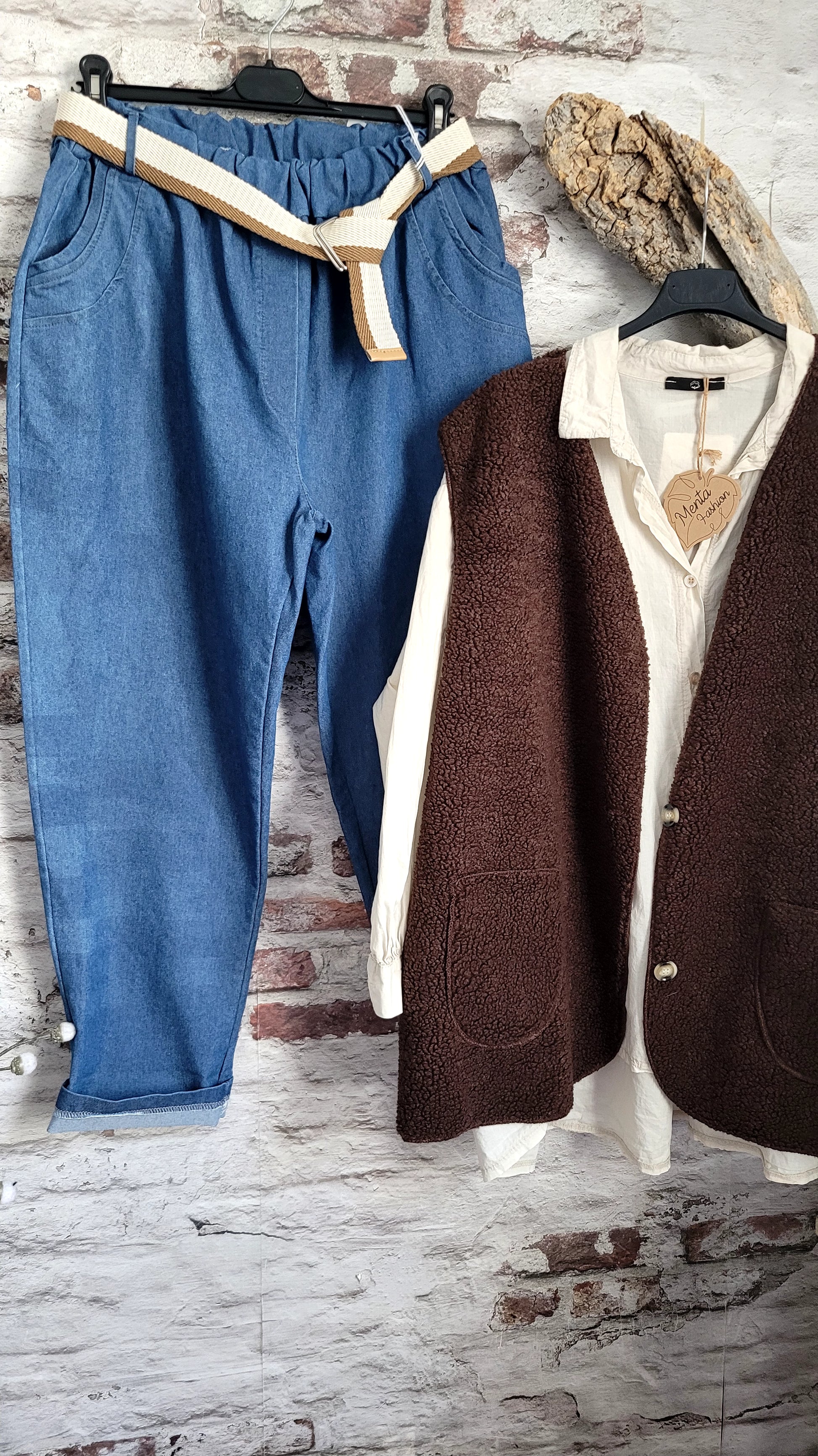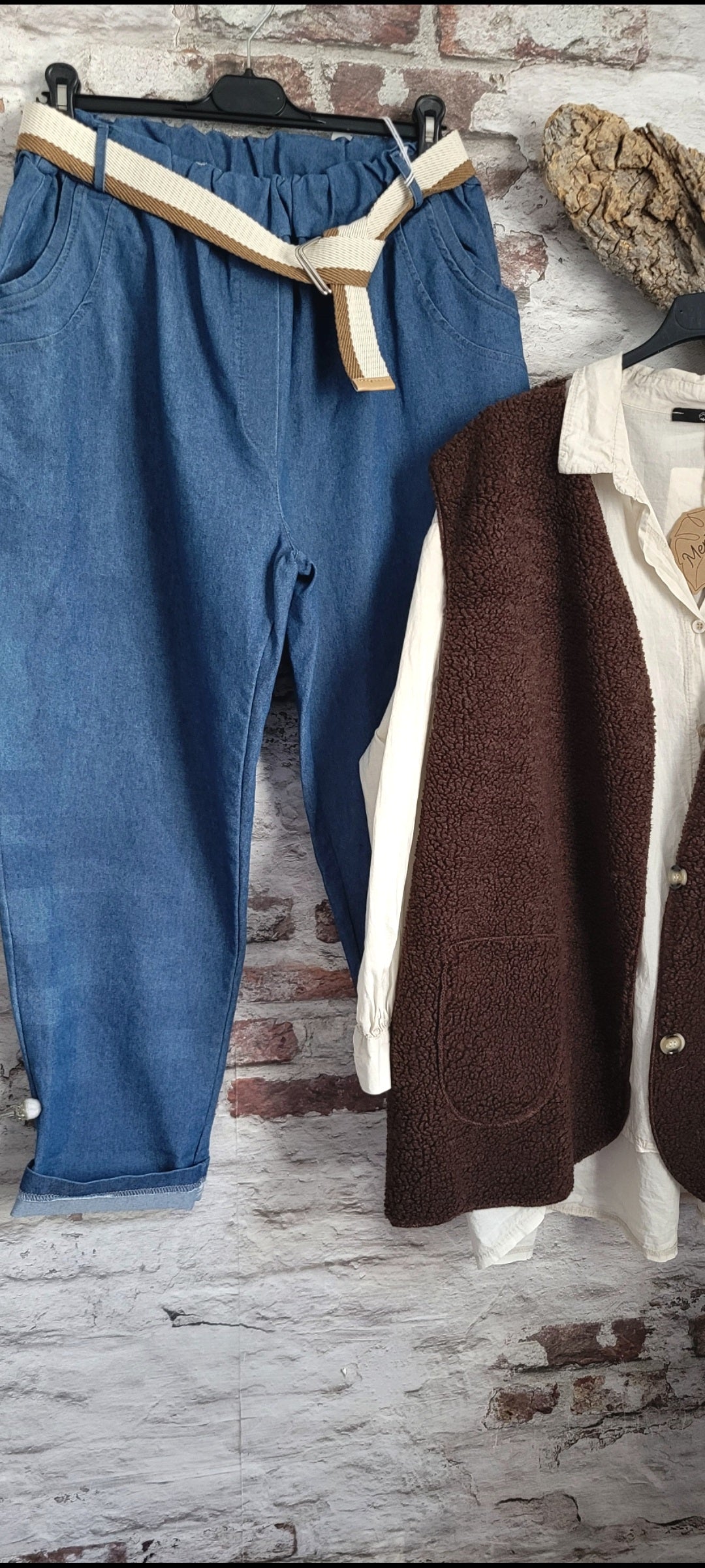 🥀 Jean grande taille denim stretch (élasthanne), coupe ample taille haute style paper bag avec élastique et ceinture en toile. Il possède deux poches latérales et des ourlets roulottés