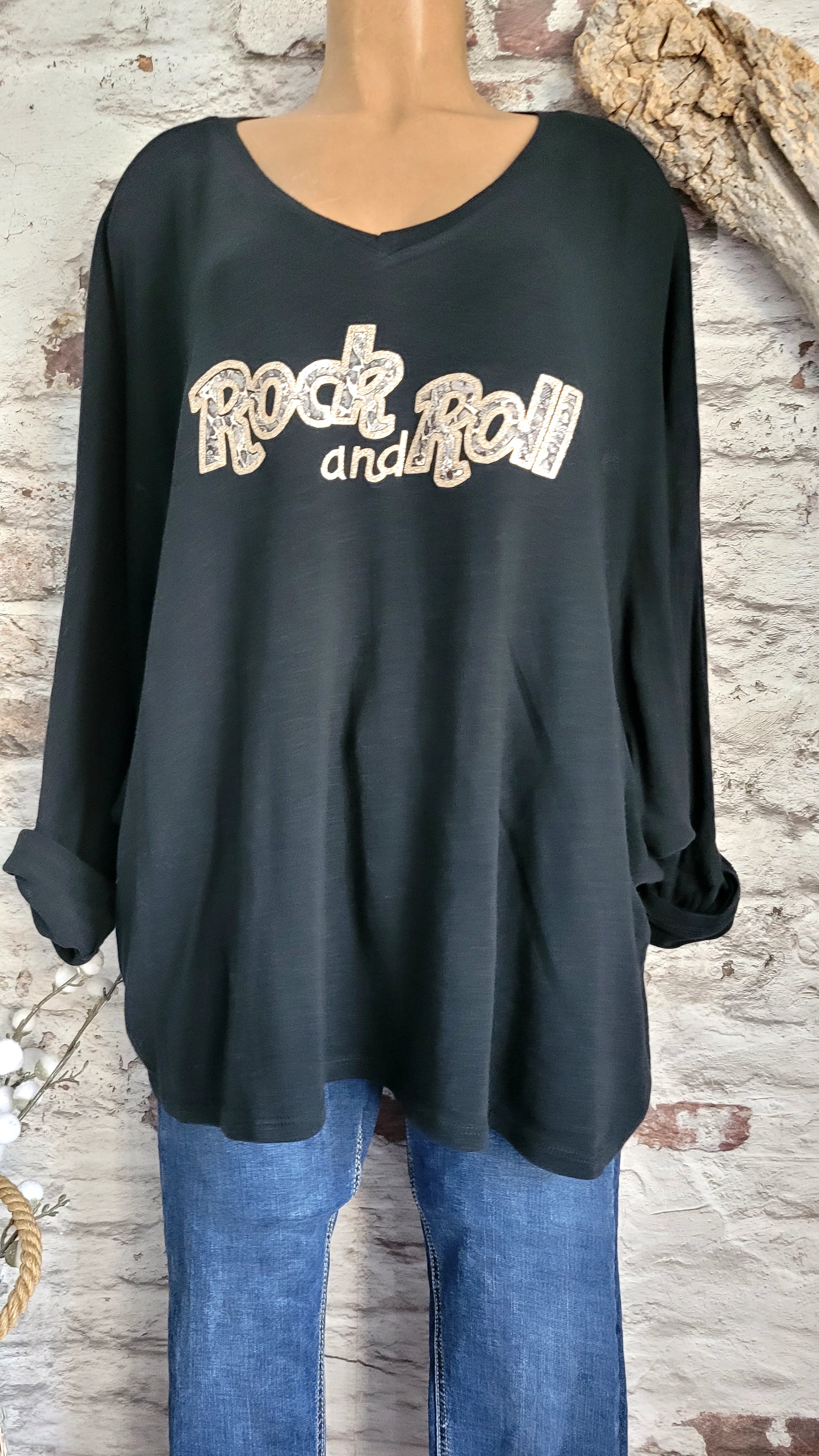 Sa coupe ample et décontractée est mise en valeur par l'inscription "Rock and Roll" avec un motif animalier (léopard) original et audacieux. Le col en V flatteur et les manches longues offrent un style décontracté chic parfait