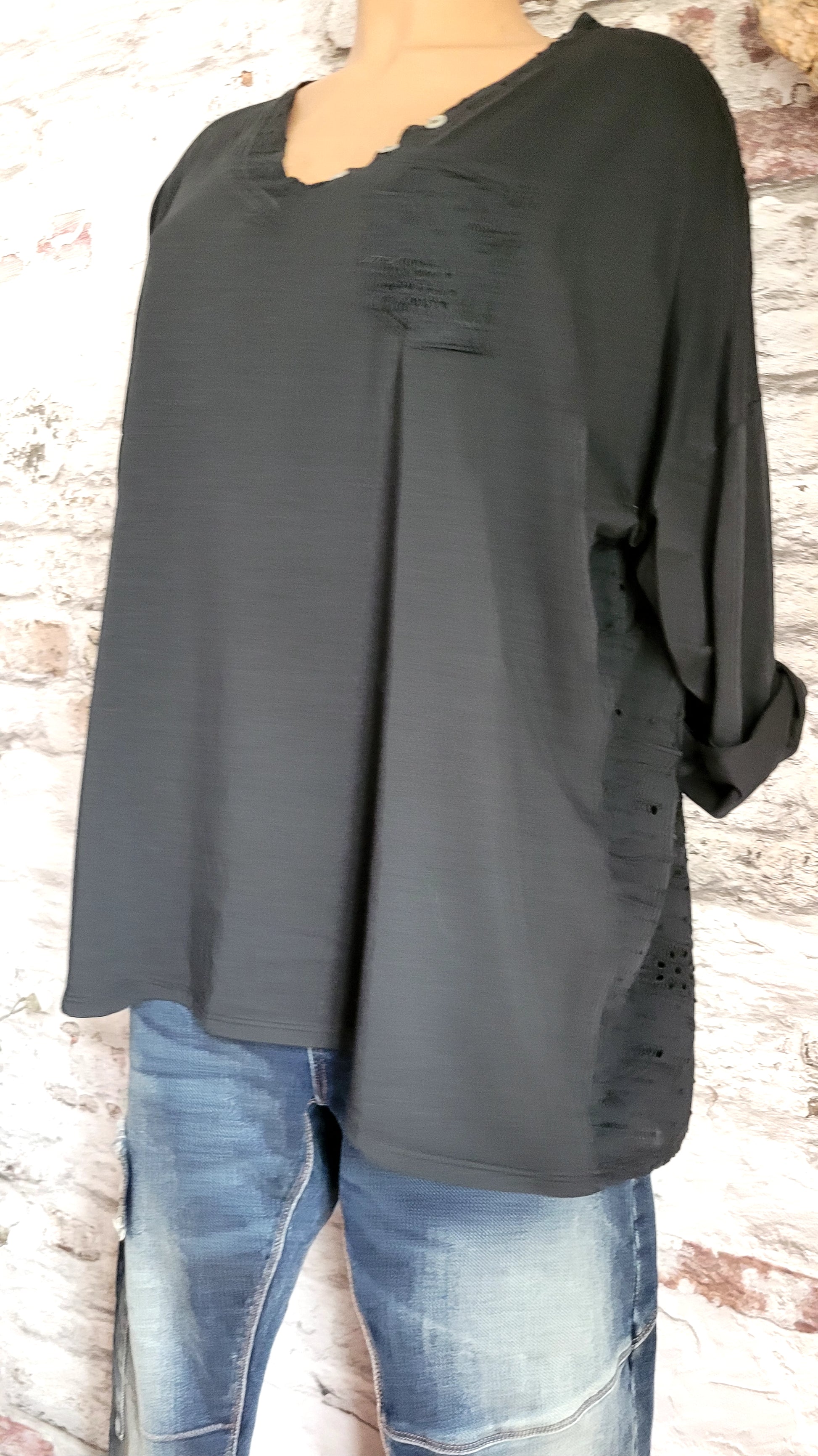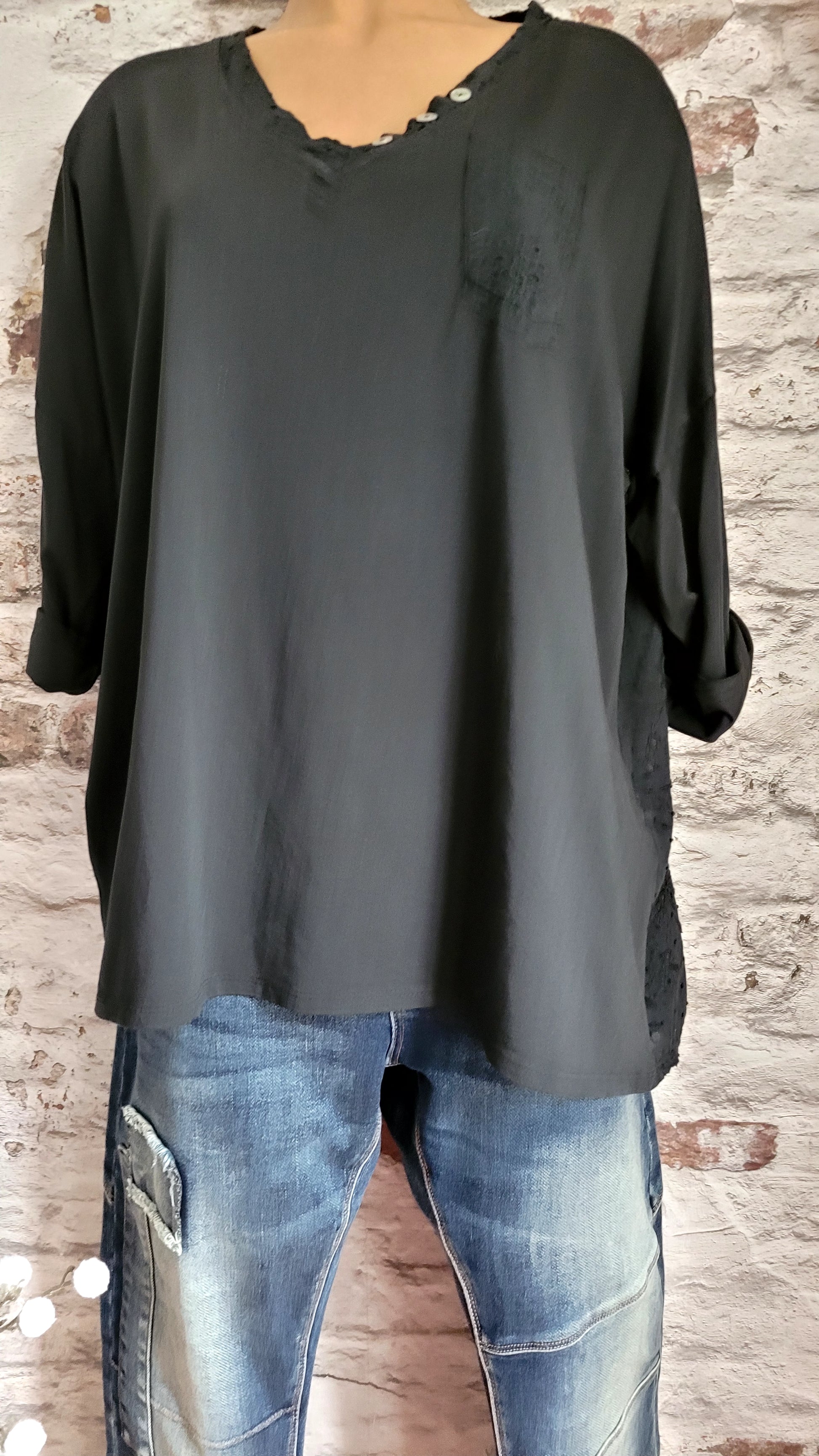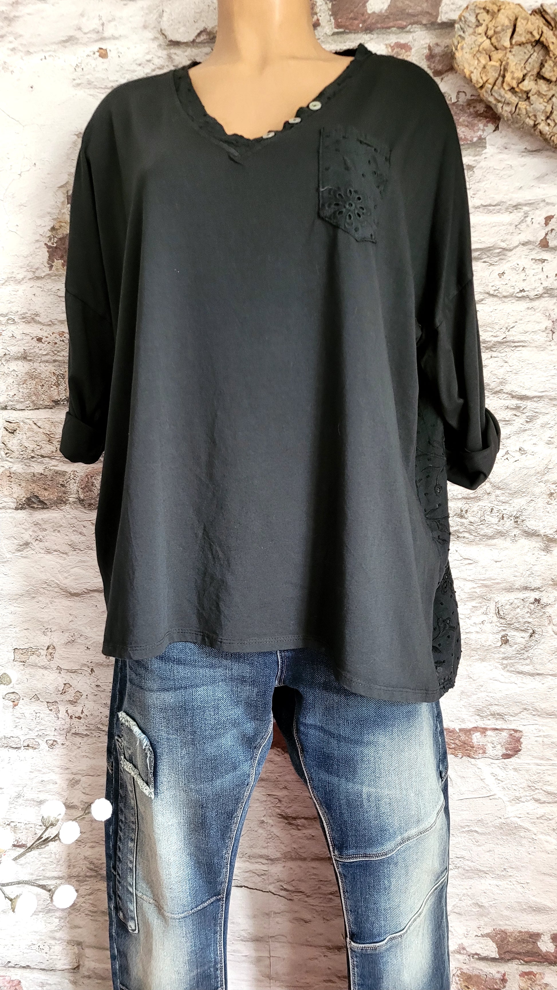 Ce modèle présente des détails raffinés : le dos et l'empiècement du col en V sont ornés d'une broderie ajourée délicate, tandis qu'une petite poche est brodée sur la poitrine. Les manches, à la fois longues et larges, ainsi que la coupe oversize, apportent une touche de modernité.