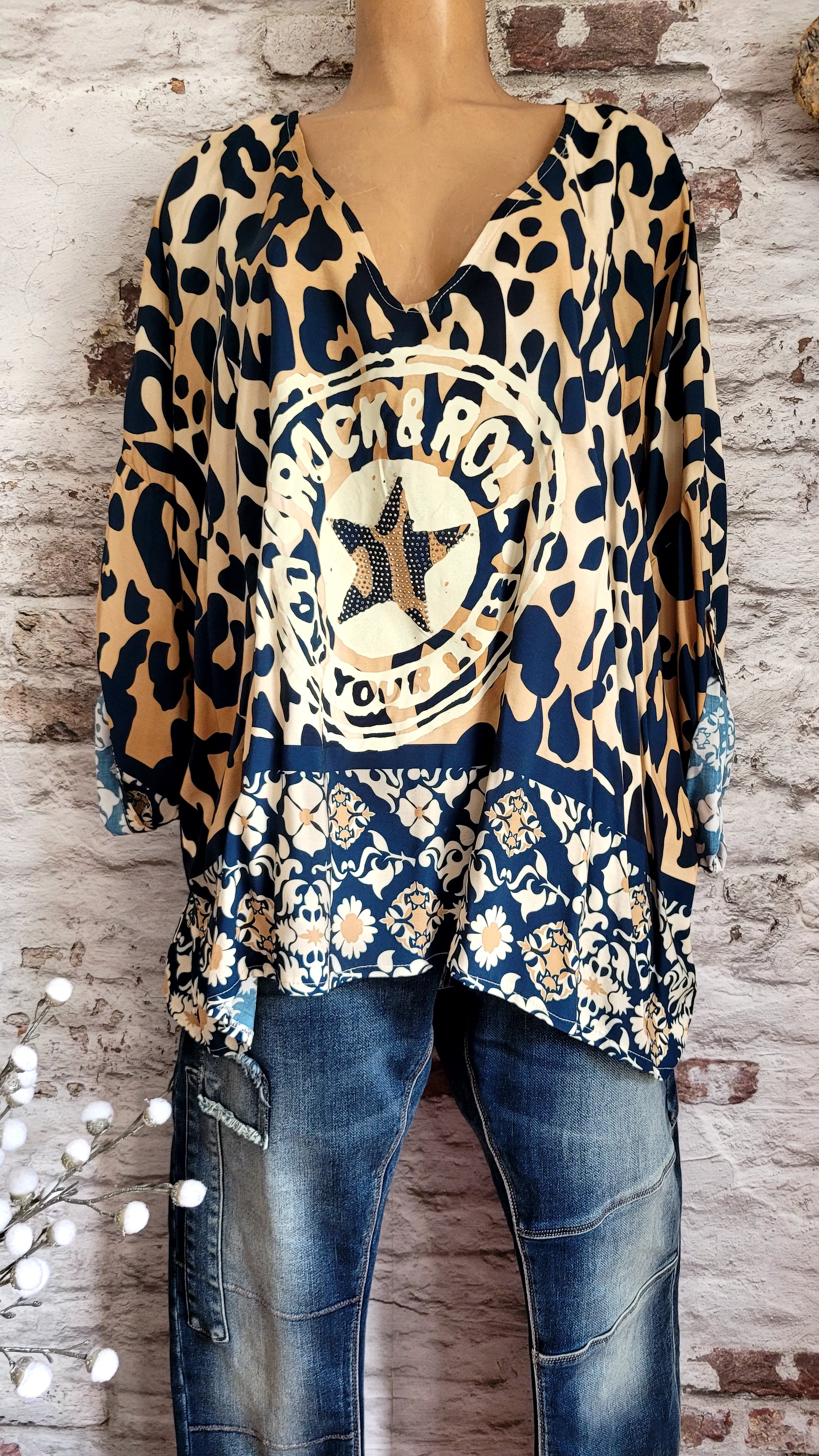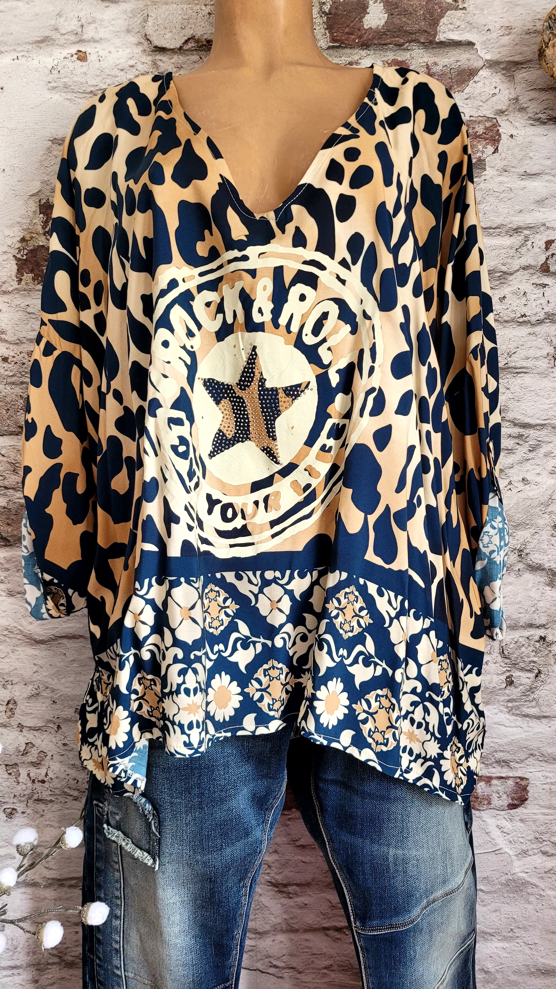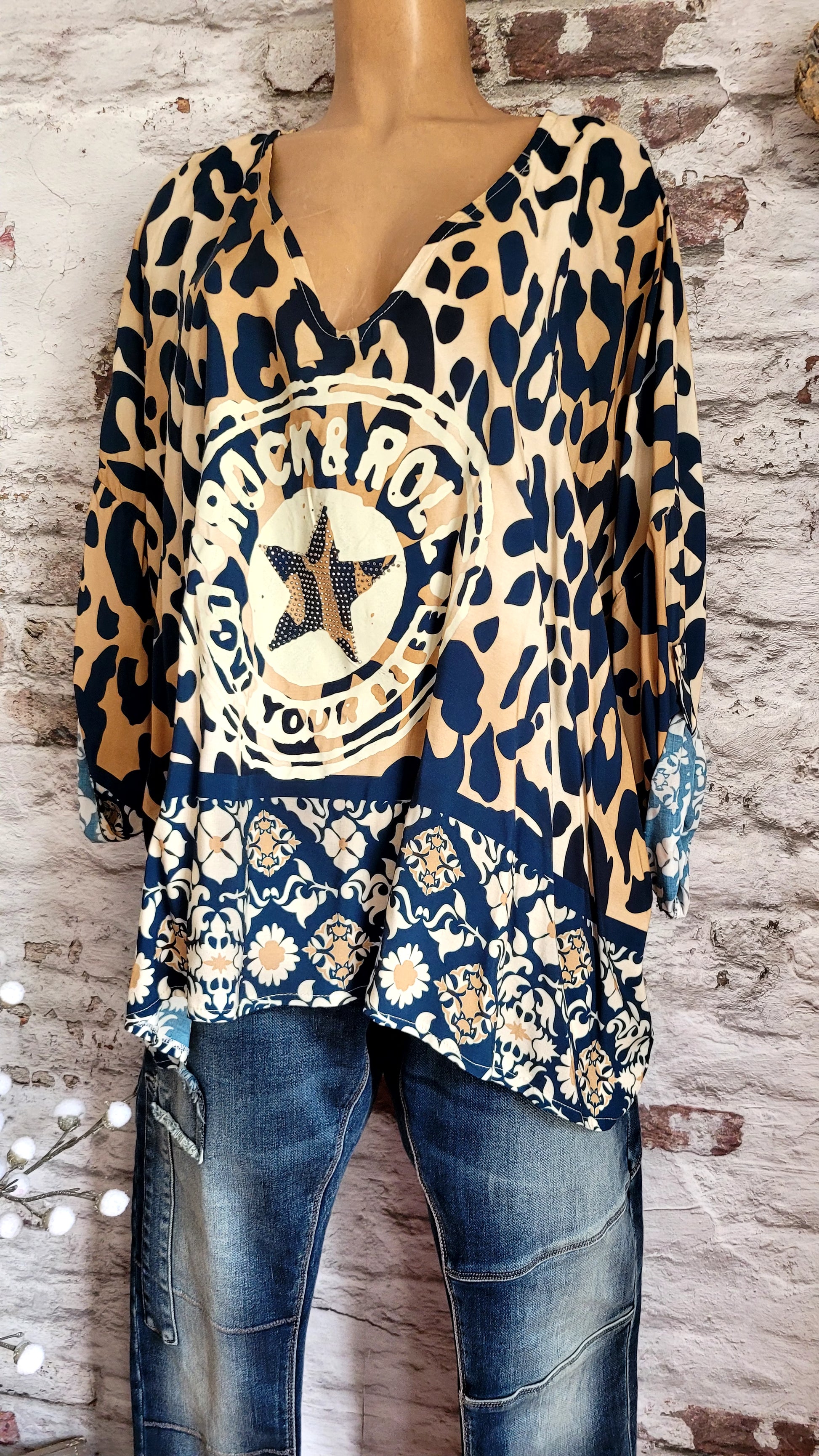 💙 tunique ample et légère est idéale pour un look décontracté et tendance. Elle se distingue par son imprimé léopard bleu et beige, rehaussé d'un grand motif circulaire orné d'une étoile scintillante. Le bas de la tunique et l'intérieur des manches présentent un motif différent, ajoutant une touche d'originalité. Facile à porter, elle s'accordera parfaitement avec un pantalon ou un jean uni.