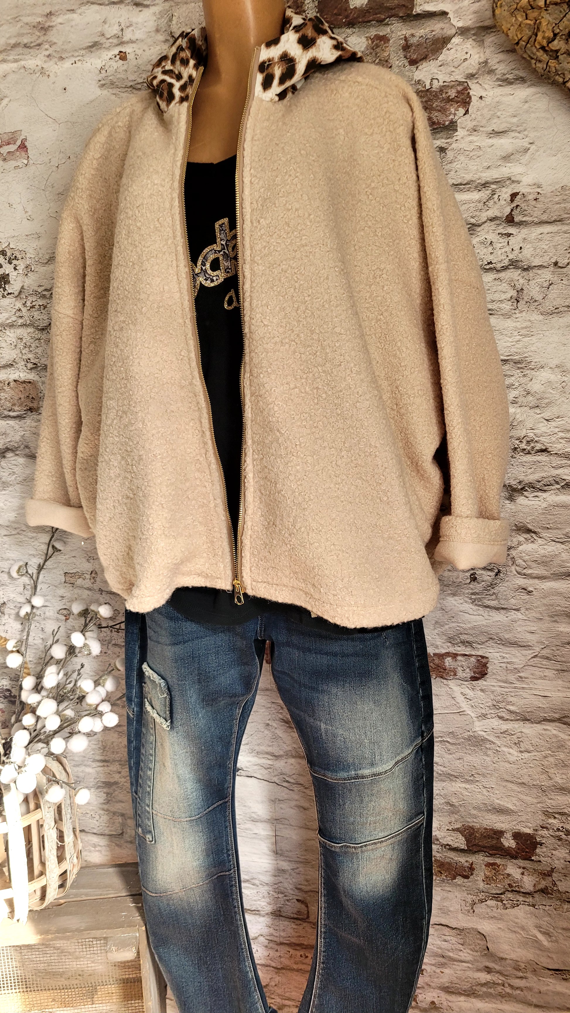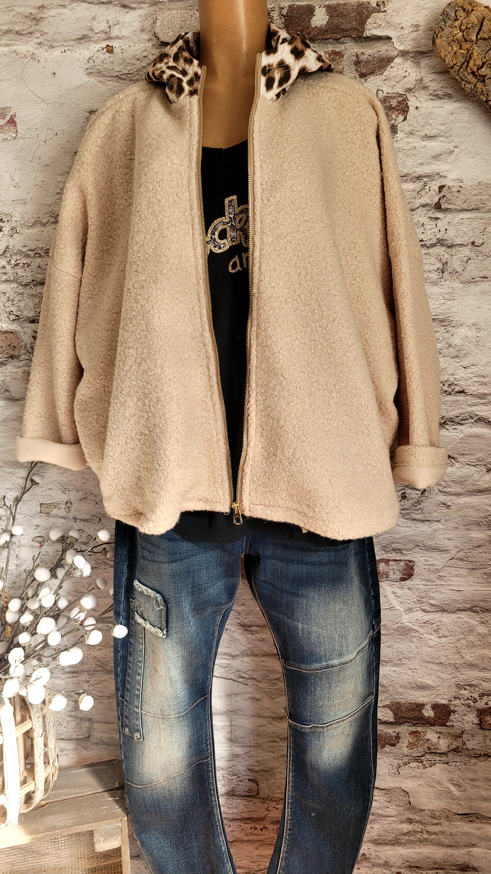 Craquez pour cette veste ample et stylée ! Confectionnée dans un tissu bouclé crème ultra-confortable, elle est rehaussée d'une capuche à l'imprimé léopard audacieux.