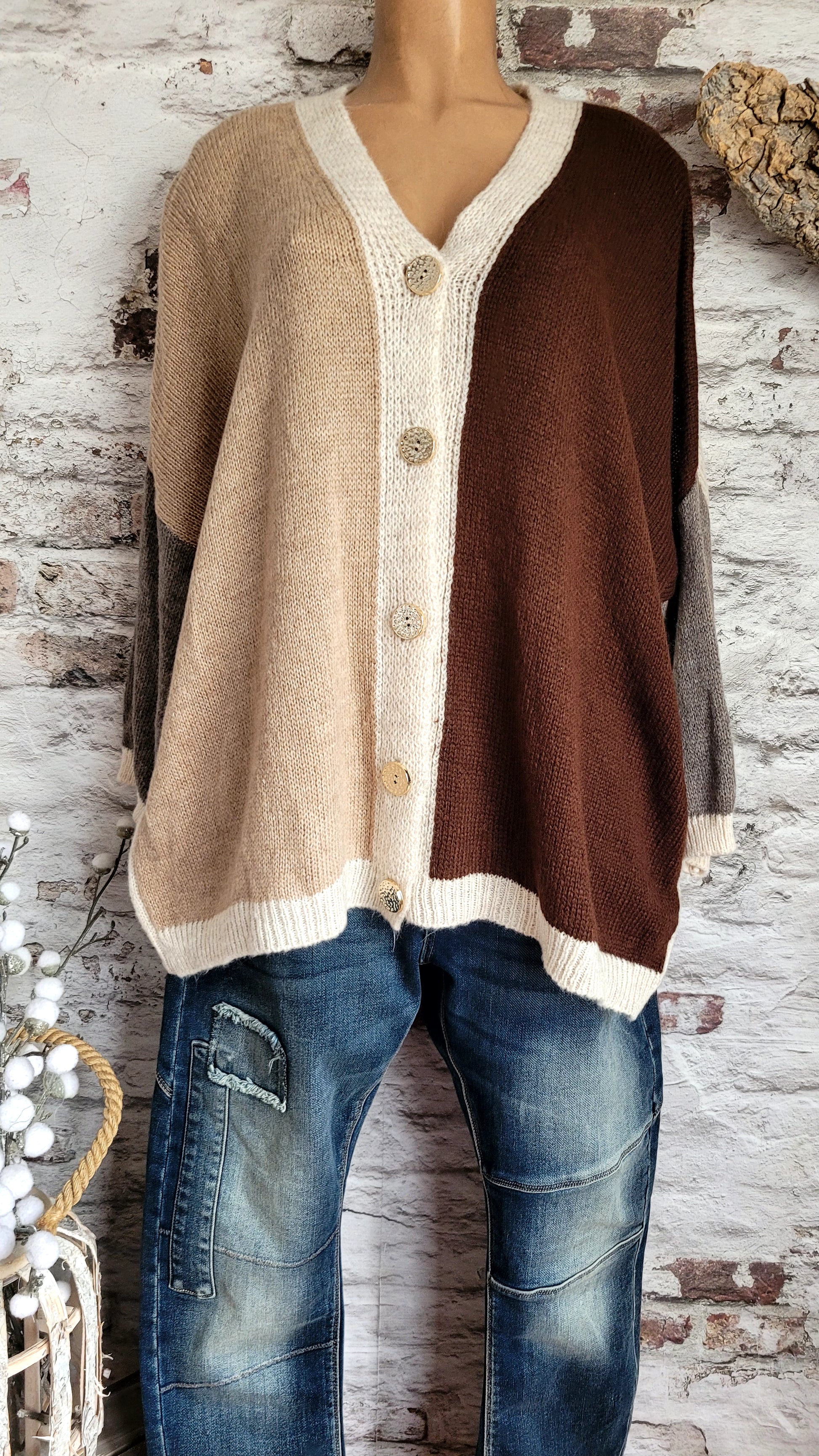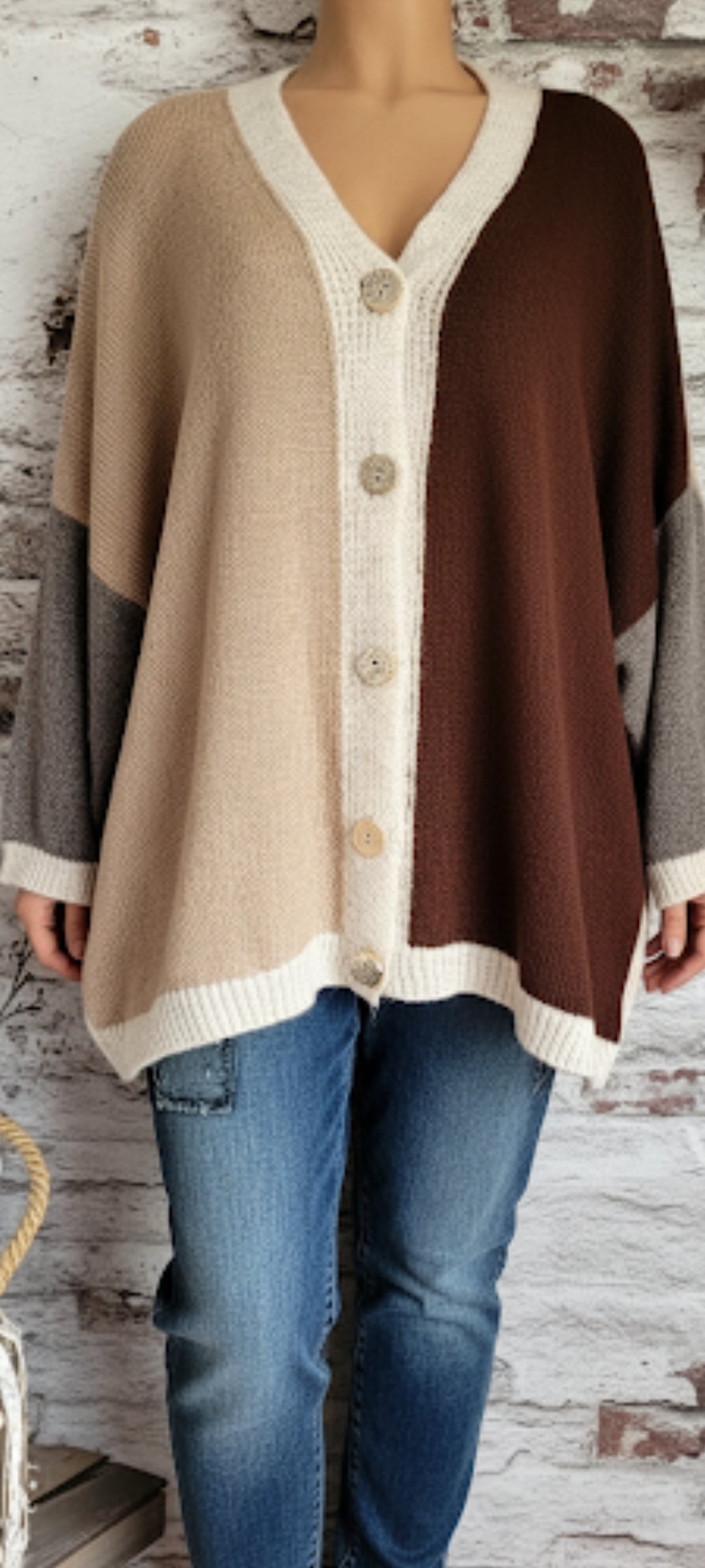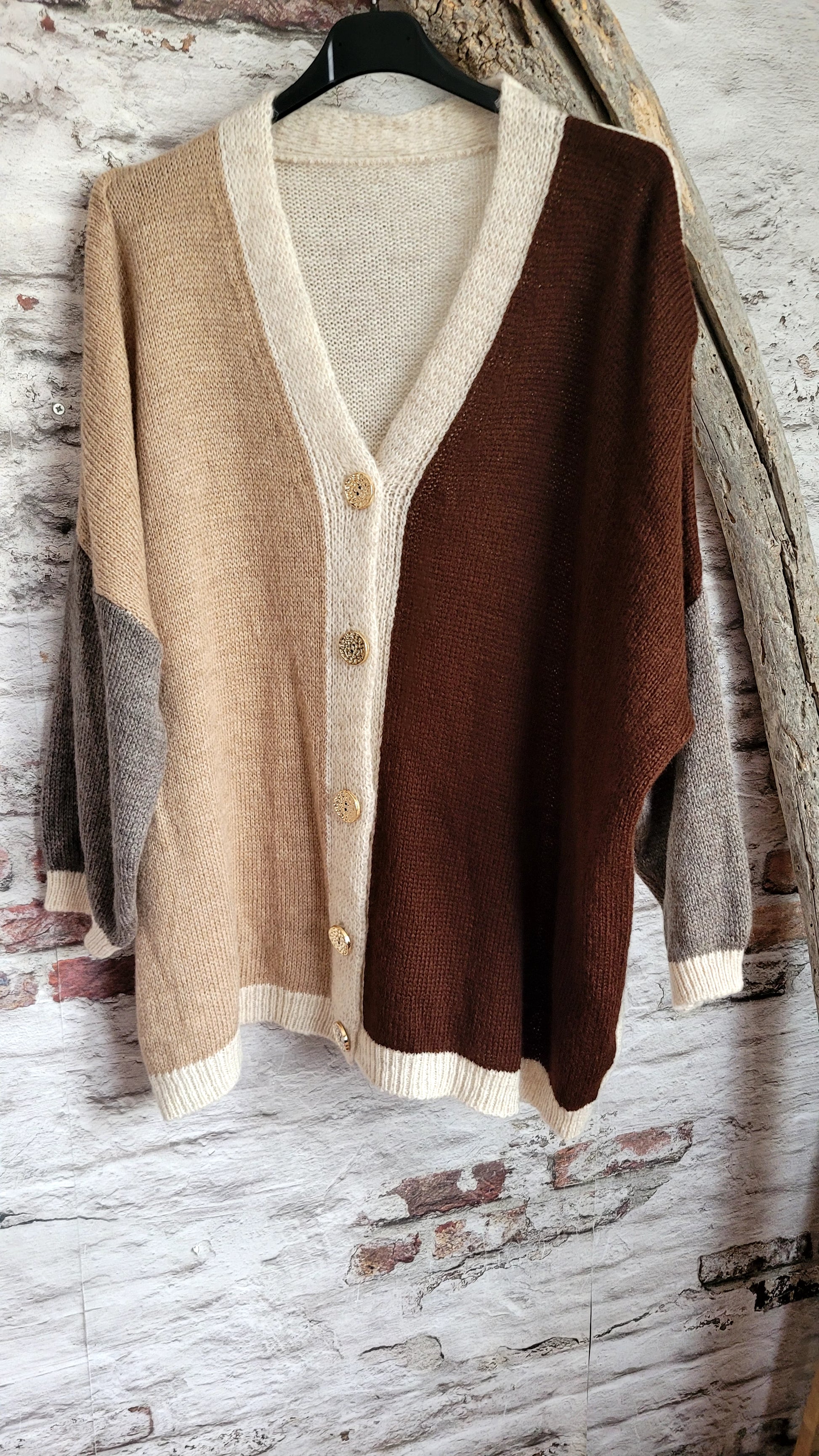 Ce cardigan en maille douce présente un design bicolore audacieux et moderne. Les manches, dans une teinte différente, ajoutent une touche d'originalité. Ses boutons dorés apportent une finition élégante et lumineuse. C'est une pièce parfaite pour rehausser une tenue simple avec style