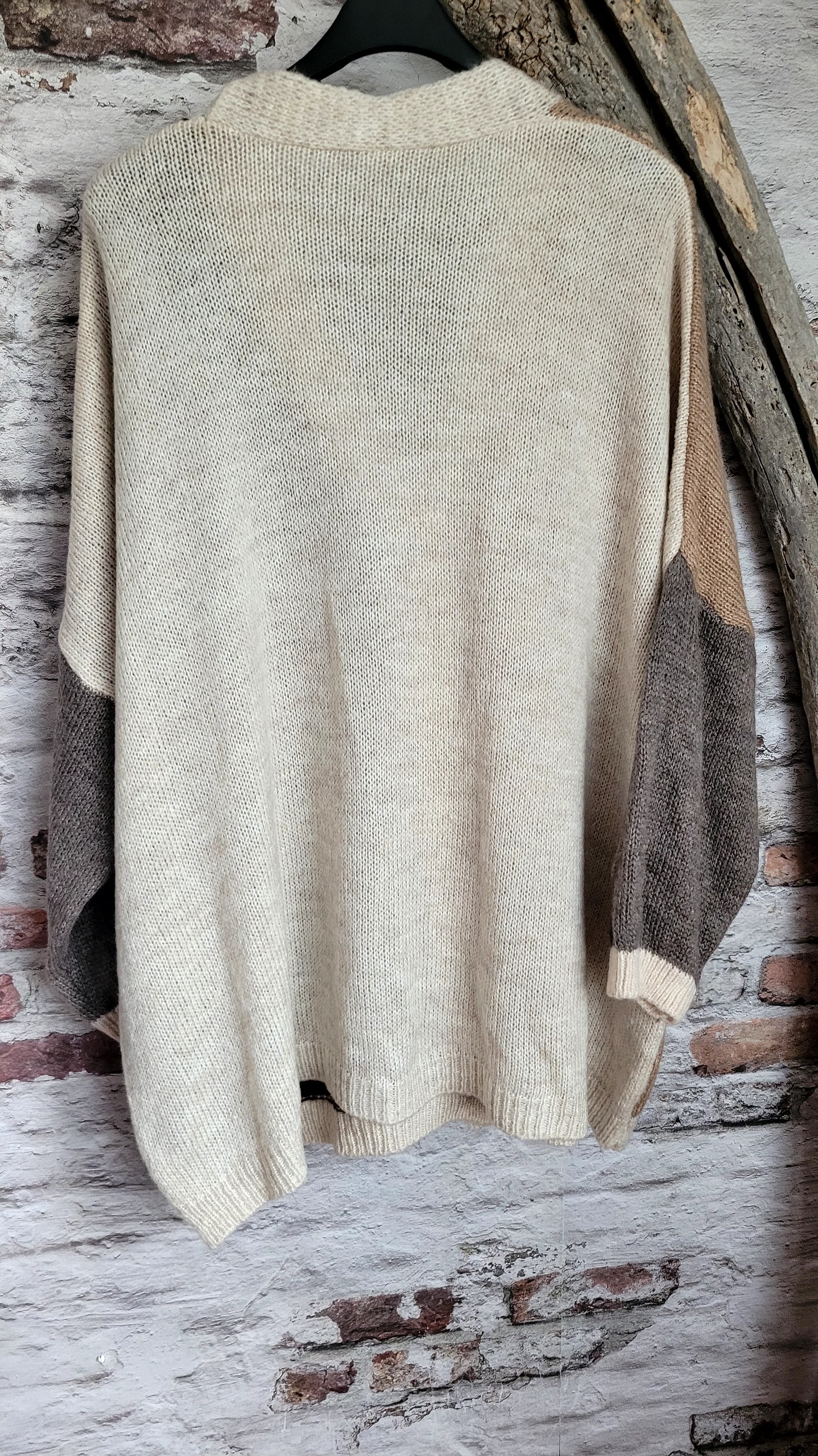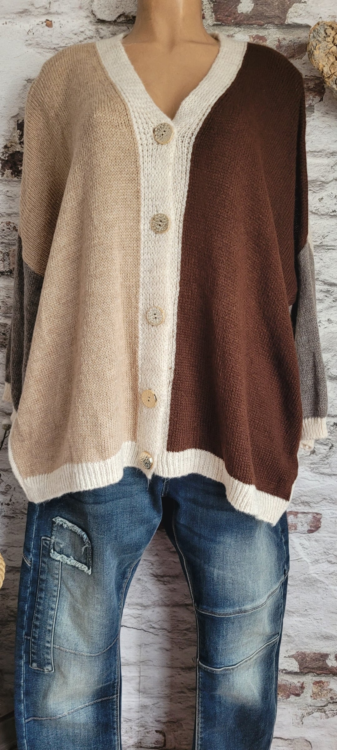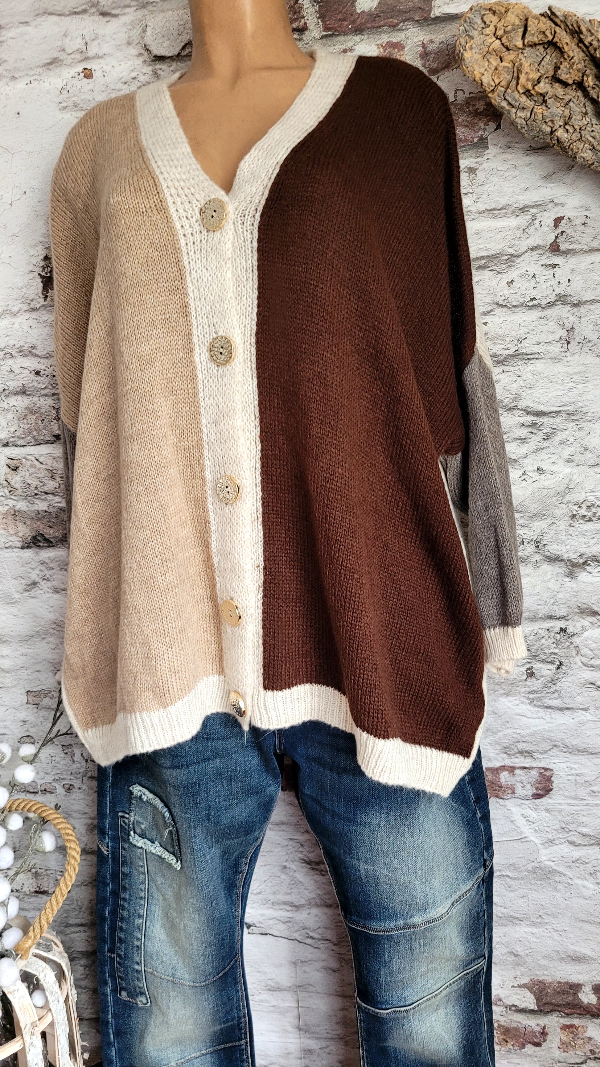 Ce cardigan en maille douce présente un design bicolore audacieux et moderne. Les manches, dans une teinte différente, ajoutent une touche d'originalité. Ses boutons dorés apportent une finition élégante et lumineuse. C'est une pièce parfaite pour rehausser une tenue simple avec style