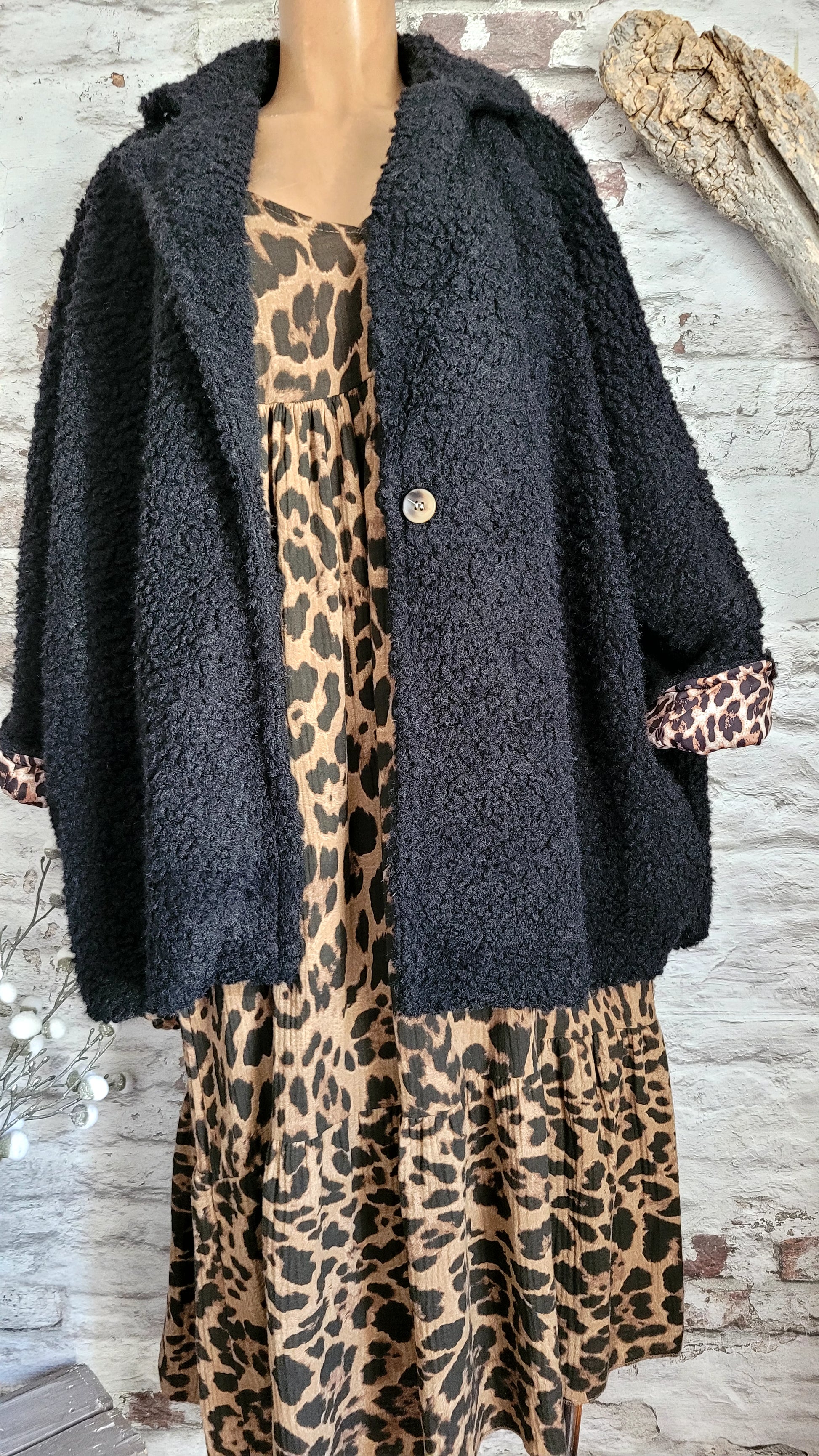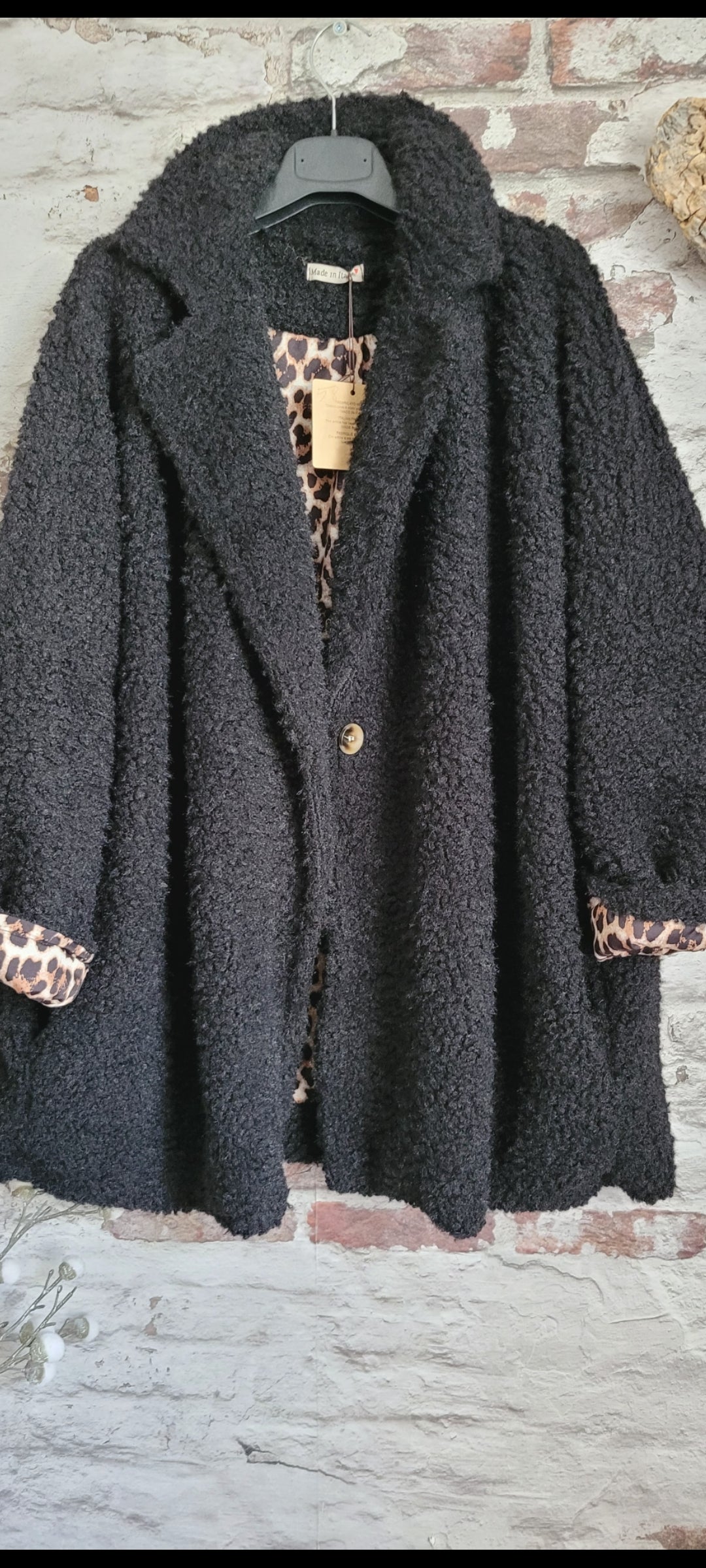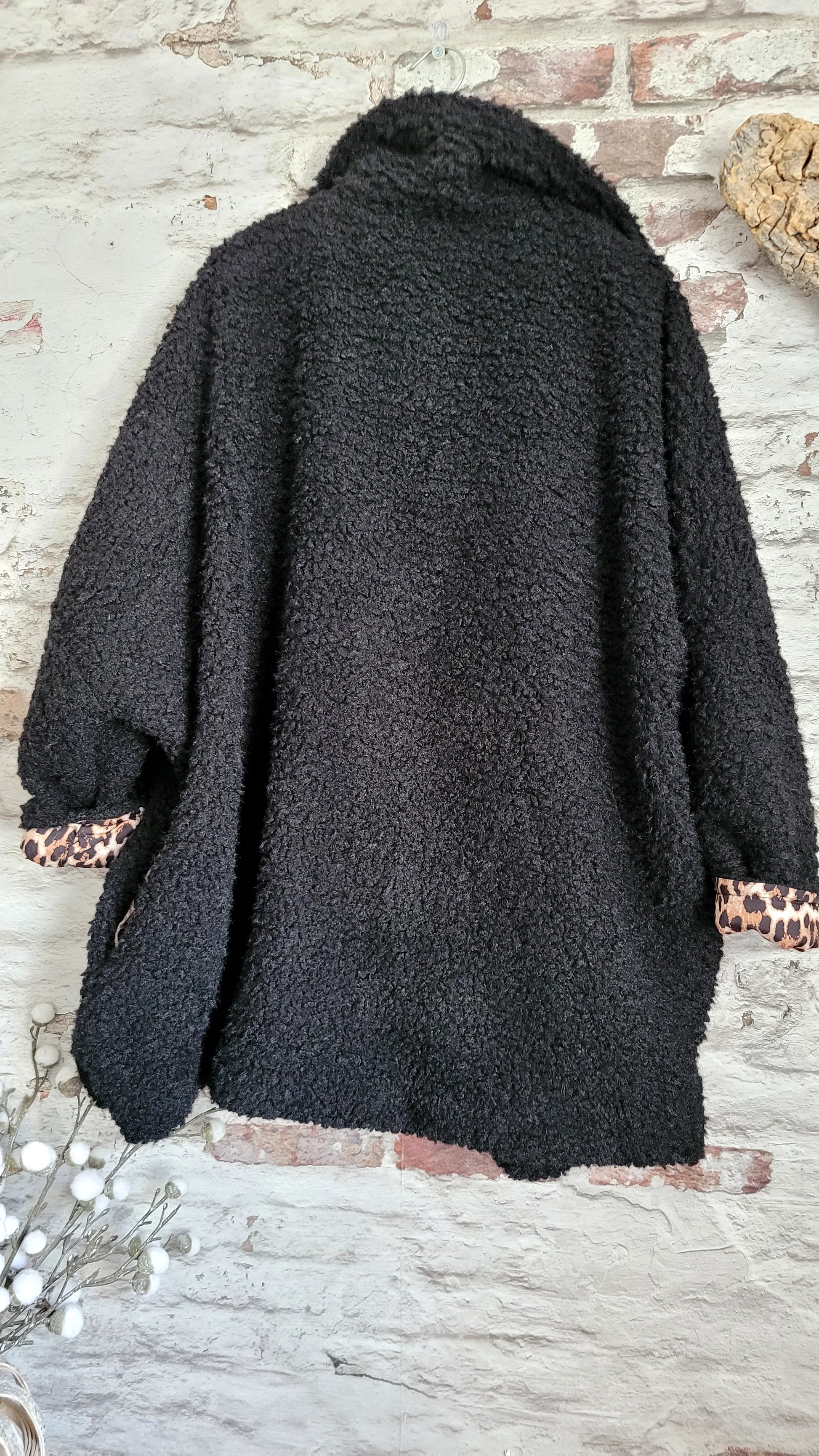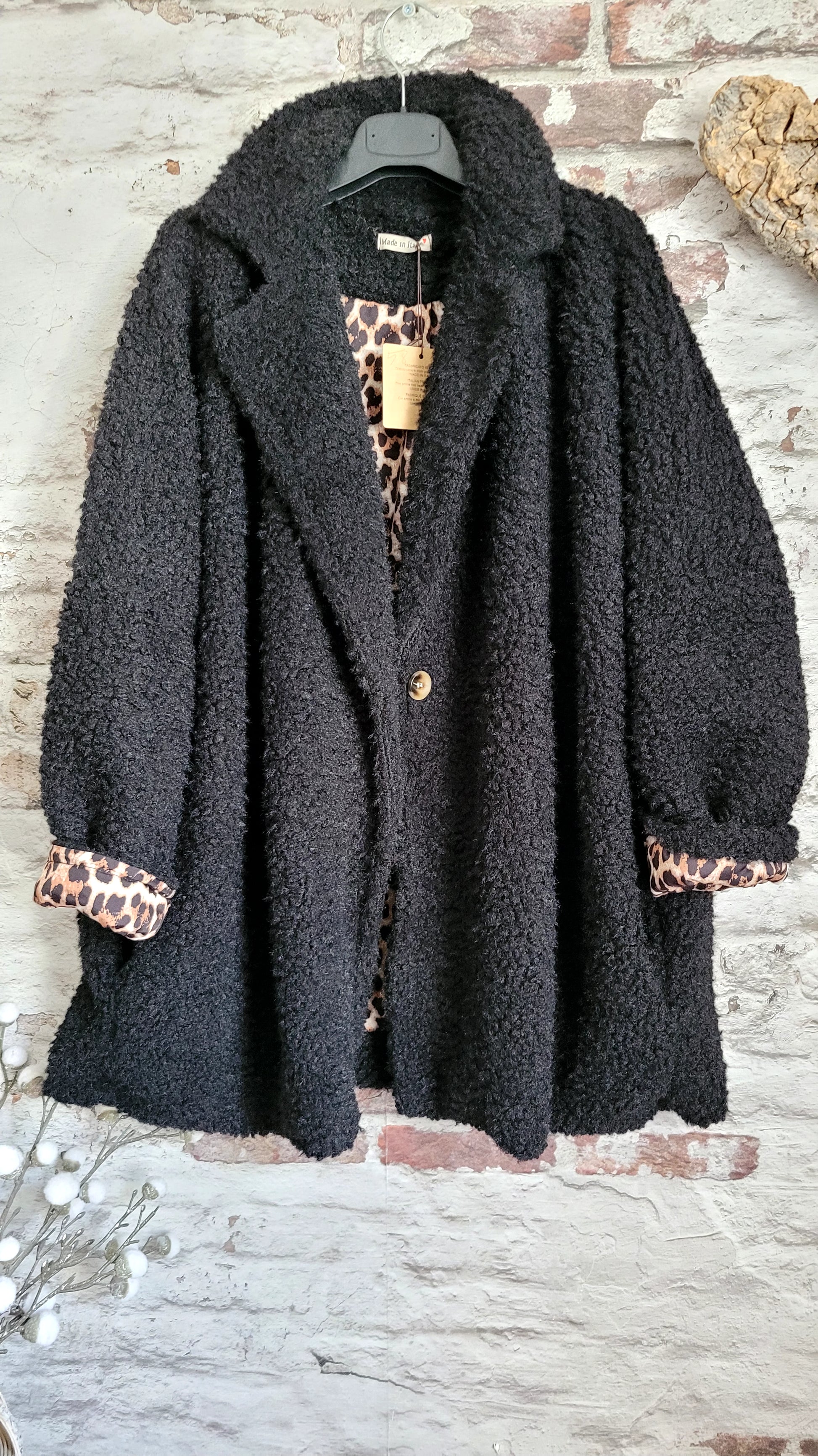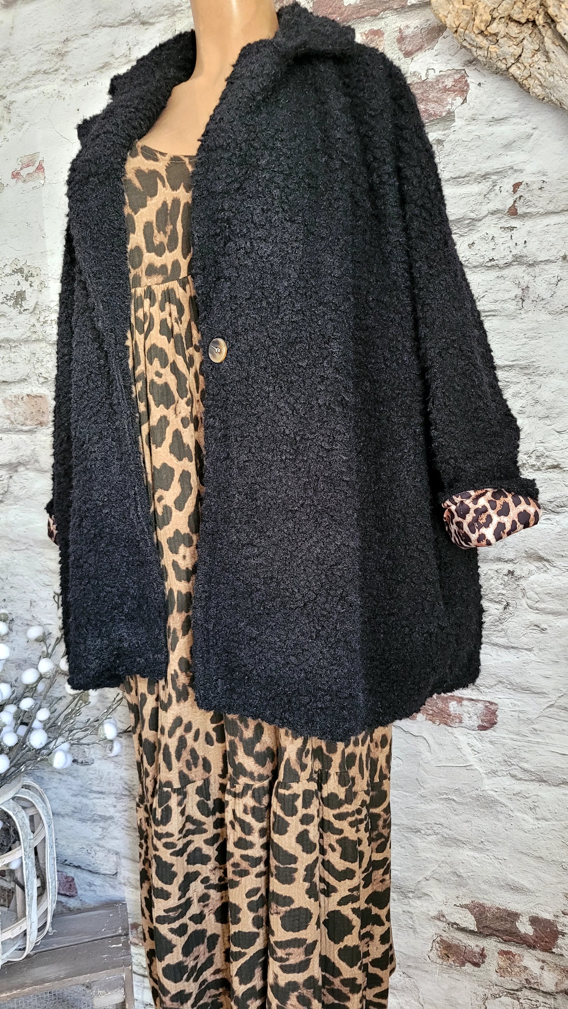 "Veste en moumoute noire, coupe ample et mi-longue. Ultra-douce et chaude, elle arbore un élégant détail léopard sur les revers et la doublure. Deux poches latérales pratiques. L'alliance parfaite du confort et du style."