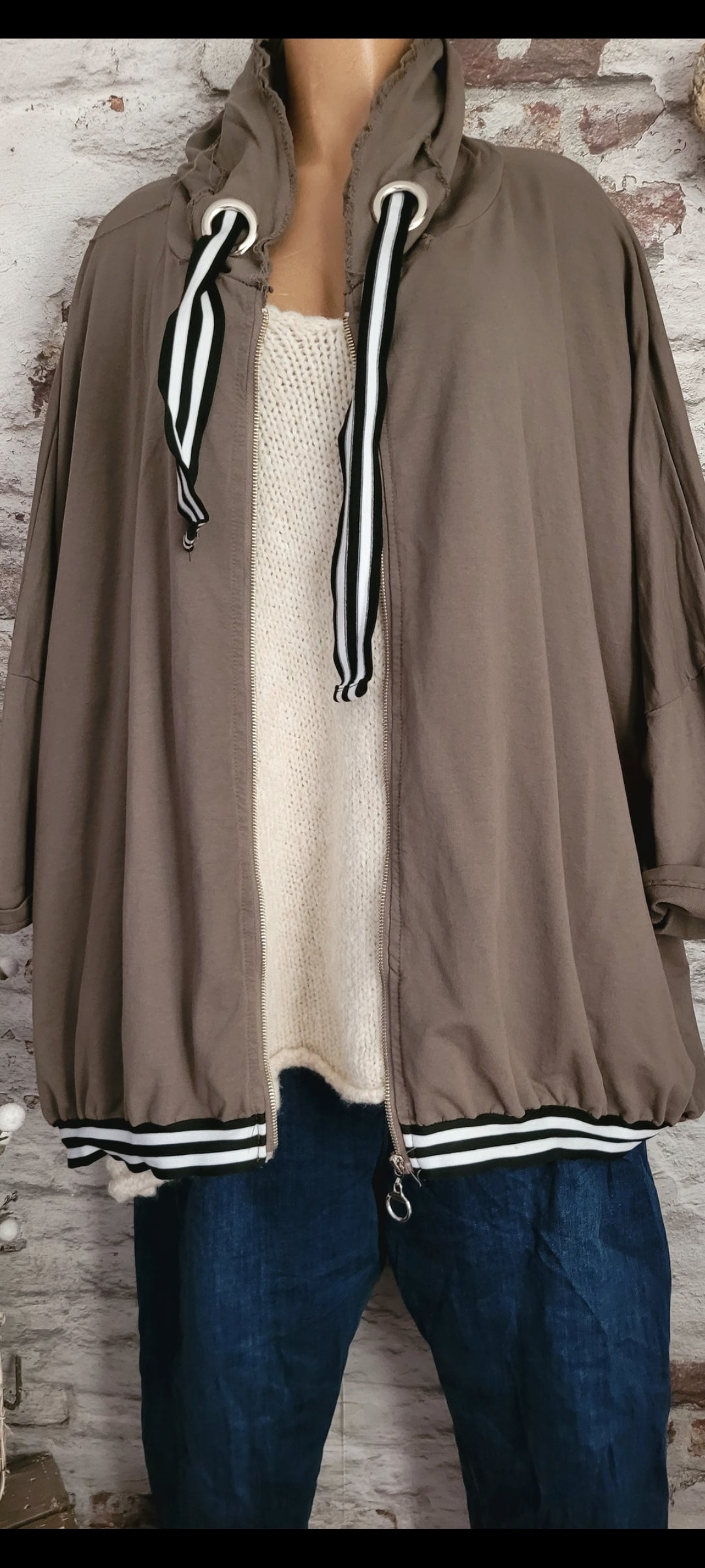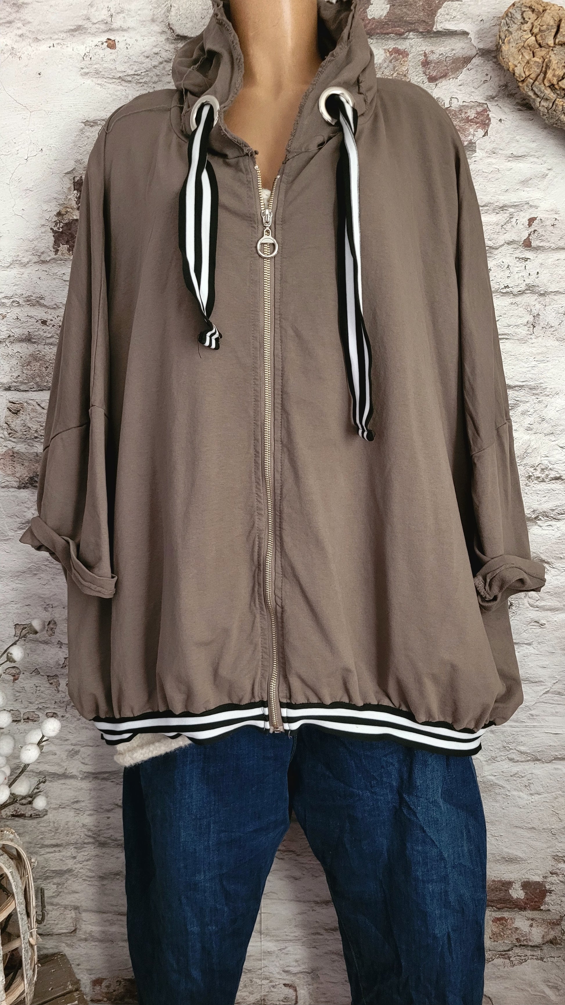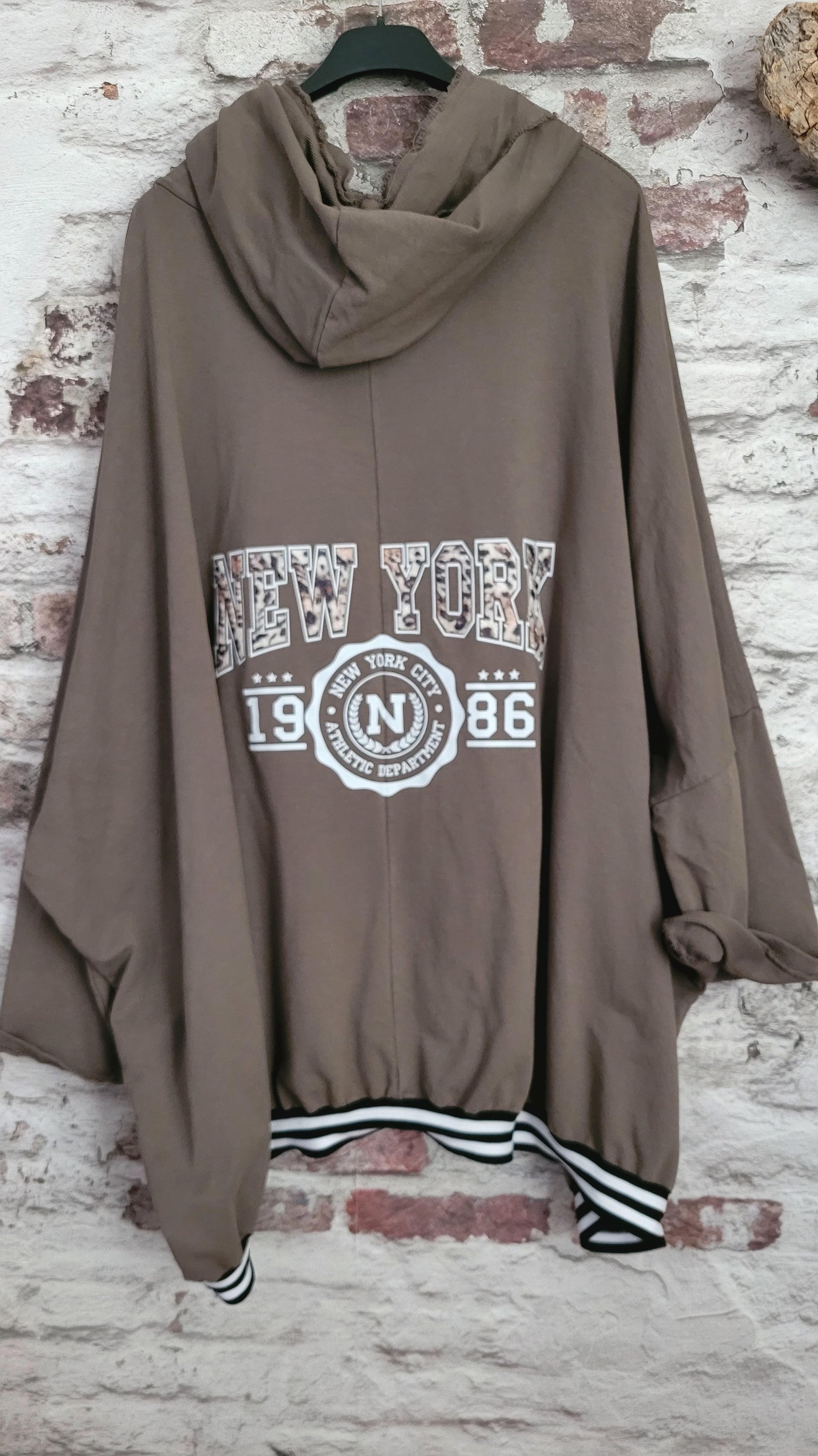 🥀 Veste sweat oversize à capuche, couleur taupe. Fermeture zippée à l’avant avec cordons contrastés noir et blanc. Ourlet à rayures élastiqué pour une touche sport. Inscription "NEW YORK 1986" au dos. Style décontracté, confortable et tendance.